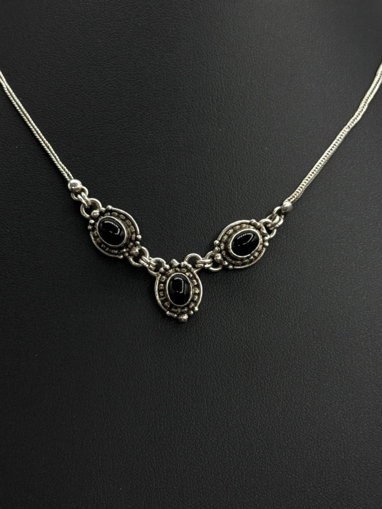 This is an elegant sterling silver necklace with three oval black onyx stones set in detailed bezels. The necklace has a delicate chain and is perfect for adding a touch of classic style to any outfit.