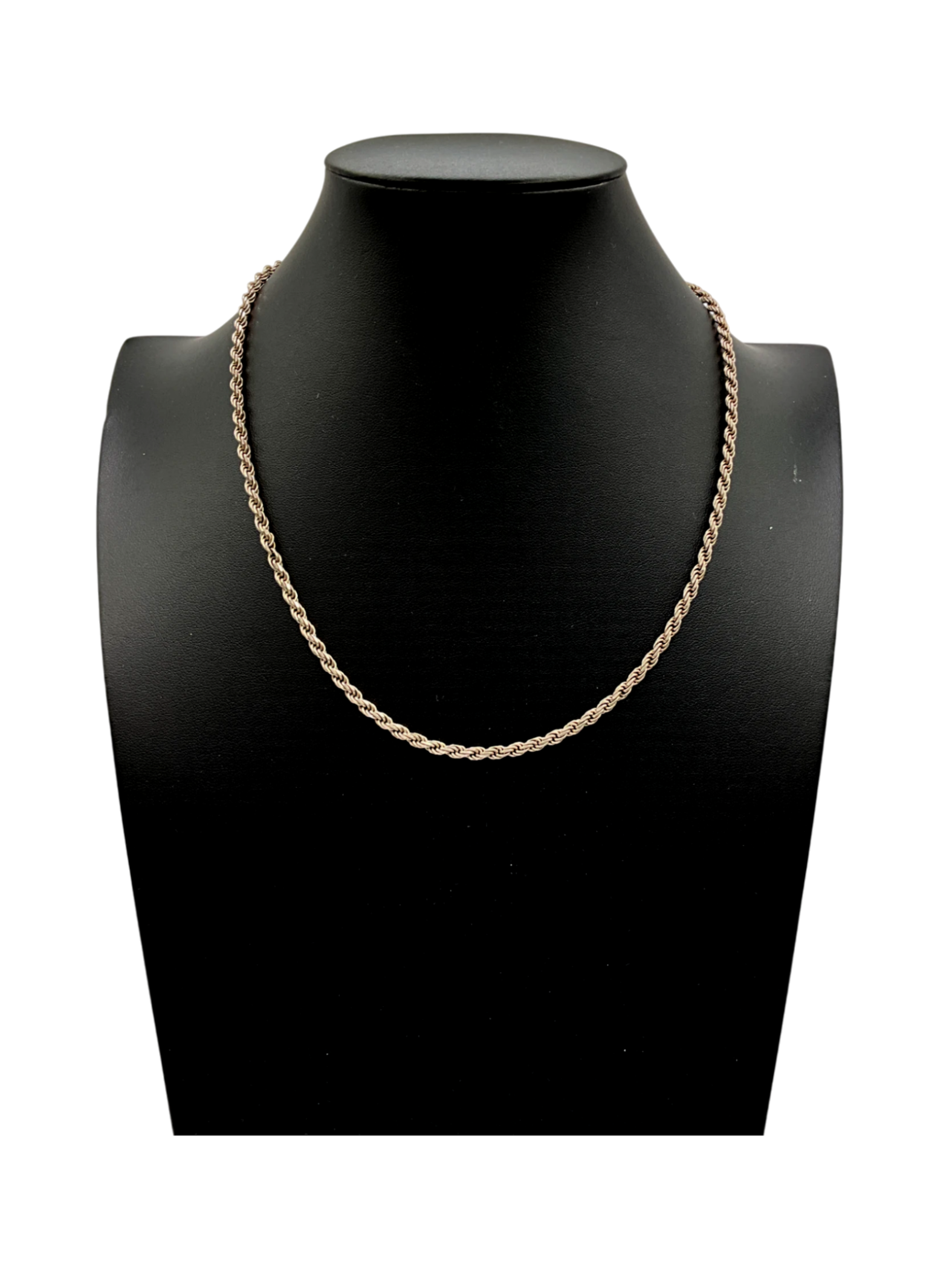 A necklace made of sterling silver with a rope chain design, marked 925, and 19 inches in length.