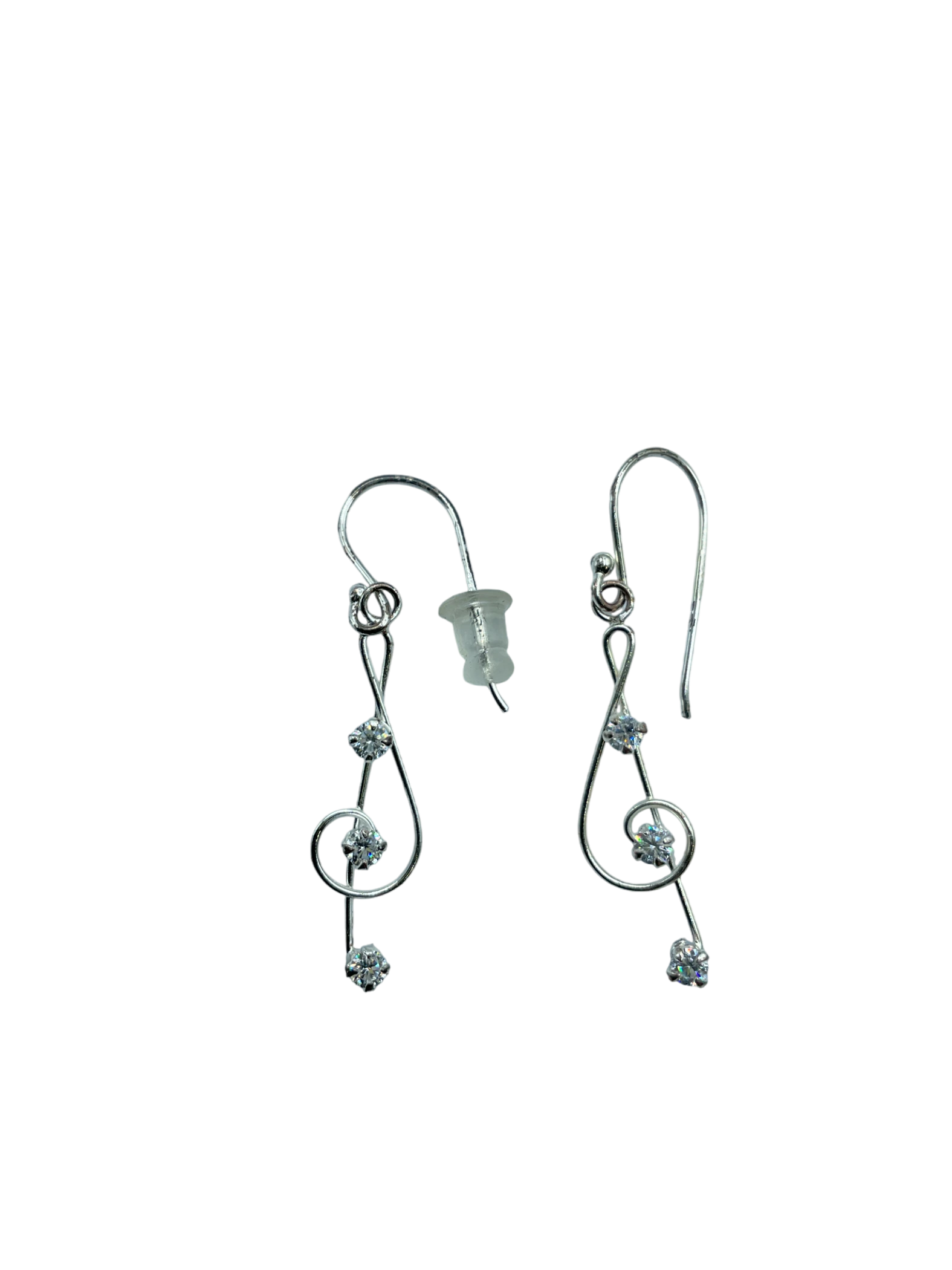 These elegant drop earrings are designed with a delicate treble clef motif made from 925 sterling silver. Each earring is decorated with three sparkling cubic zirconia stones, which add a touch of glamour. The earrings are equipped with hook closures and are lightweight and comfortable to wear.