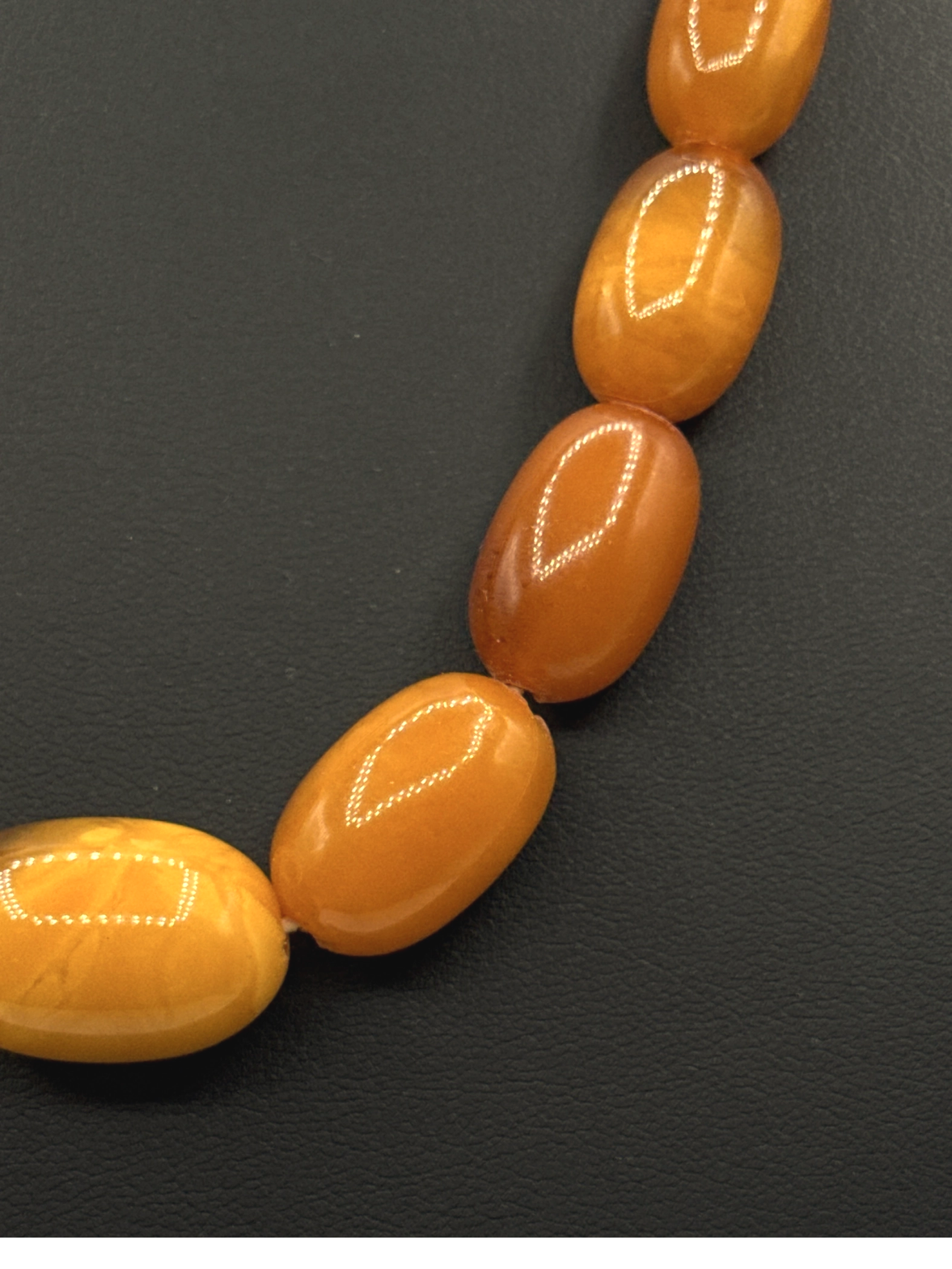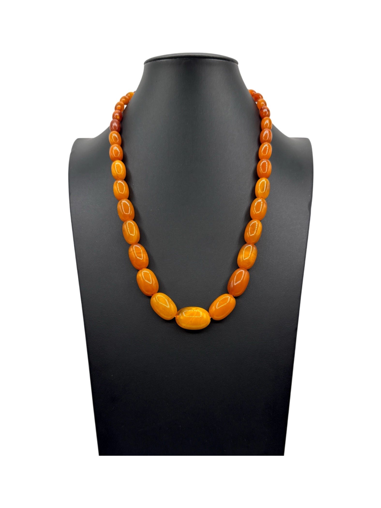 This beautiful second-hand necklace features a stunning bronze color with large oval-shaped beads. This necklace is perfect for adding a touch of vintage elegance to any outfit. The beads are strung together to form a chain. This versatile piece would make a great addition to any jewelry collection. It is a unique accessory. A perfect gift for any occasion. It is a statement piece that will add a touch of class to any outfit.