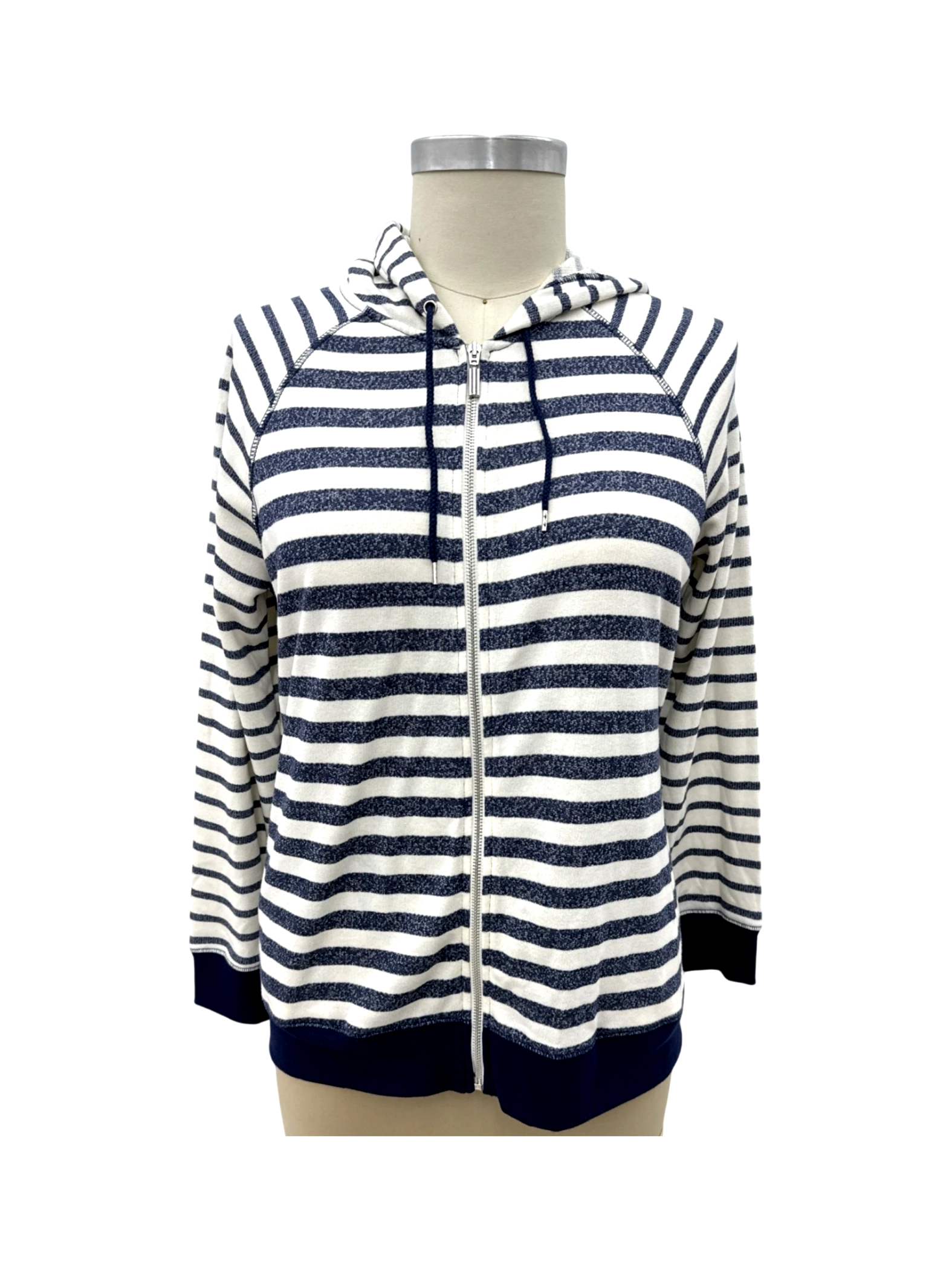 This pre-owned Style & Co. Sport striped hoodie is perfect for layering during the cooler seasons. It features a classic striped pattern with a full zipper closure and a comfortable hood. Made with a soft blend of polyester, rayon, and cotton, this hoodie offers both style and comfort. Great for everyday casual wear, this versatile piece is a must-have addition to any wardrobe.