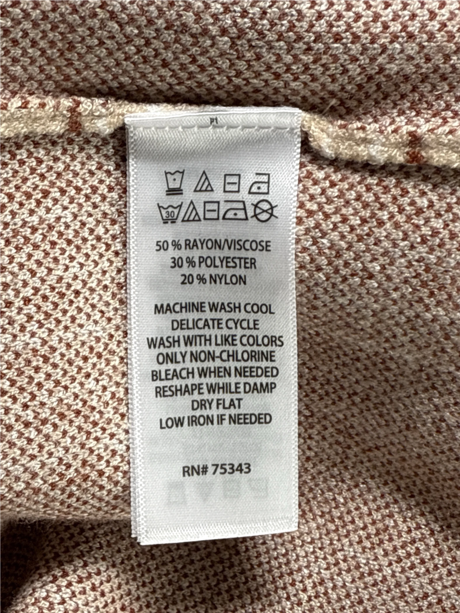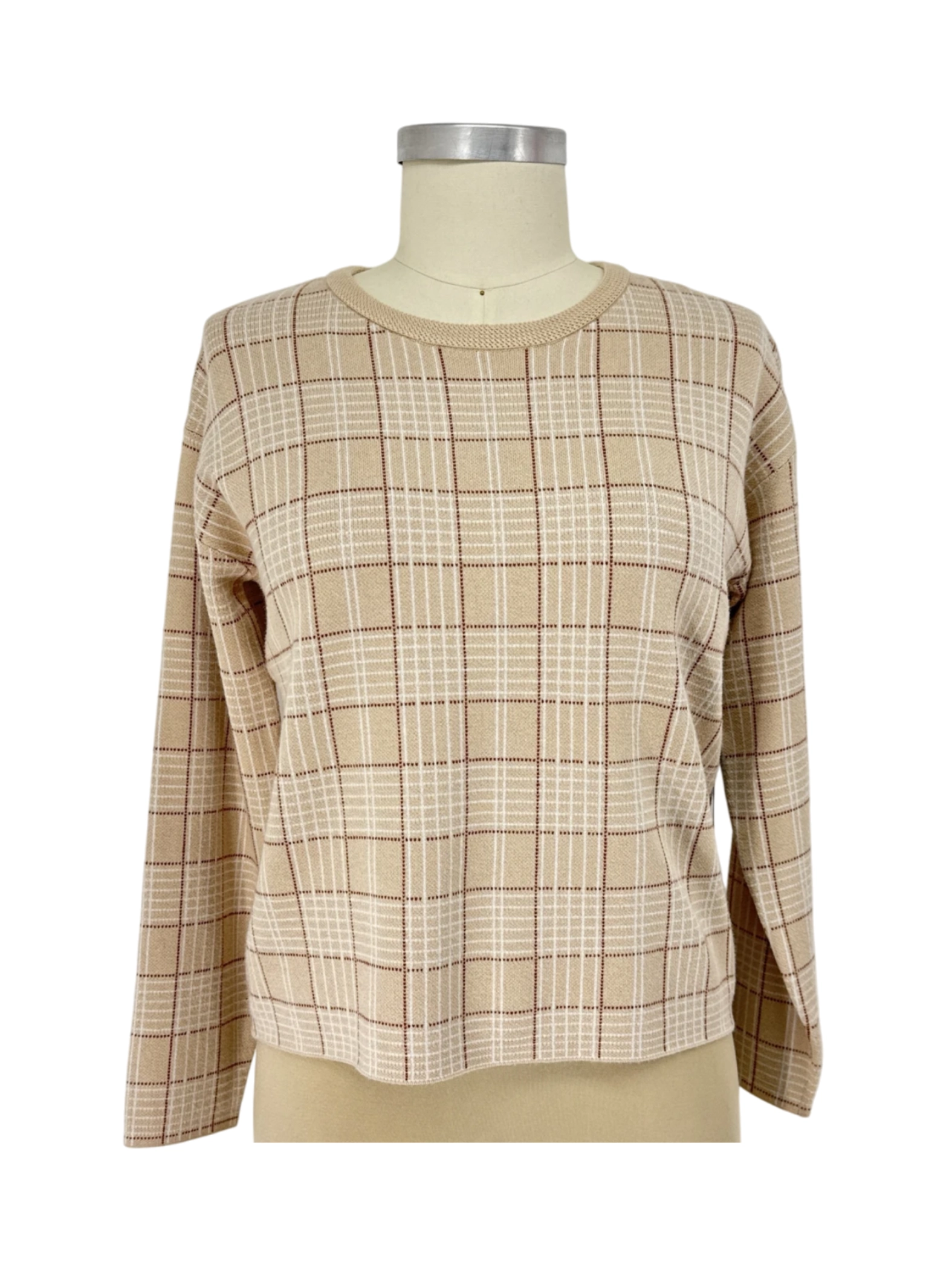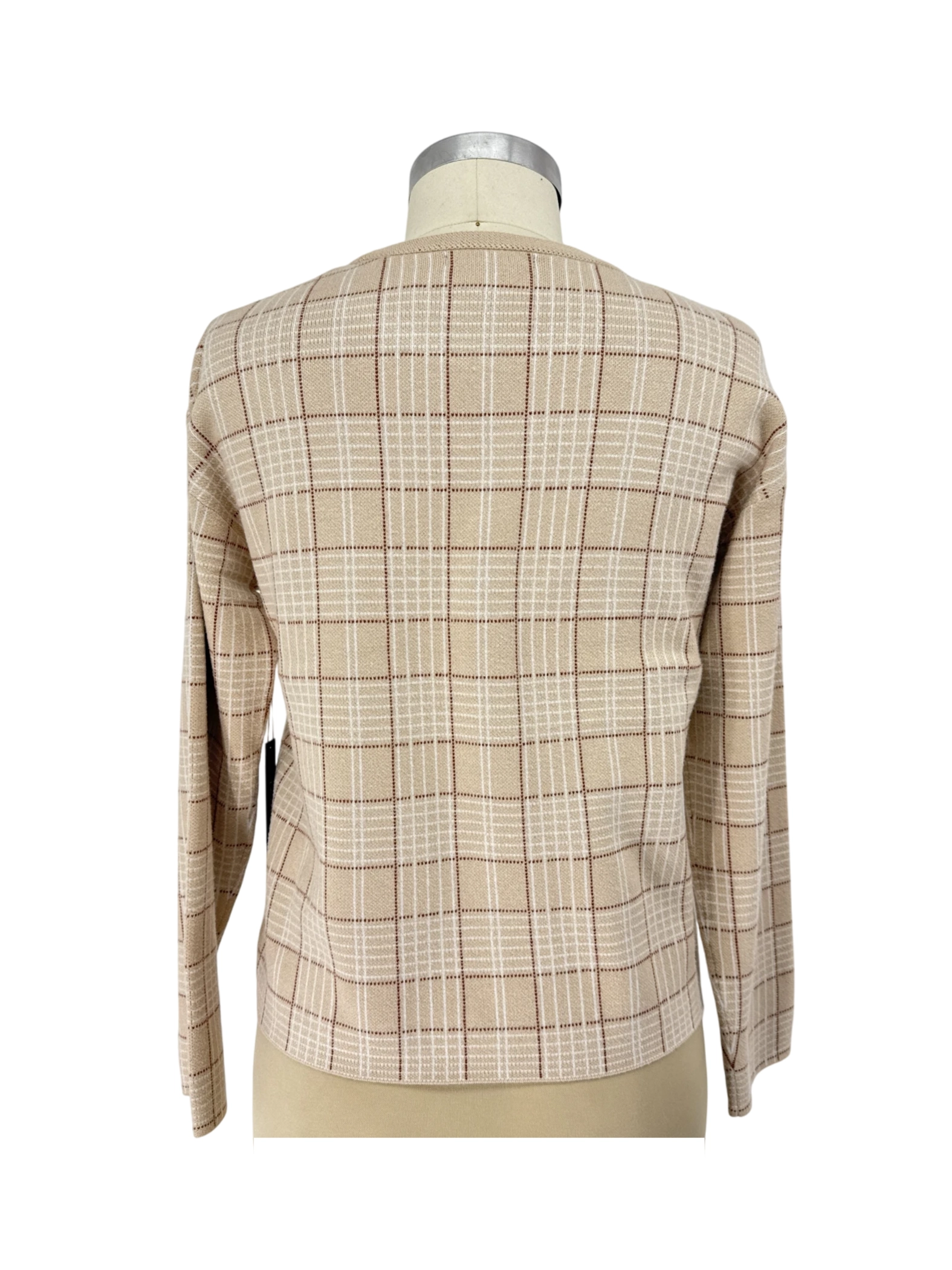 This pre-owned TAHARI sweater is a stylish addition to any wardrobe. Featuring a classic plaid pattern in beige tones, it's perfect for adding a touch of sophistication to your fall or winter outfits. The sweater offers a comfortable fit and a versatile design, making it suitable for both casual and semi-formal occasions. Crafted from a blend of rayon, viscose, polyester and nylon, this sweater provides warmth and a luxurious feel. Its round neck and timeless design make it a wardrobe staple.