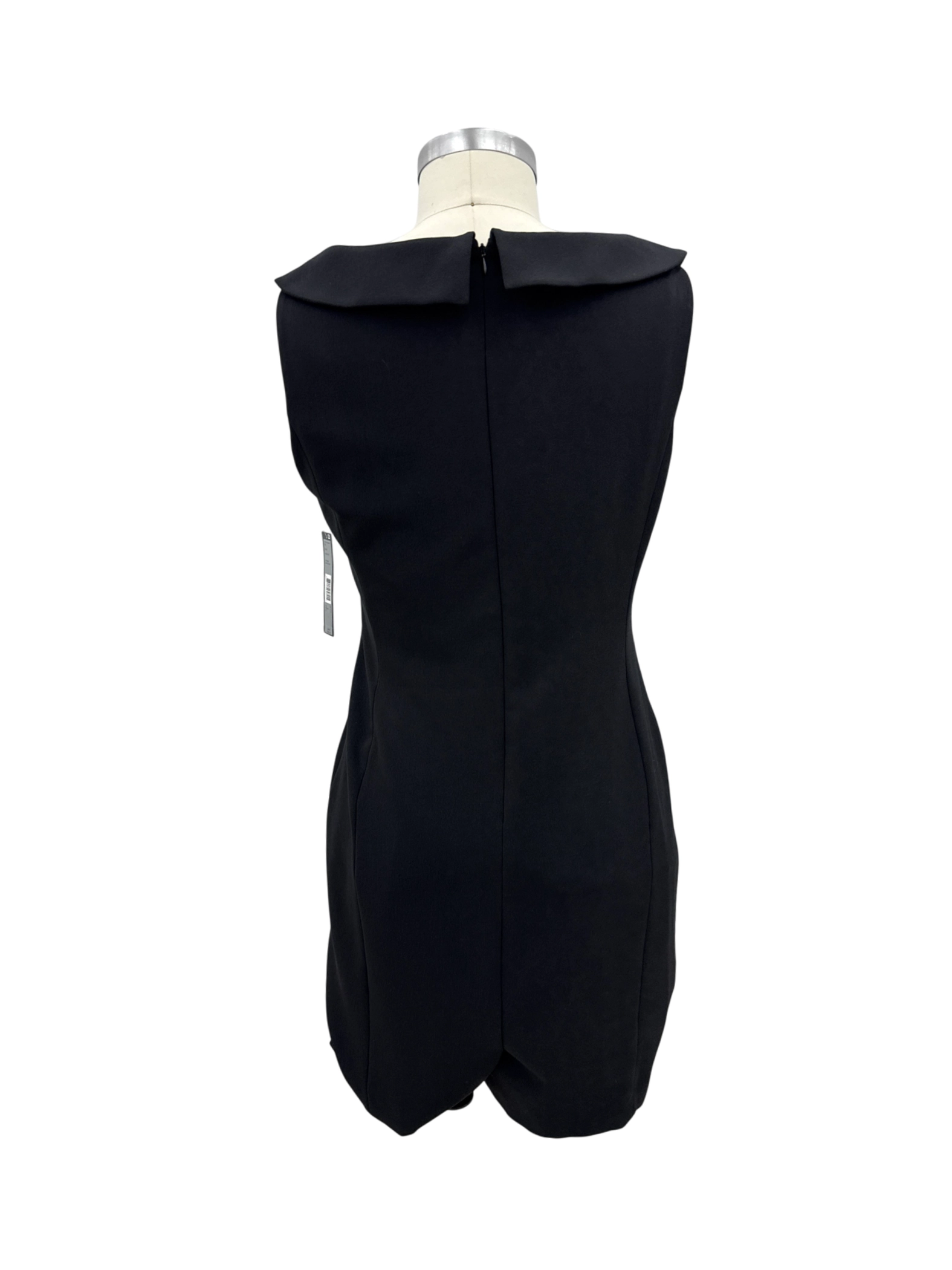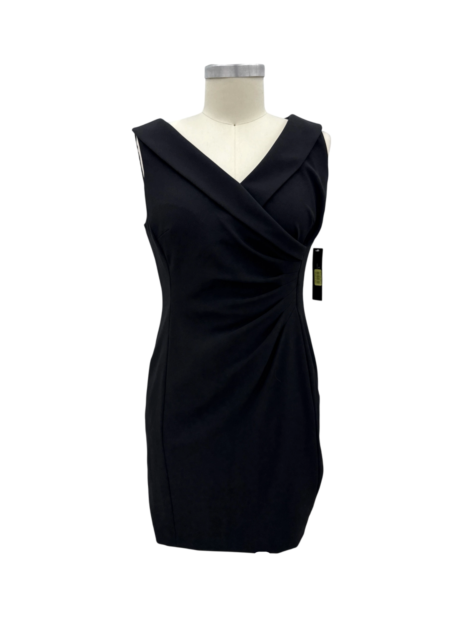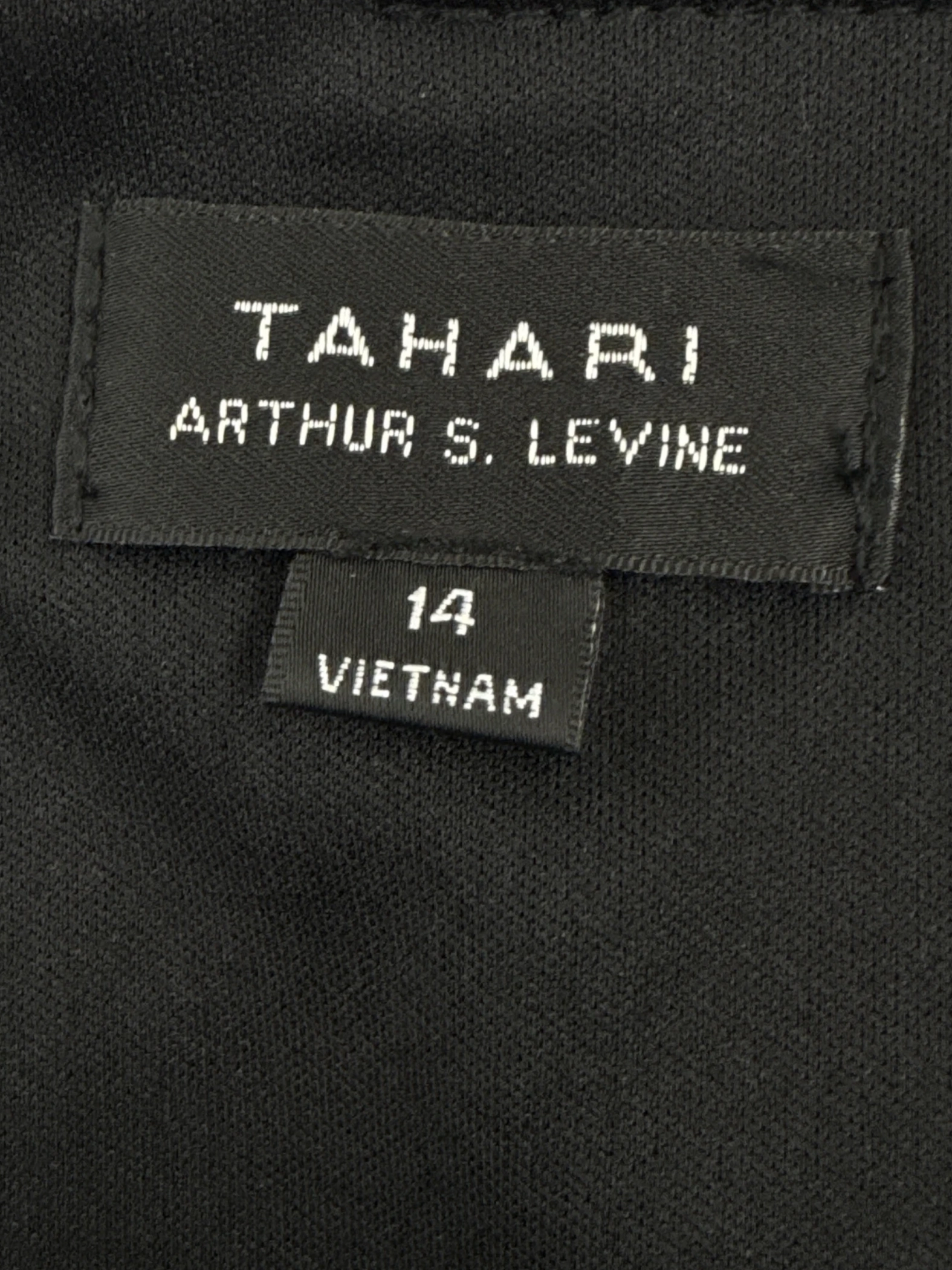 This elegant Tahari sheath dress is perfect for a cocktail party or a night out. The sleeveless design and V-neckline create a flattering silhouette, while the black color makes it easy to accessorize. Made from a comfortable blend of polyester and spandex, this dress offers a sleek fit. This pre-owned dress is a great addition to any wardrobe, offering both style and sophistication.