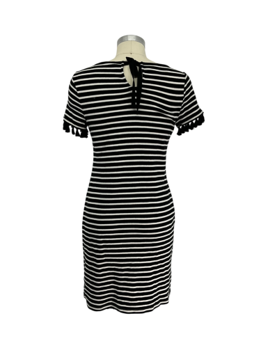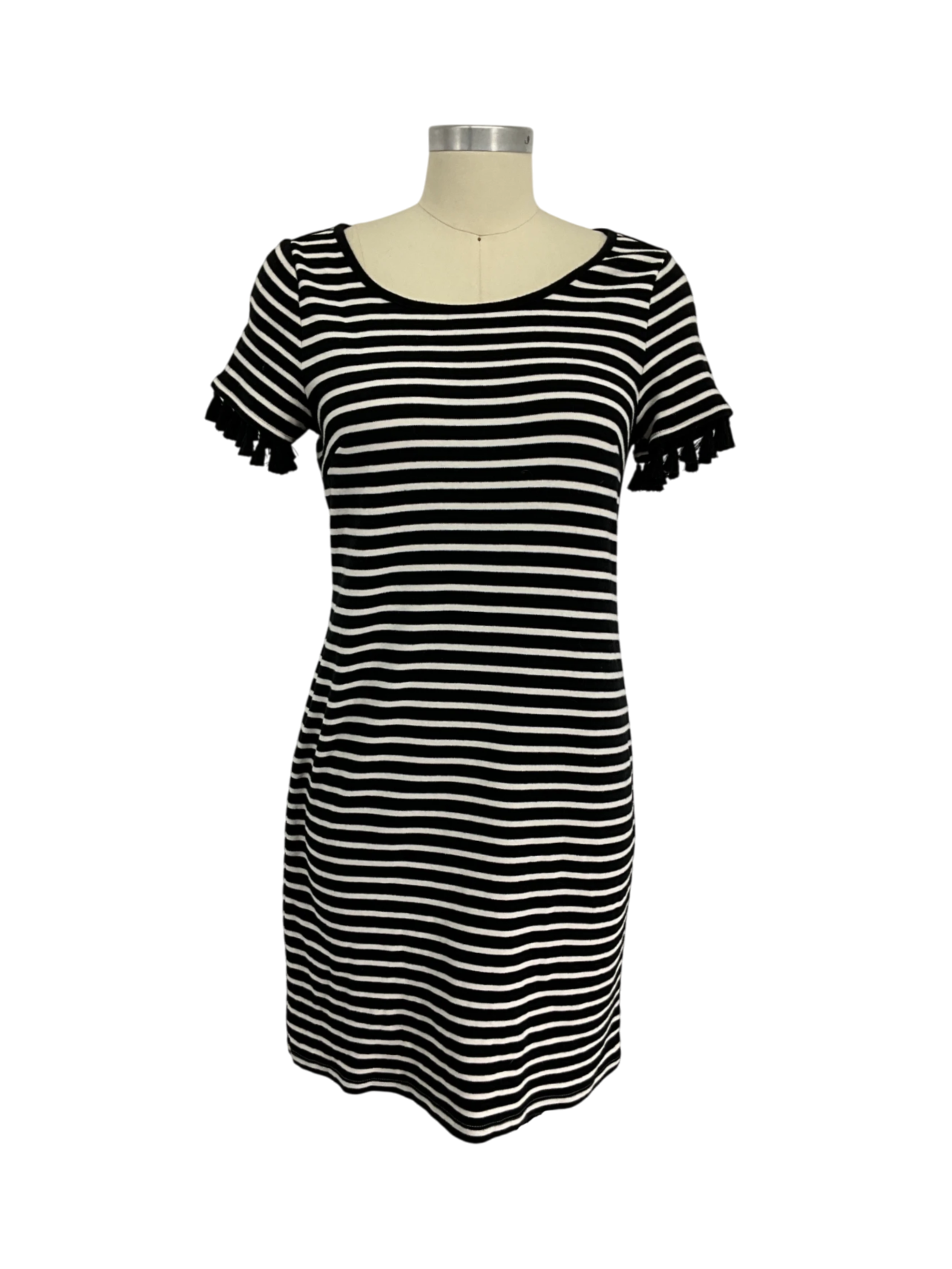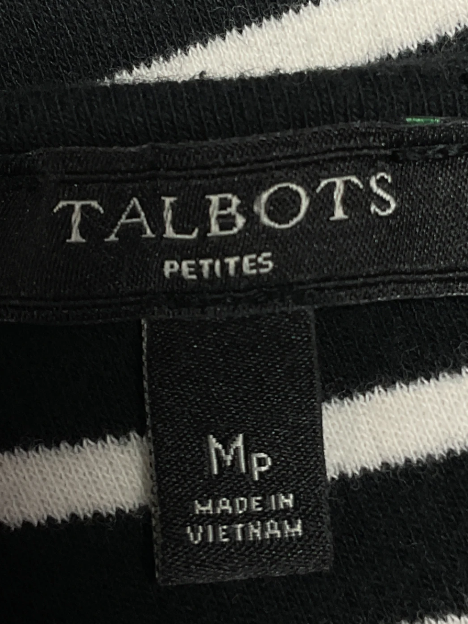 Talbots black and white striped t-shirt dress with 3/4 sleeves and a stretchy sheath design.