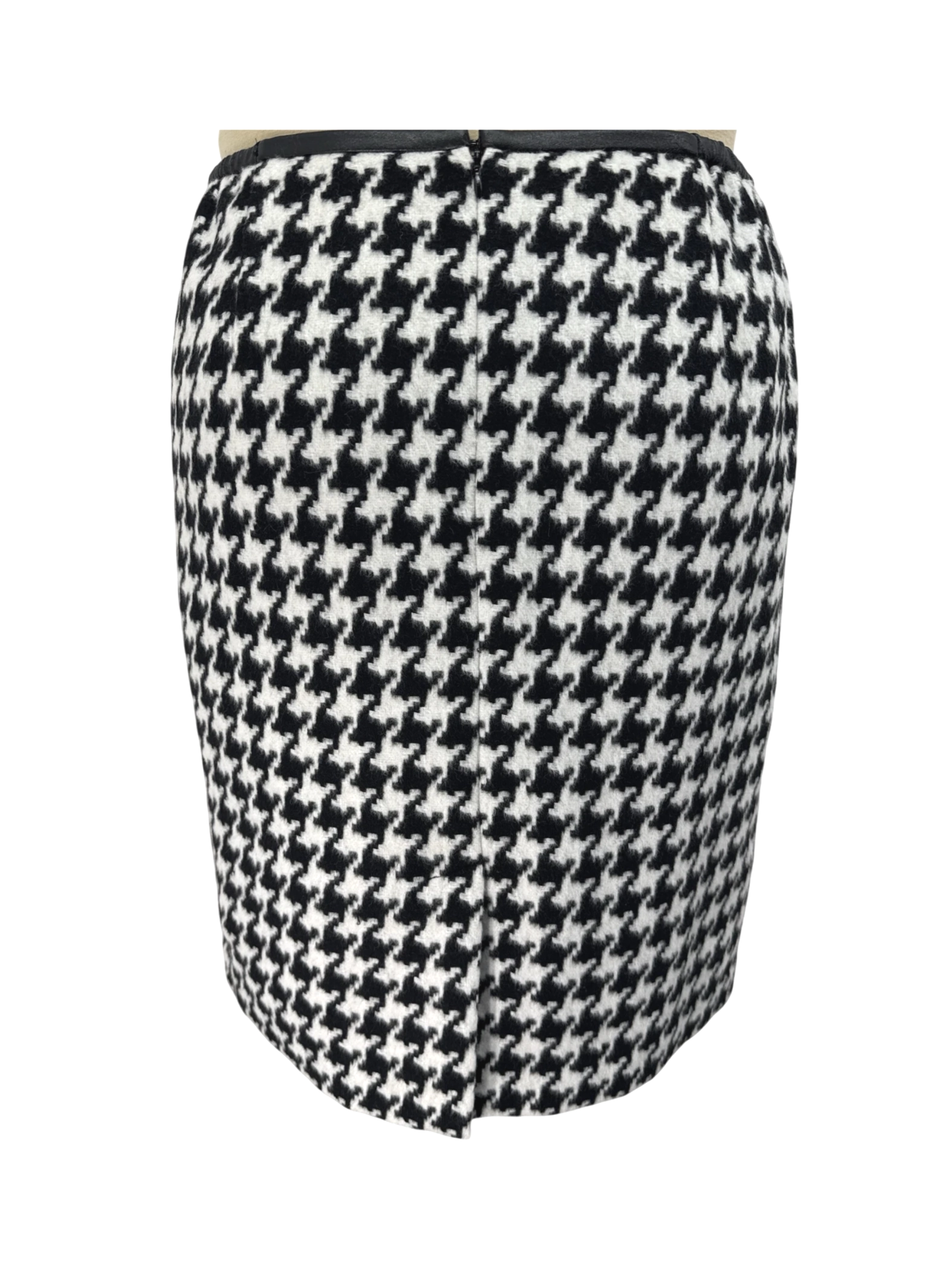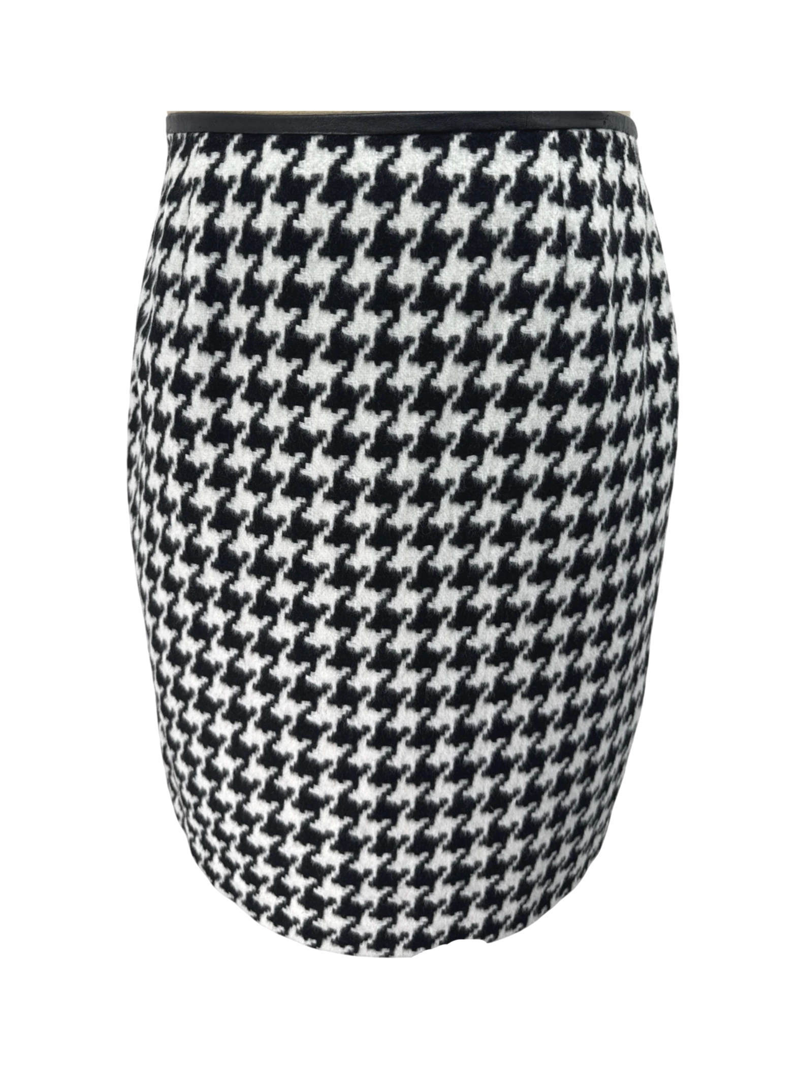 This pre-owned TALBOTS pencil skirt is a classic addition to any wardrobe. Featuring a timeless houndstooth pattern in black and white, this mini skirt is perfect for fall and winter. Crafted from a blend of wool and polyester, with a faux leather trim, it offers both style and comfort. The skirt is in excellent condition, ideal for a sophisticated yet versatile look. The skirt is designed for women, offering a flattering fit for various body types.
