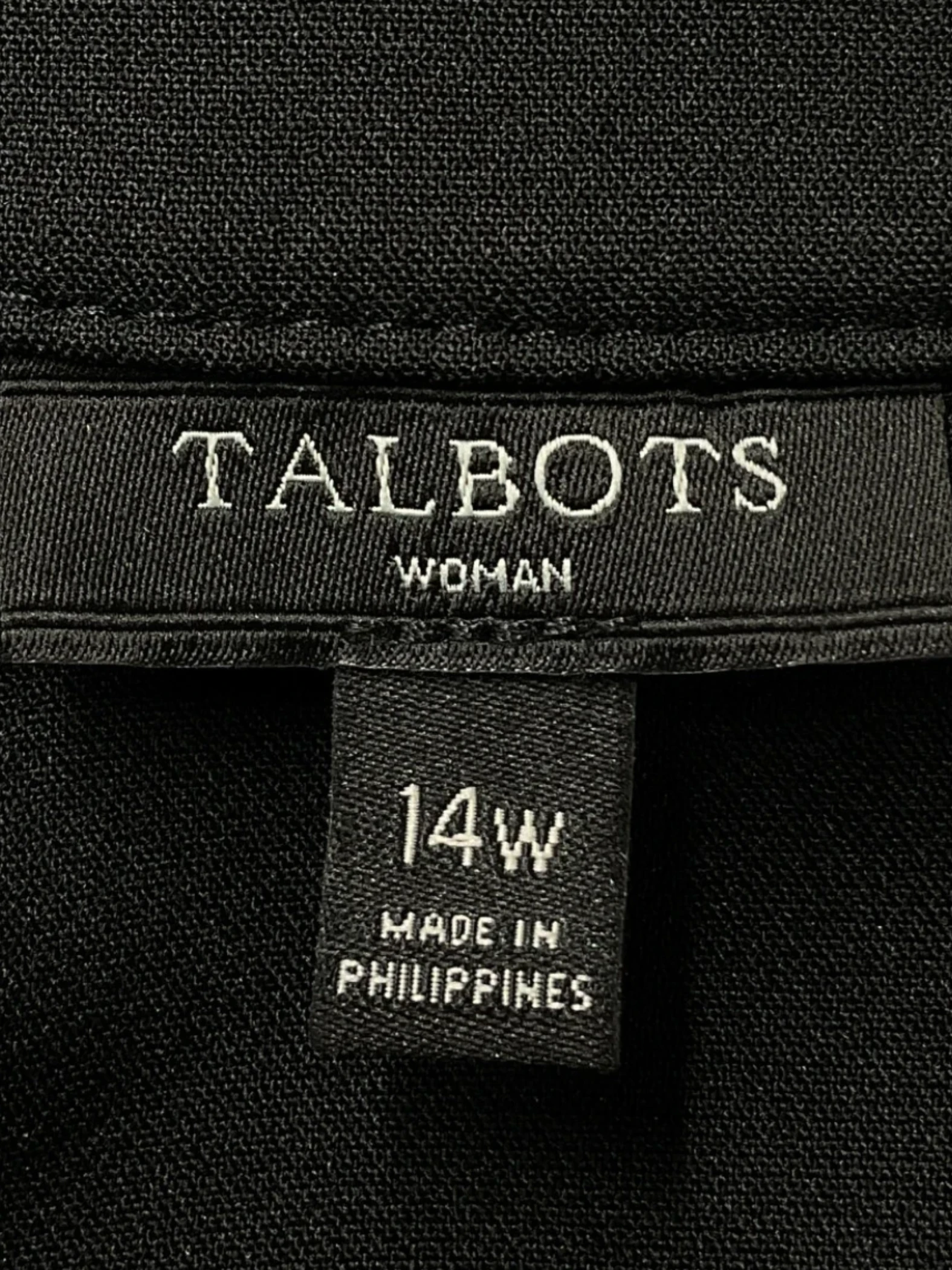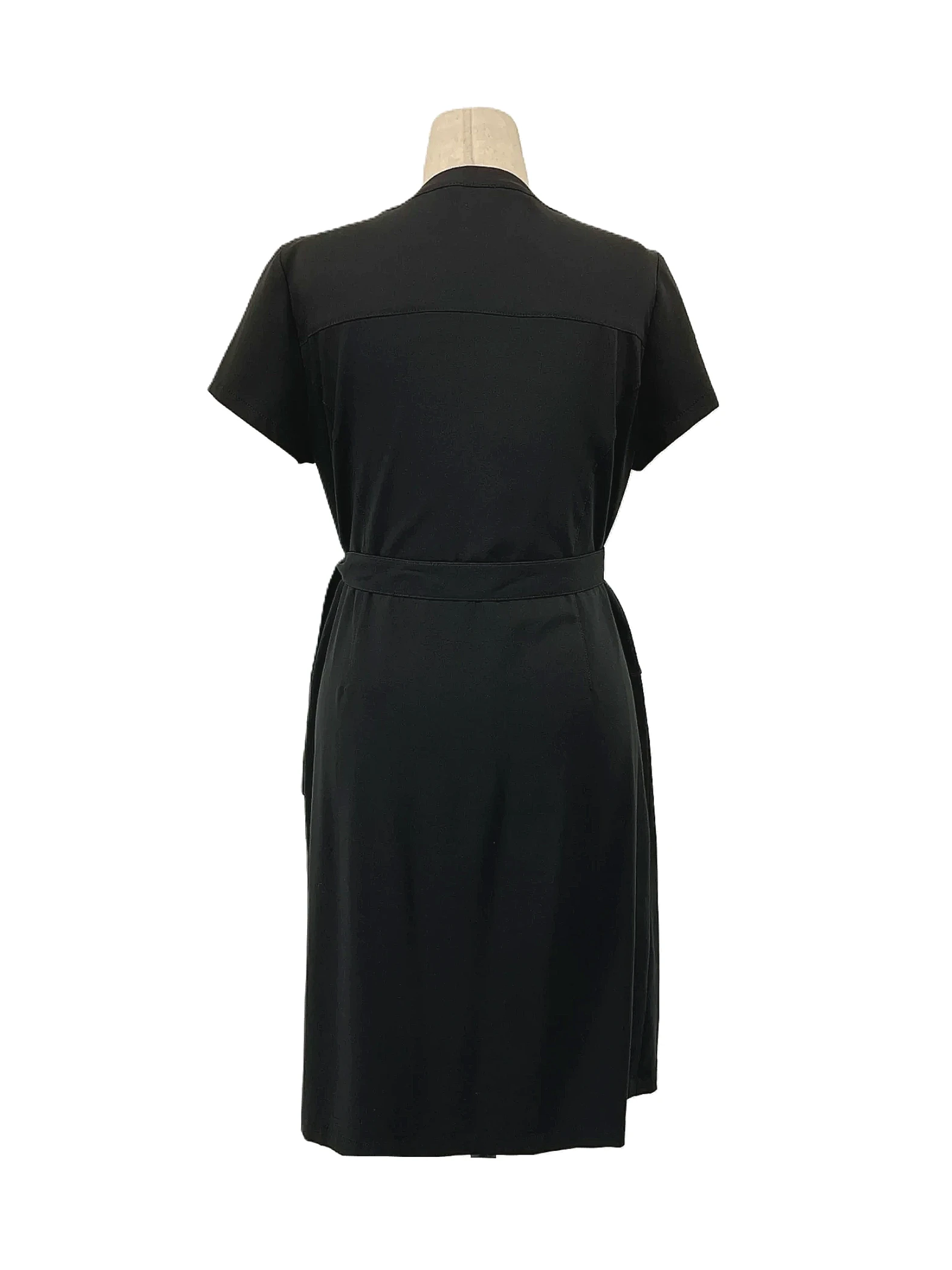 Women's black cotton shirt dress with short sleeves, pleats, bow detail, and belt in size 14W.