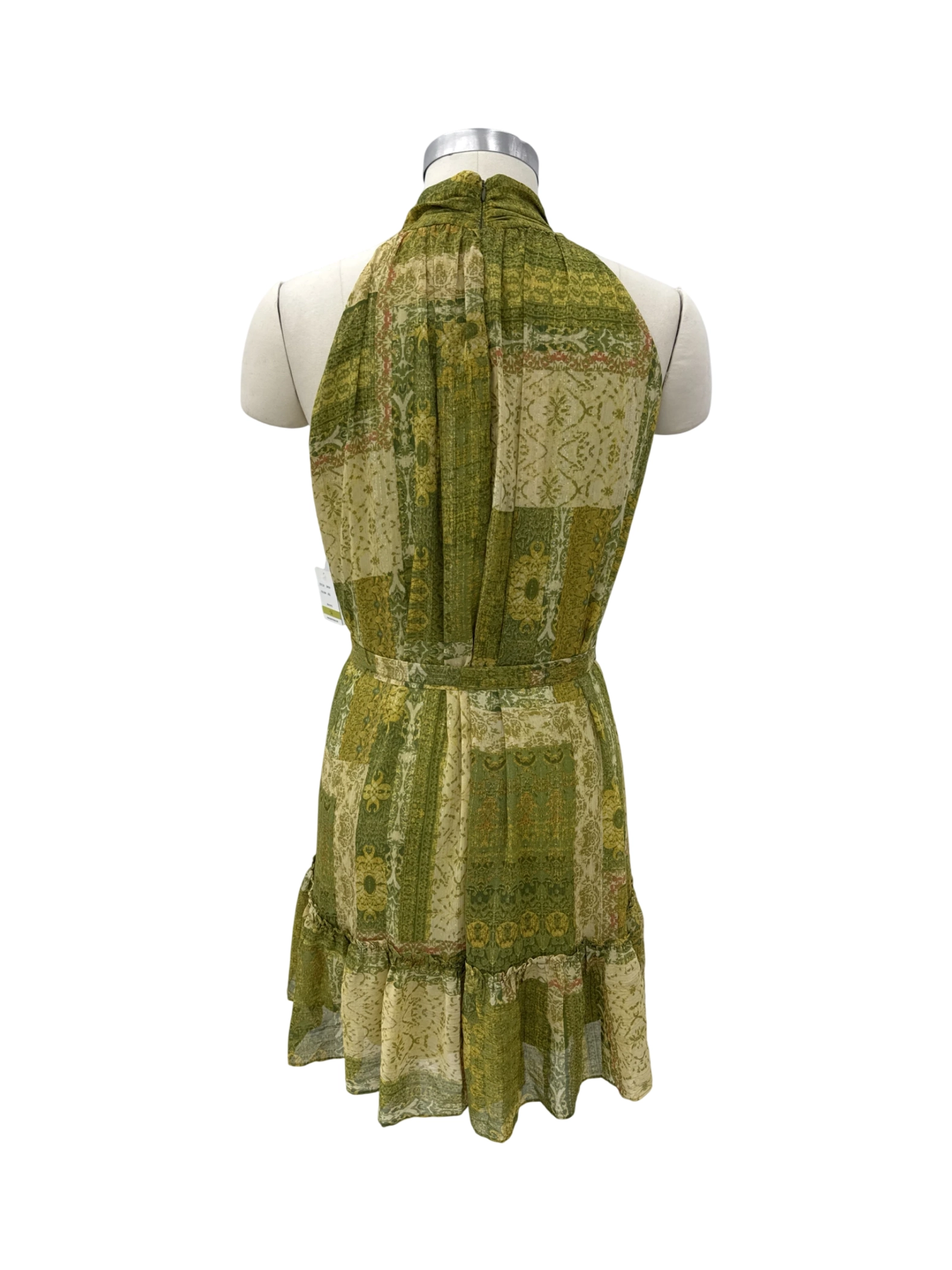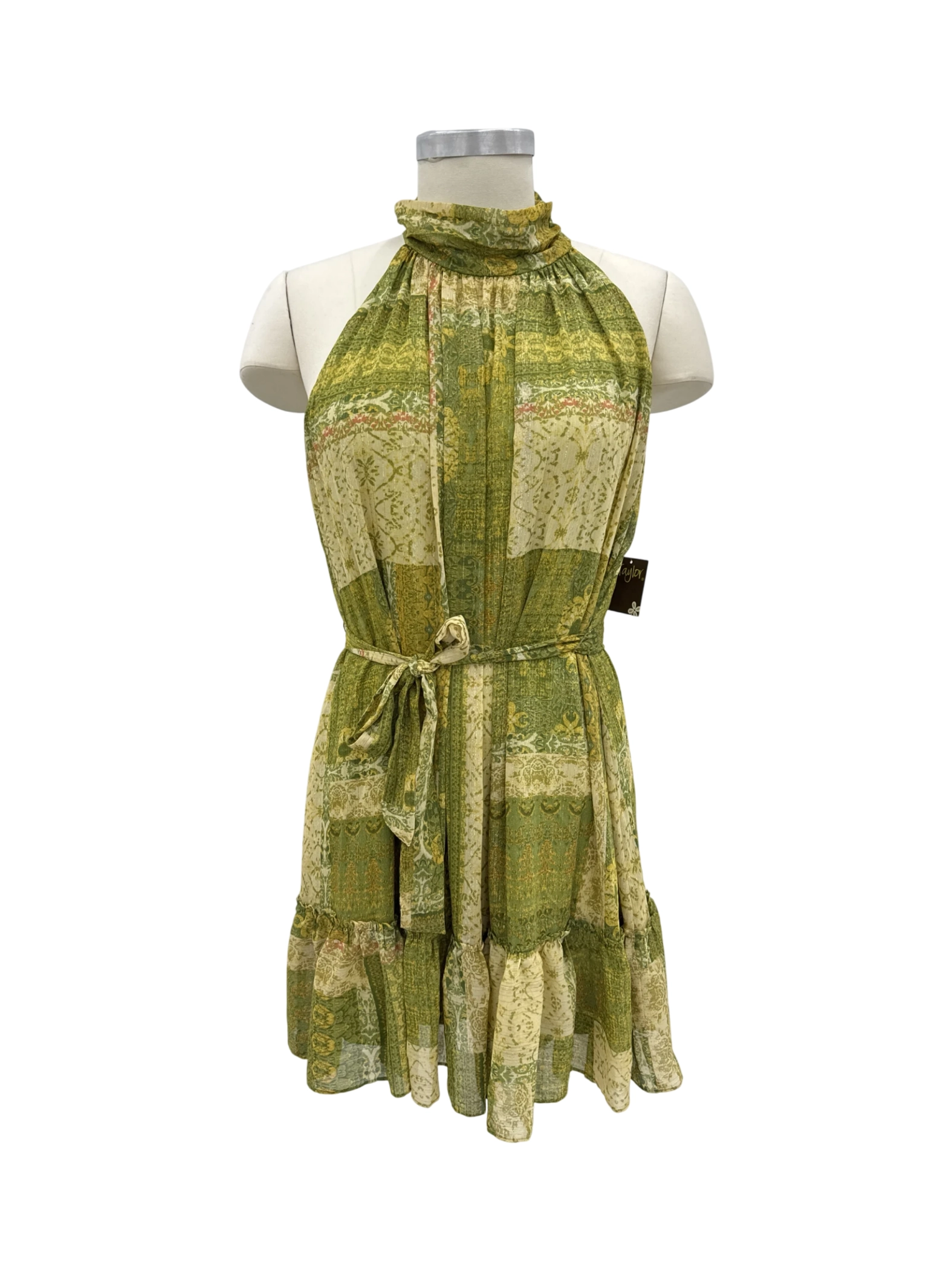 This pre-owned Taylor dress is perfect for a breezy summer day! The sleeveless A-line design features a beautiful floral pattern in shades of green and tan, with a flattering mini skirt length. Made from 100% polyester, it is lightweight and comfortable. The dress includes a round neckline and stylish halter design. This dress is ideal for casual outings, or dressing up with heels. Get this vintage look!