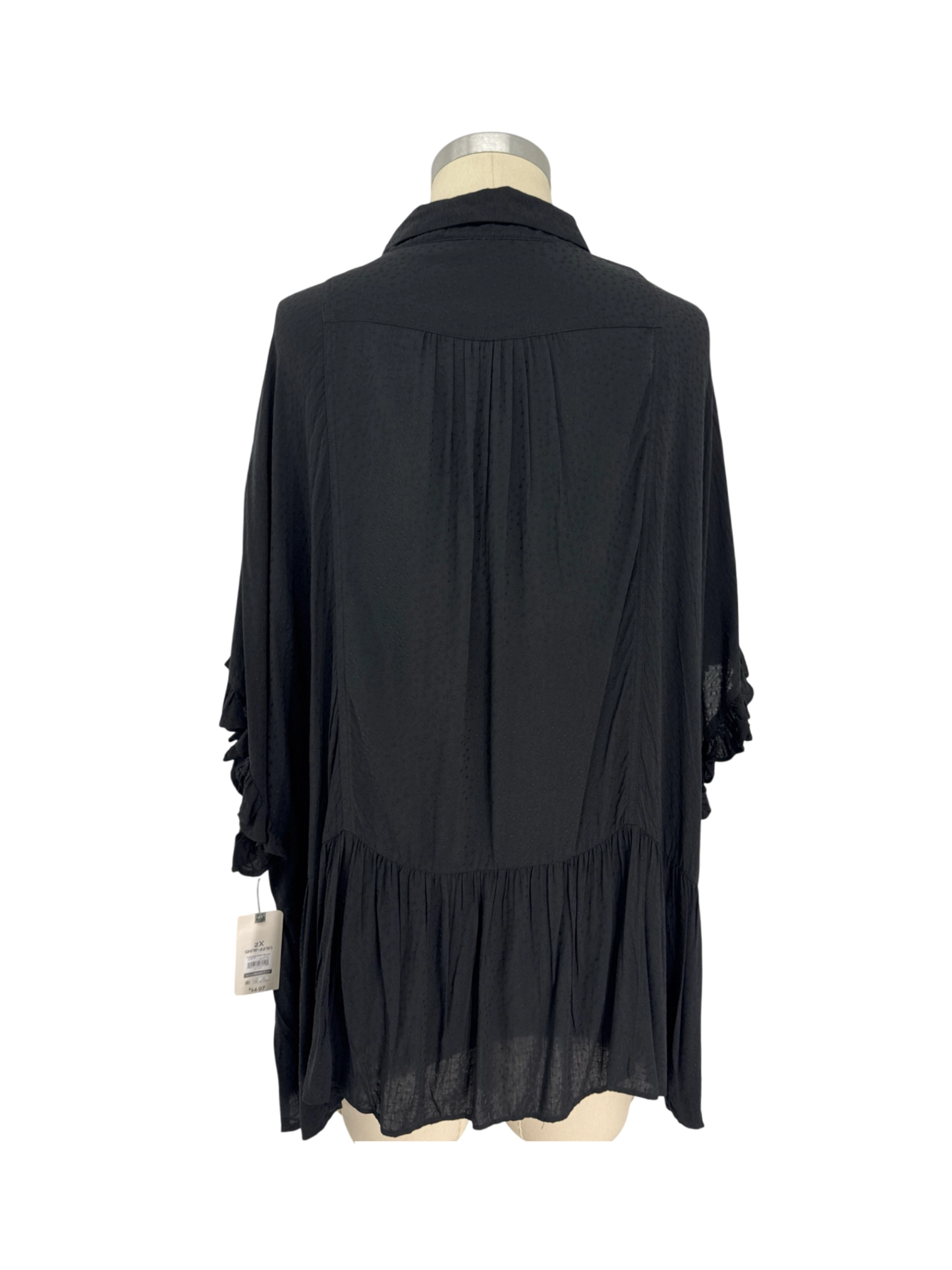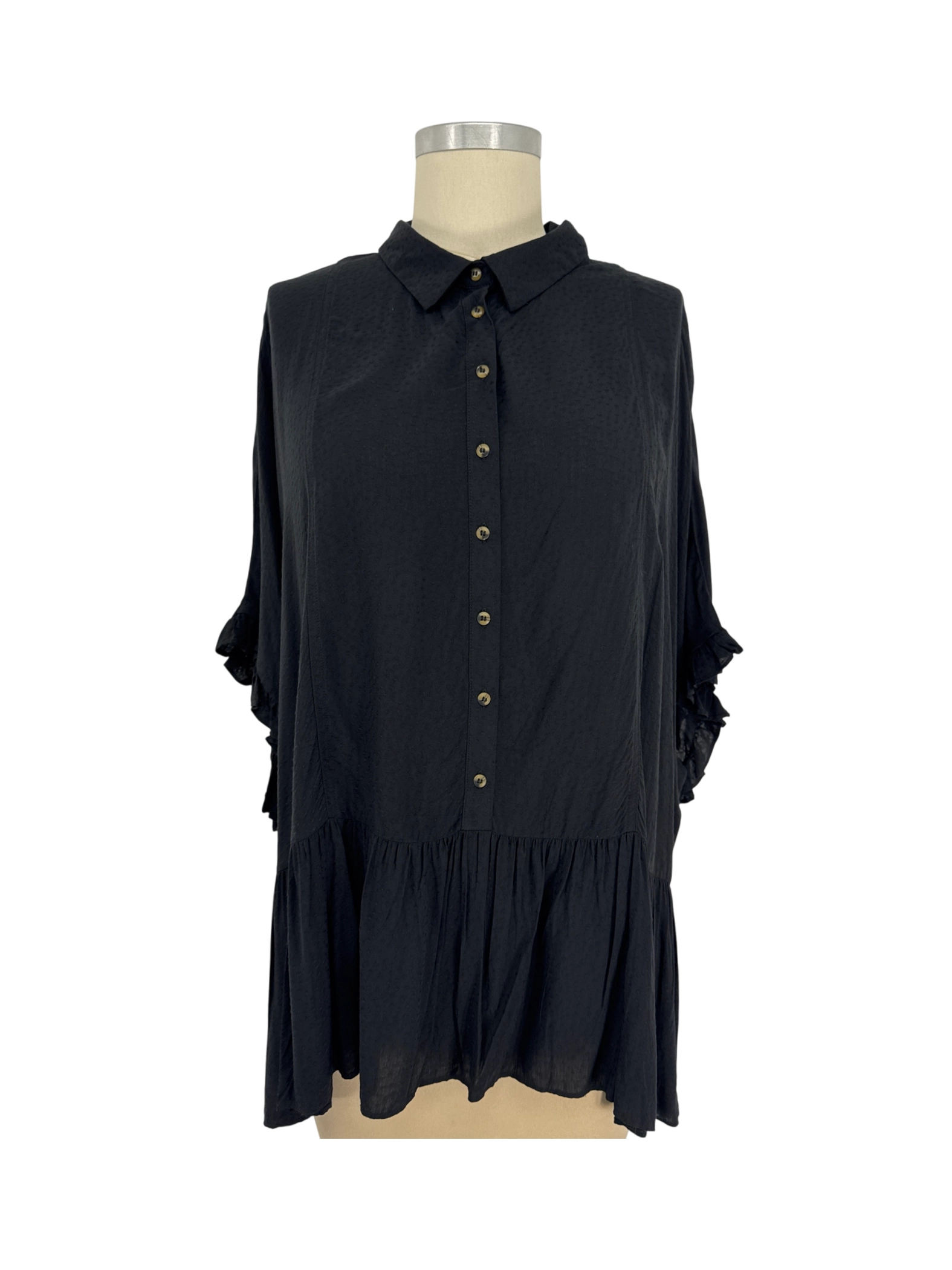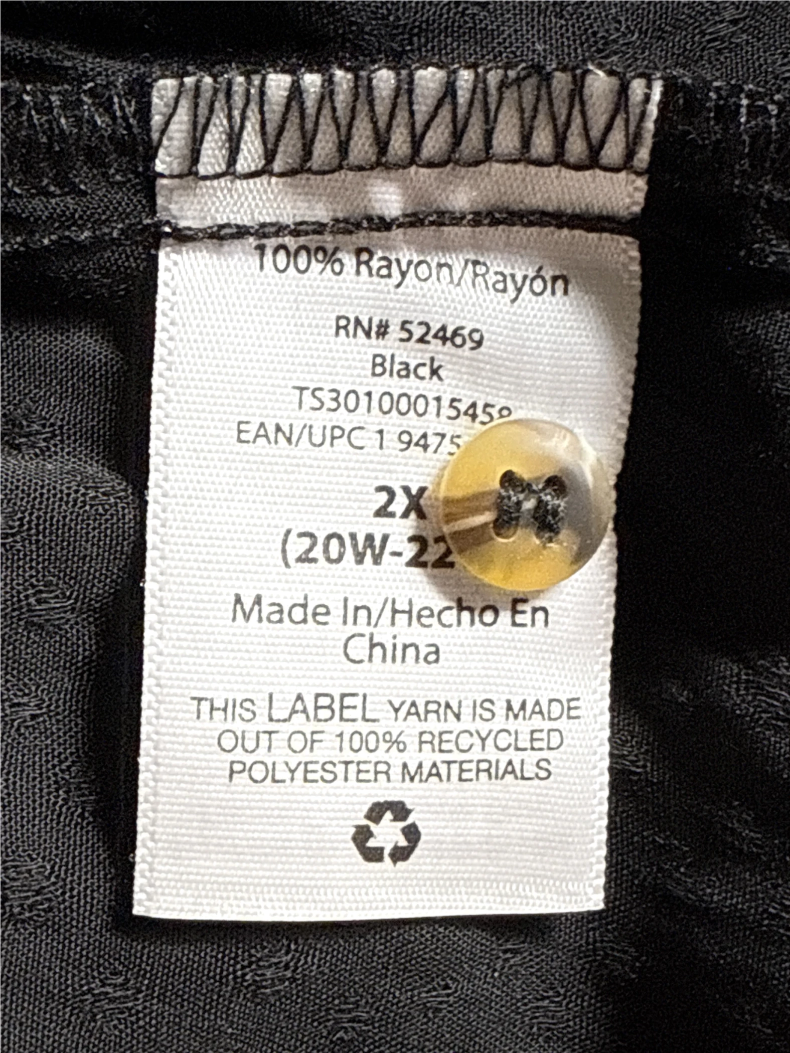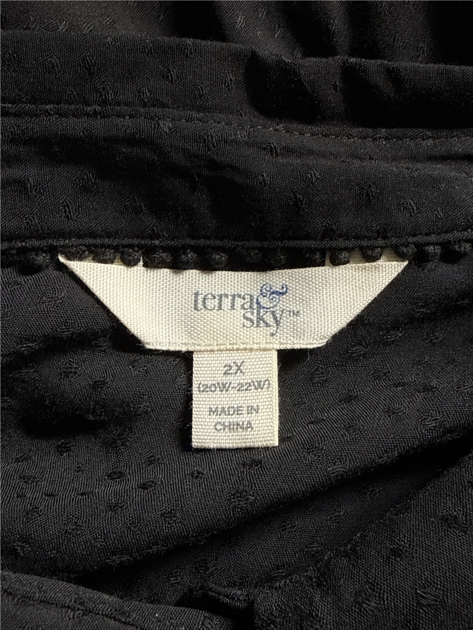 This stylish Terra & Sky blouse is a pre-owned find, perfect for any wardrobe. This women's top features a classic button-up design with a flattering silhouette and comfortable fit. It's a versatile piece that can be dressed up or down. The black color makes it easy to pair with any bottoms, while the three-quarter sleeves add a touch of elegance. Made from a lightweight rayon fabric, this blouse is ideal for all seasons. Elevate your everyday style with this chic and affordable piece.