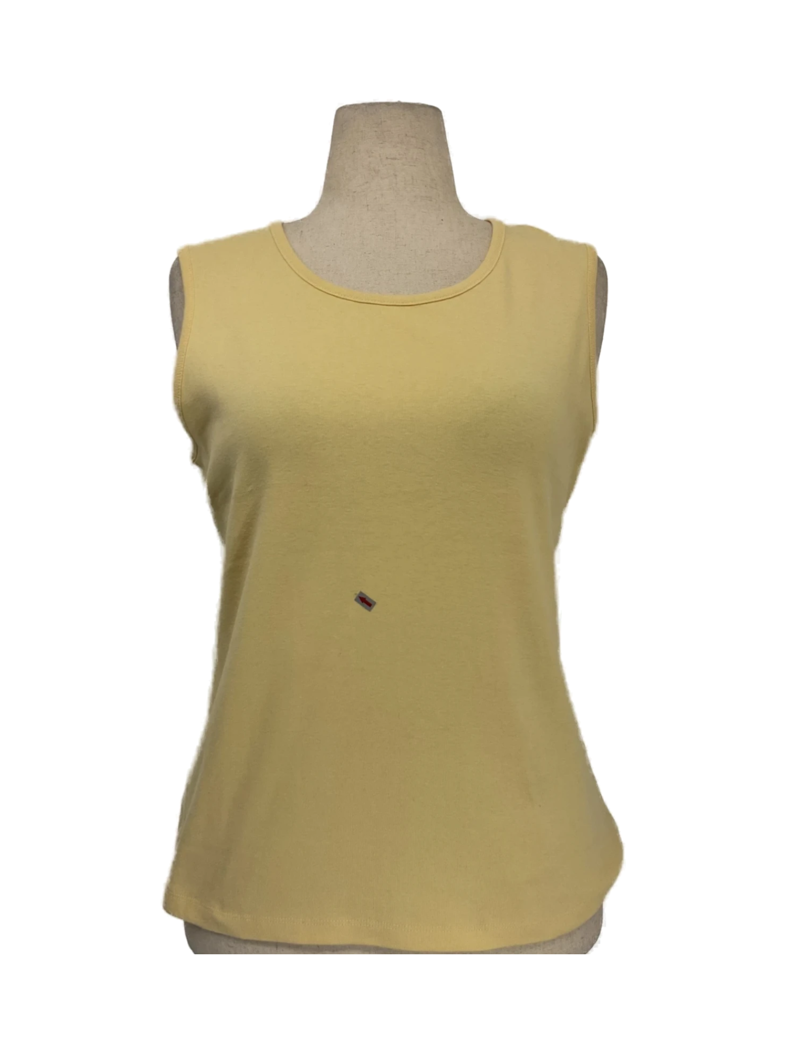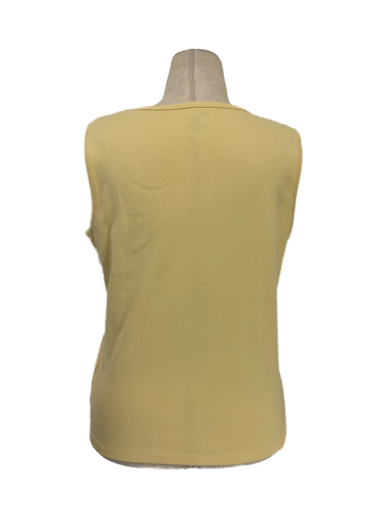This is a women's Khaki sleeveless tank top in size Small Petite. It is made of 100% Cotton and has a small washable dot on the front.