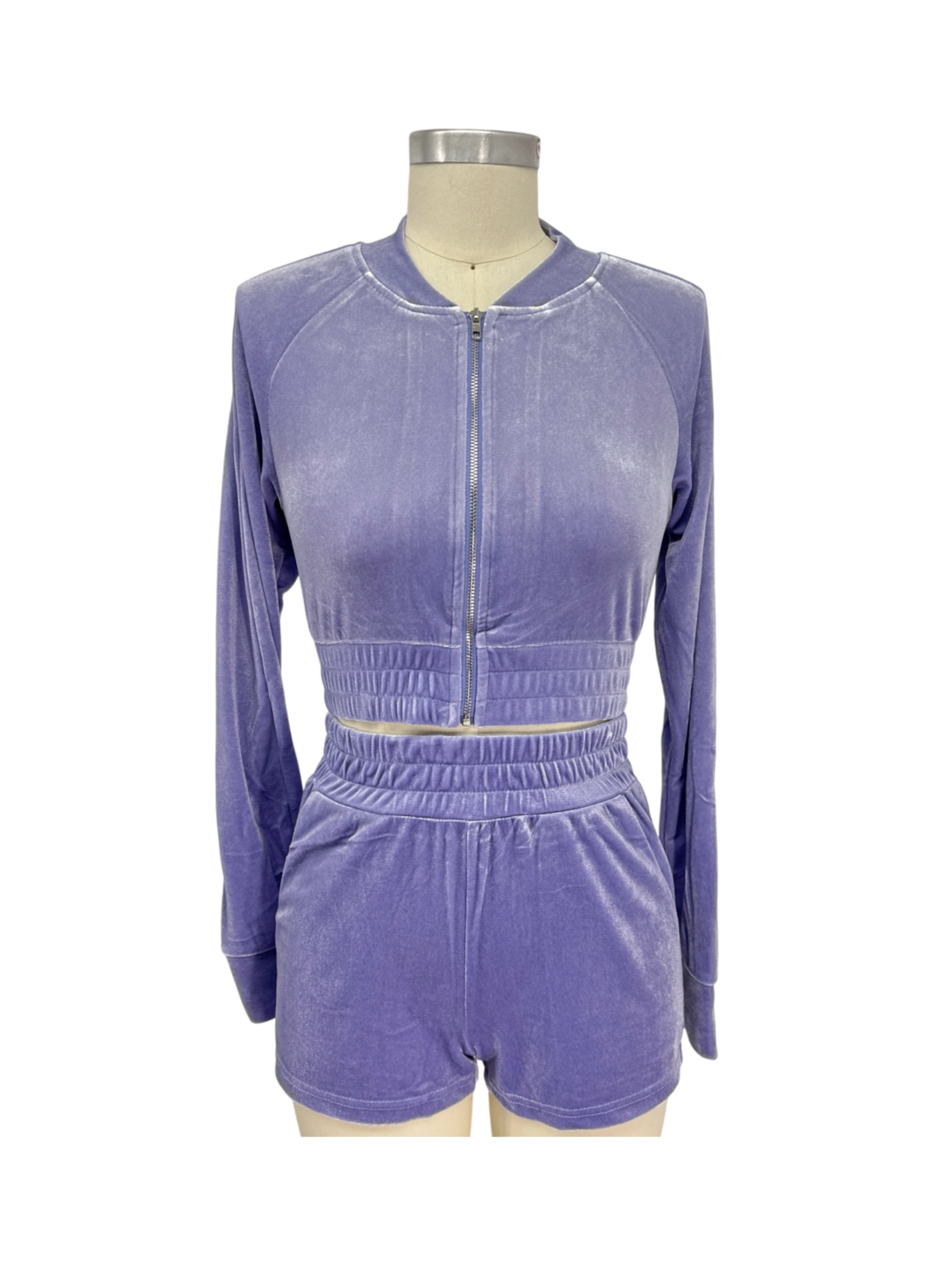 Embrace comfort and style with this pre-loved TIC TOC Women's Set. This two-piece set features a soft, lavender hue, perfect for a casual yet chic look. The set includes a zip-up jacket and matching shorts, both crafted from a luxurious velvet-like polyester fabric. Ideal for spring or summer wear, this set offers both comfort and a fashionable edge. Perfect for lounging, running errands or casual outings. A must-have addition to your wardrobe!