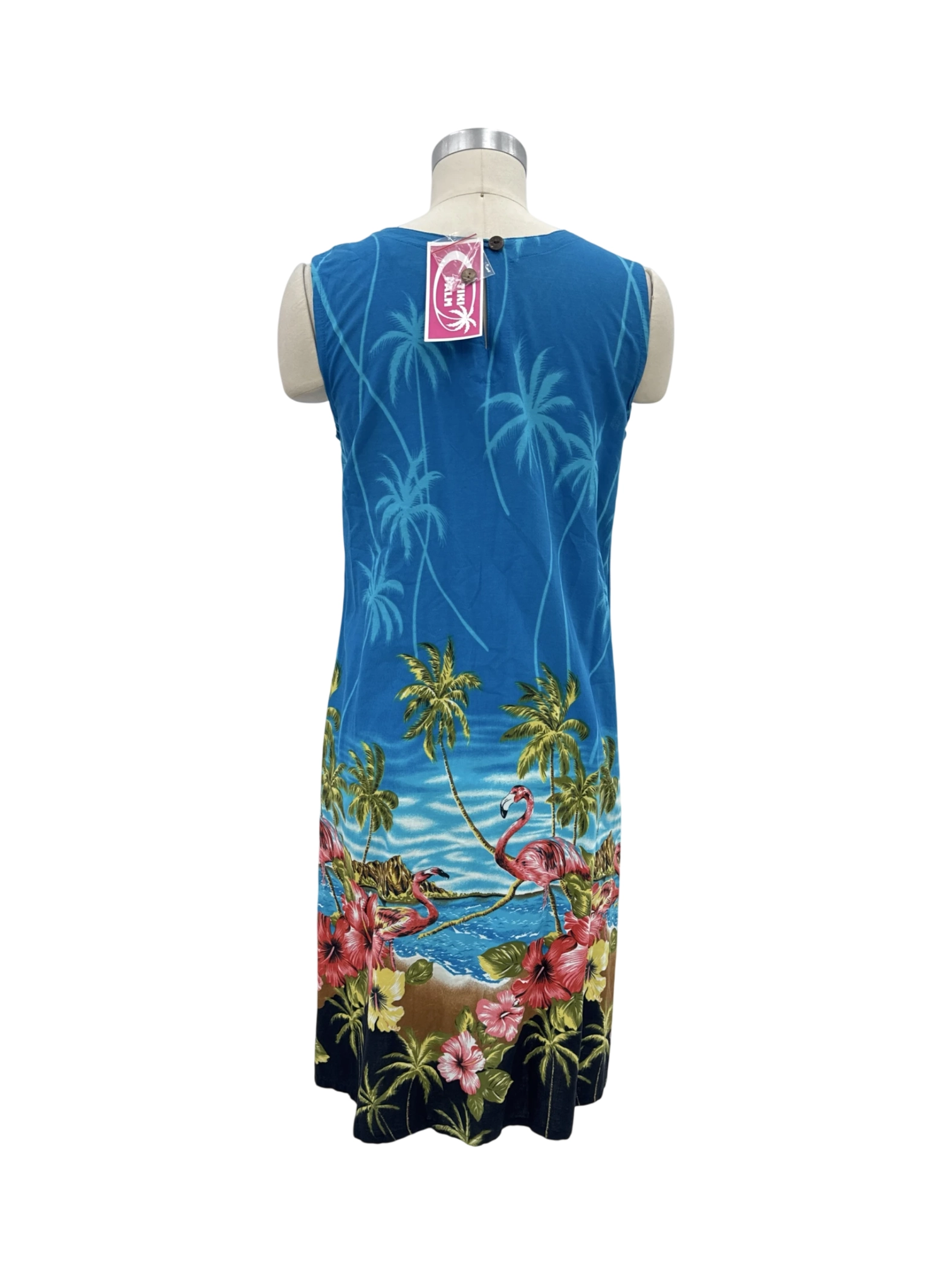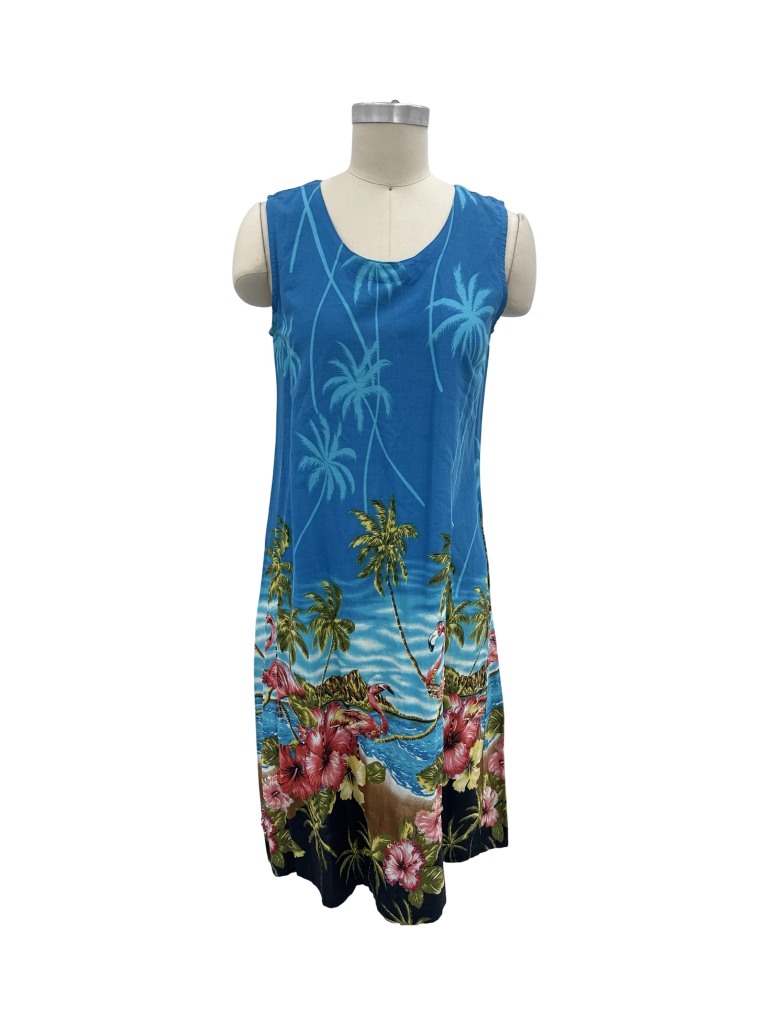 Embrace the tropical vibes with this pre-owned Tiki Palm dress, a perfect choice for summer. This sleeveless A-line dress features a vibrant floral print and a scoop neckline. Crafted from a comfortable blend of cotton and rayon, this dress offers a flattering fit. Ideal for a casual outing or a sunny day at the beach, this dress is sure to turn heads. Get ready to make a statement with this unique piece!