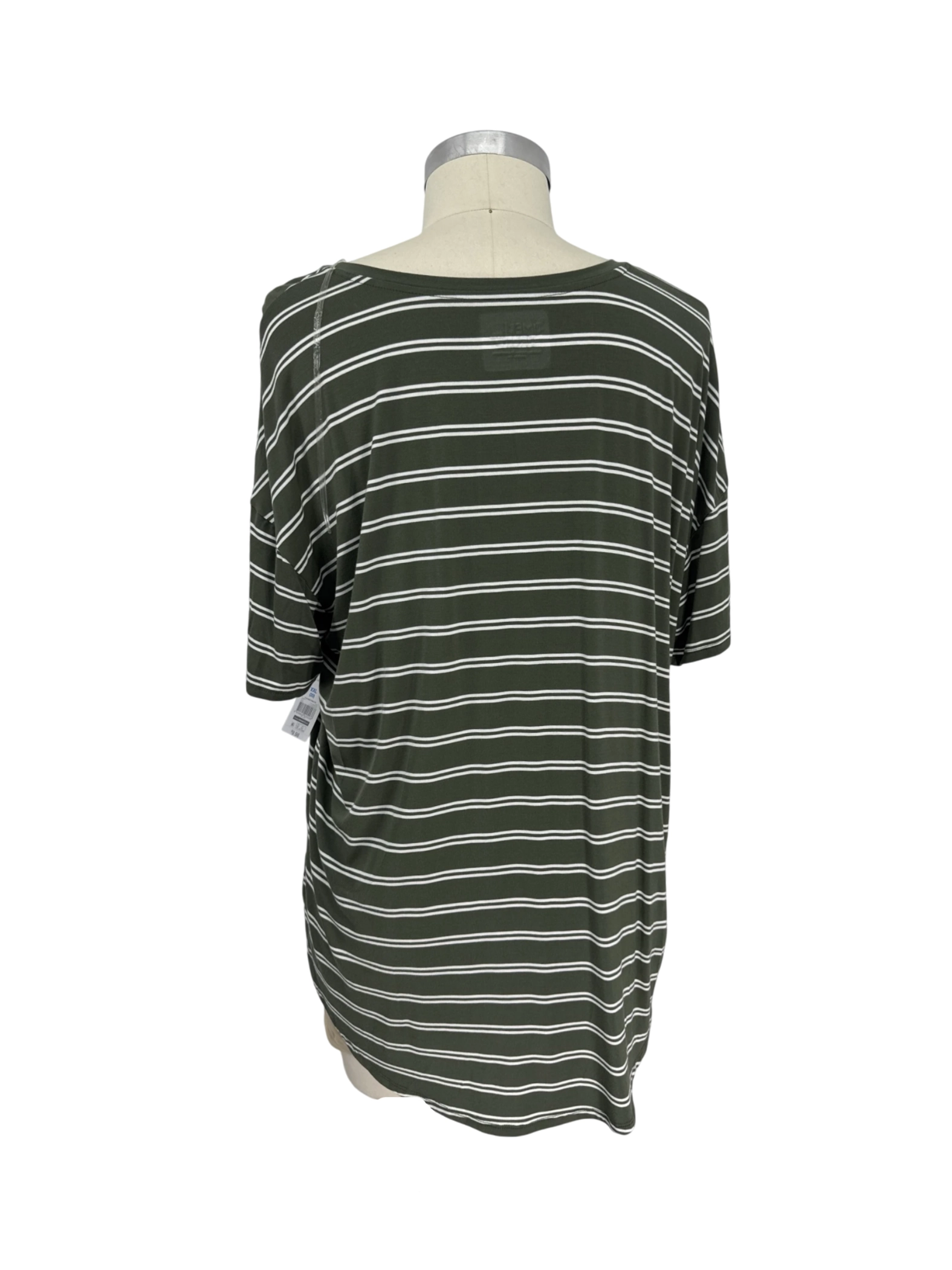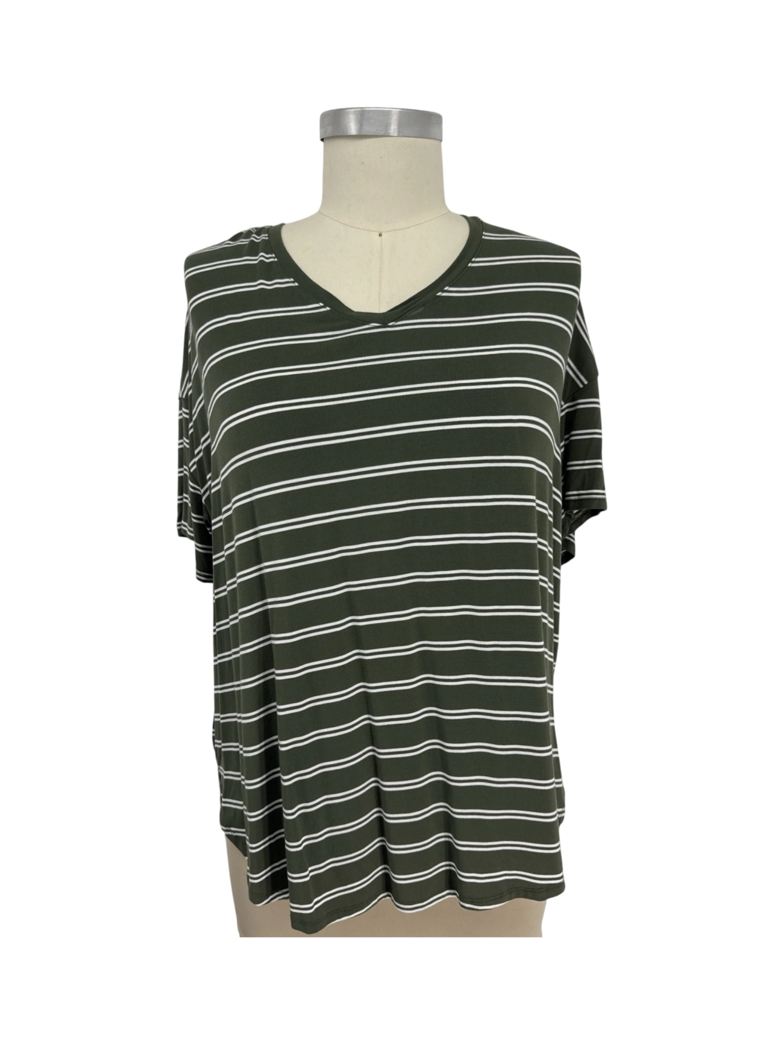 This Time and Tru women's t-shirt is a stylish and comfortable addition to any wardrobe. This pre-owned t-shirt features a classic stripe design with a V-neck and short sleeves. The fabric is a blend of rayon and spandex for a soft and stretchy feel. Its versatile design makes it perfect for casual outings or layering under a jacket. The shirt is in great condition, offering a sustainable and affordable fashion choice.