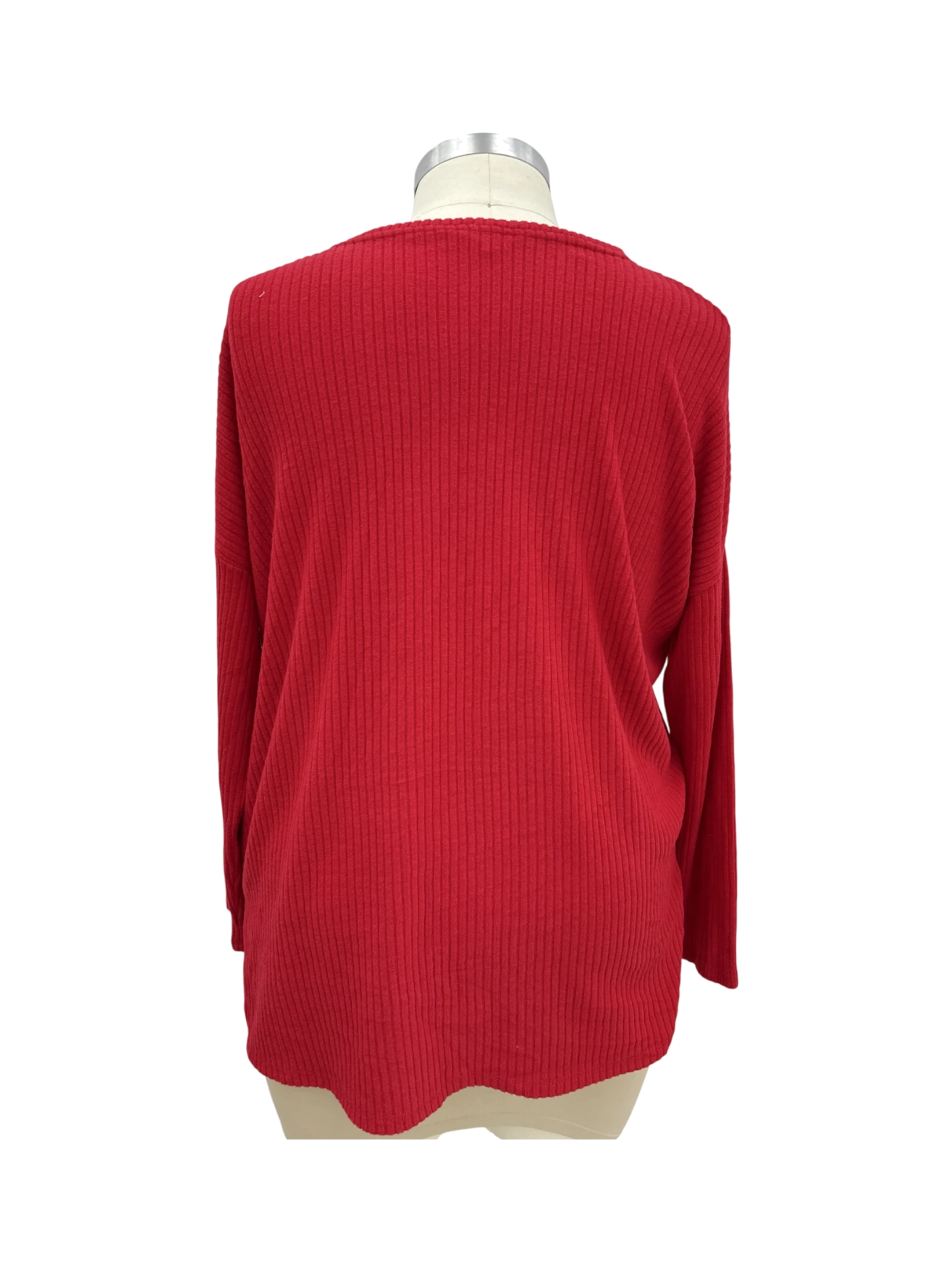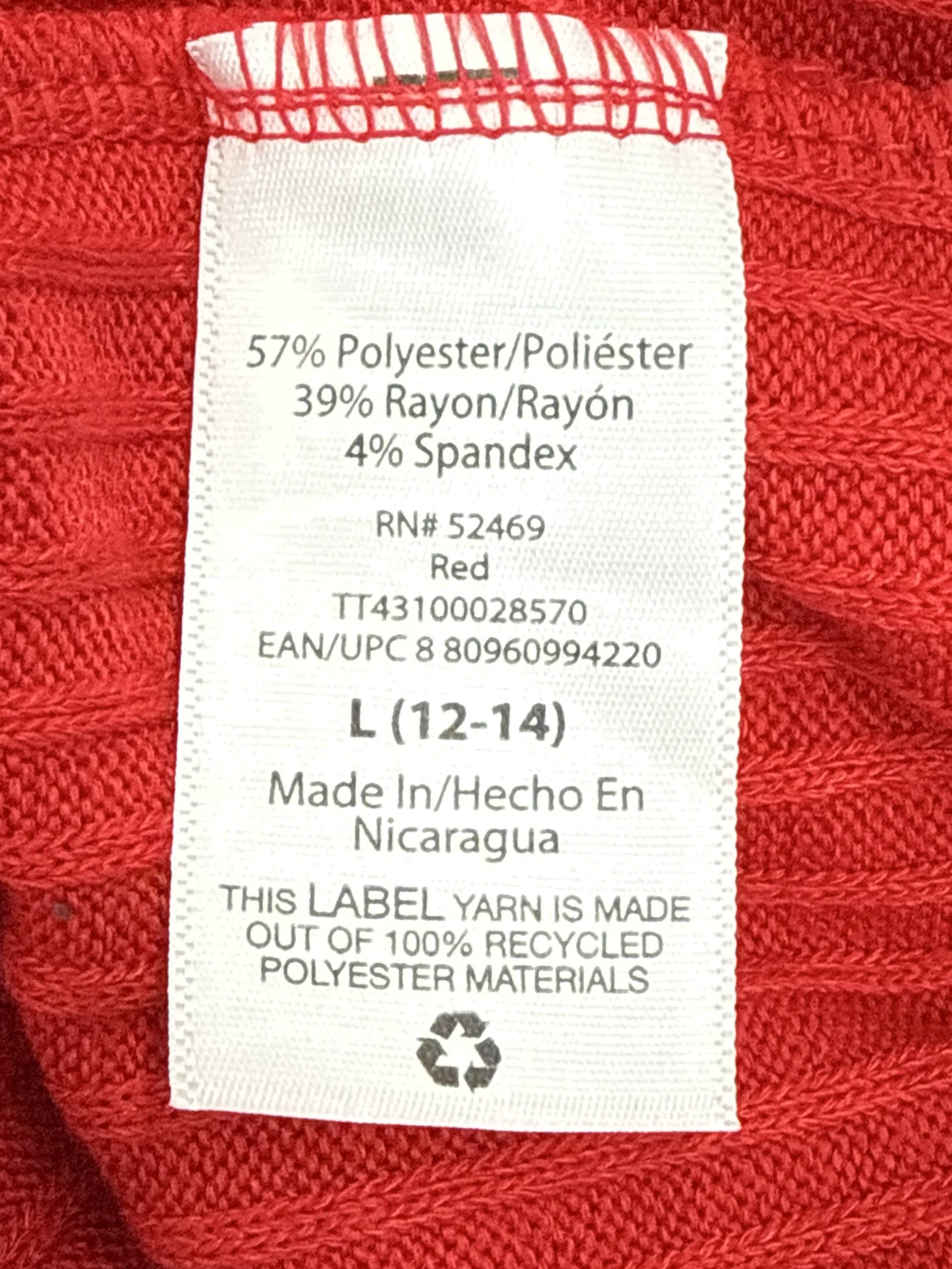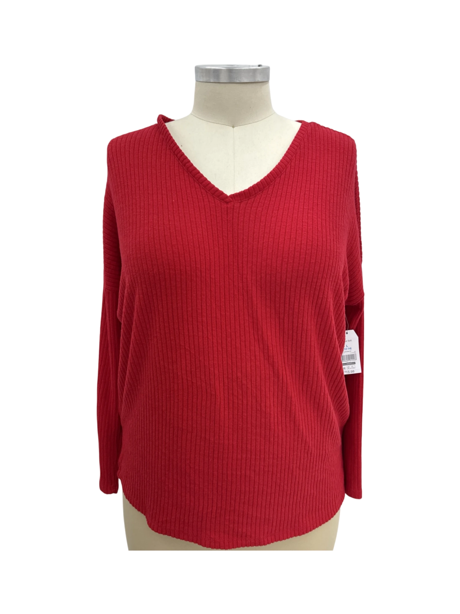 Elevate your wardrobe with this stylish pre-owned Time and Tru V-neck top. This comfortable T-shirt style top features long sleeves, a flattering V-neck, and a vibrant red color. The fabric blend ensures both comfort and durability. This top is perfect for layering or wearing on its own. A great addition to your casual wear collection. The tag indicates it's size L. Great price for a quality, well-maintained pre-owned garment.