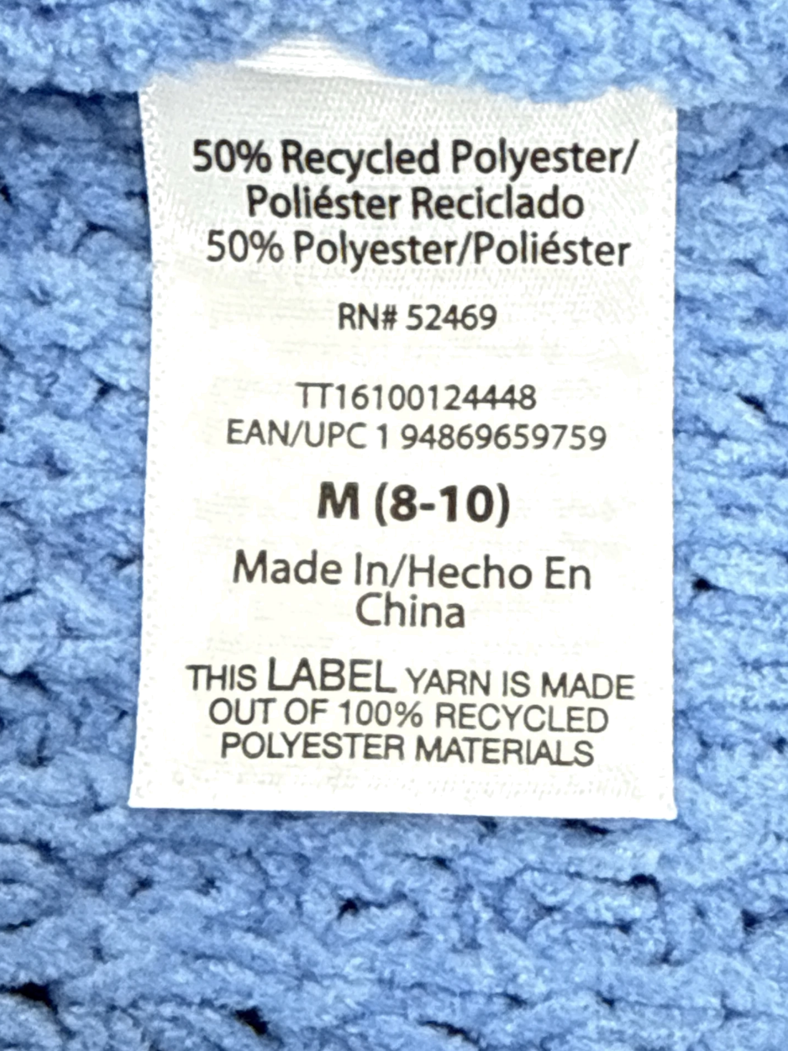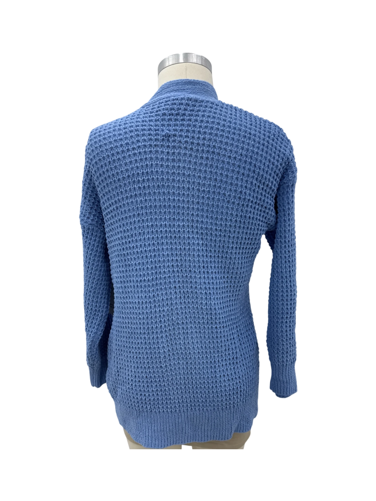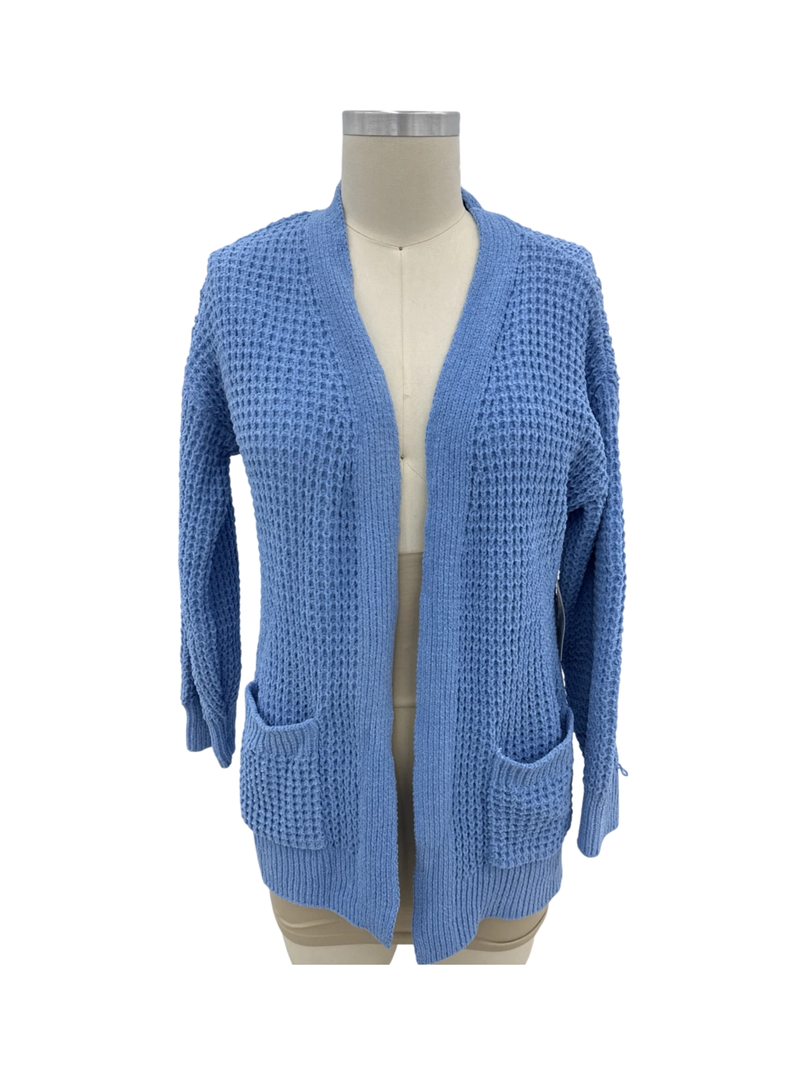 Stay cozy and chic with this pre-owned Time and Tru cardigan sweater. This stylish piece features a classic open front design and a flattering V-neck, perfect for layering during the cooler seasons. Crafted from a soft, recycled polyester, it offers both comfort and sustainability. The light blue color adds a touch of freshness to any outfit, making it a versatile addition to your wardrobe. Available in size M, this pre-loved sweater is a great value for your money.
