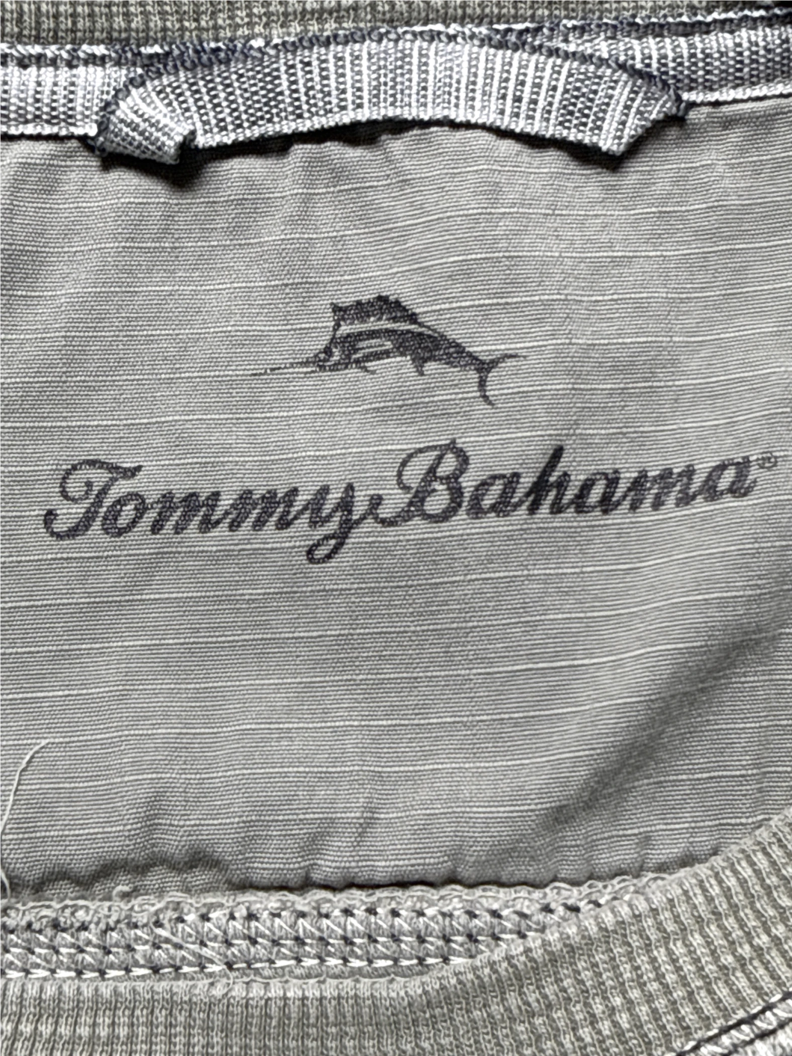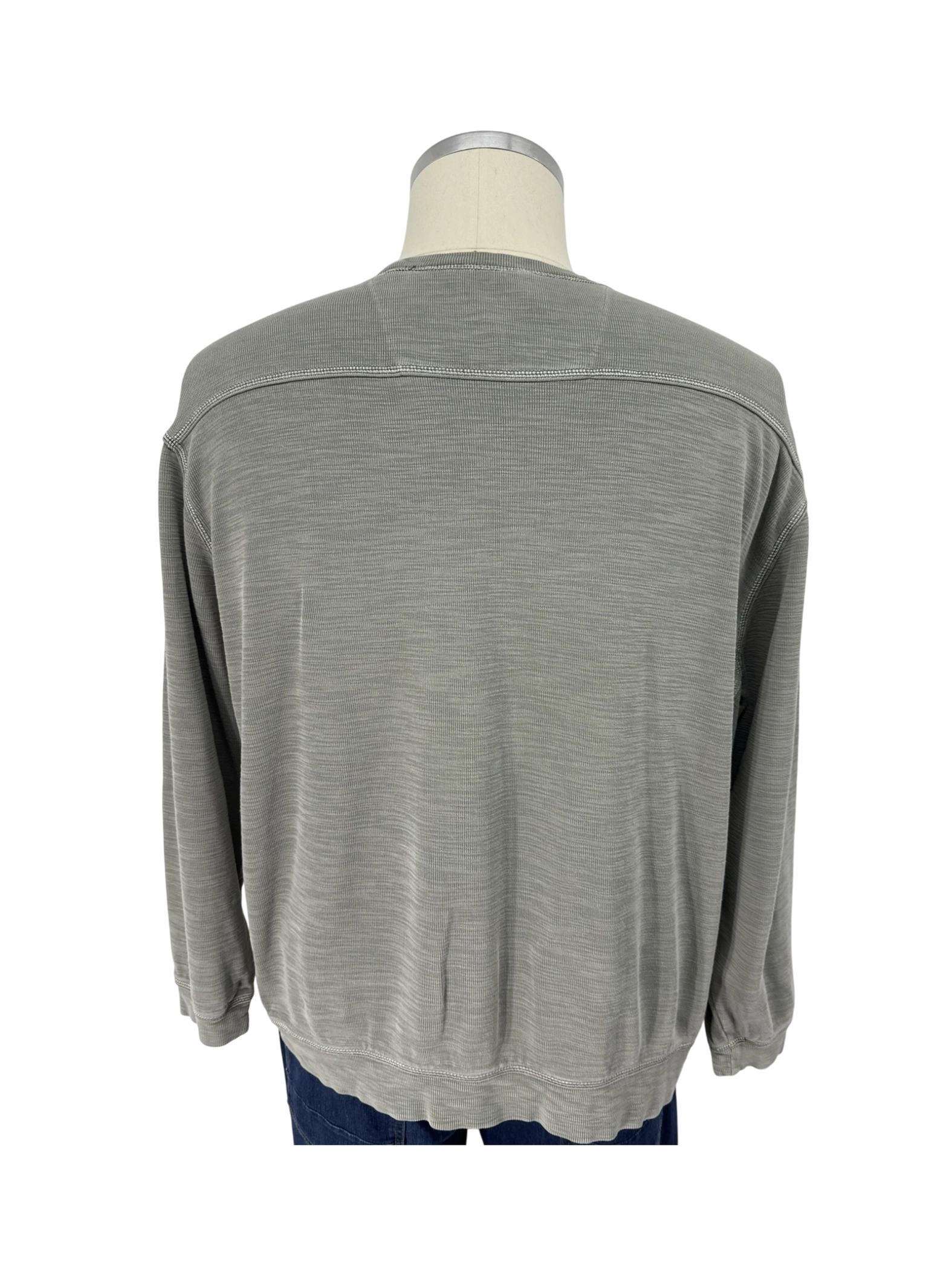 Elevate your casual wardrobe with this pre-owned Tommy Bahama sweater, perfect for cooler weather. Crafted from a comfortable blend of cotton and Tencel, this sweater offers a relaxed fit and a classic crew neck. The subtle gray color makes it easy to pair with various outfits, while the long sleeves provide added warmth. Ideal for layering, this sweater is a versatile addition to any man's closet.