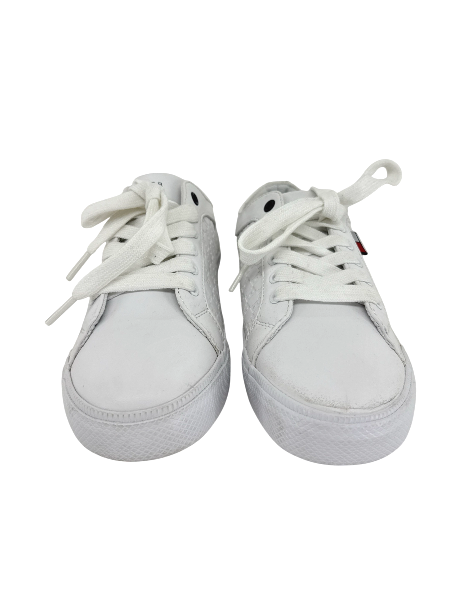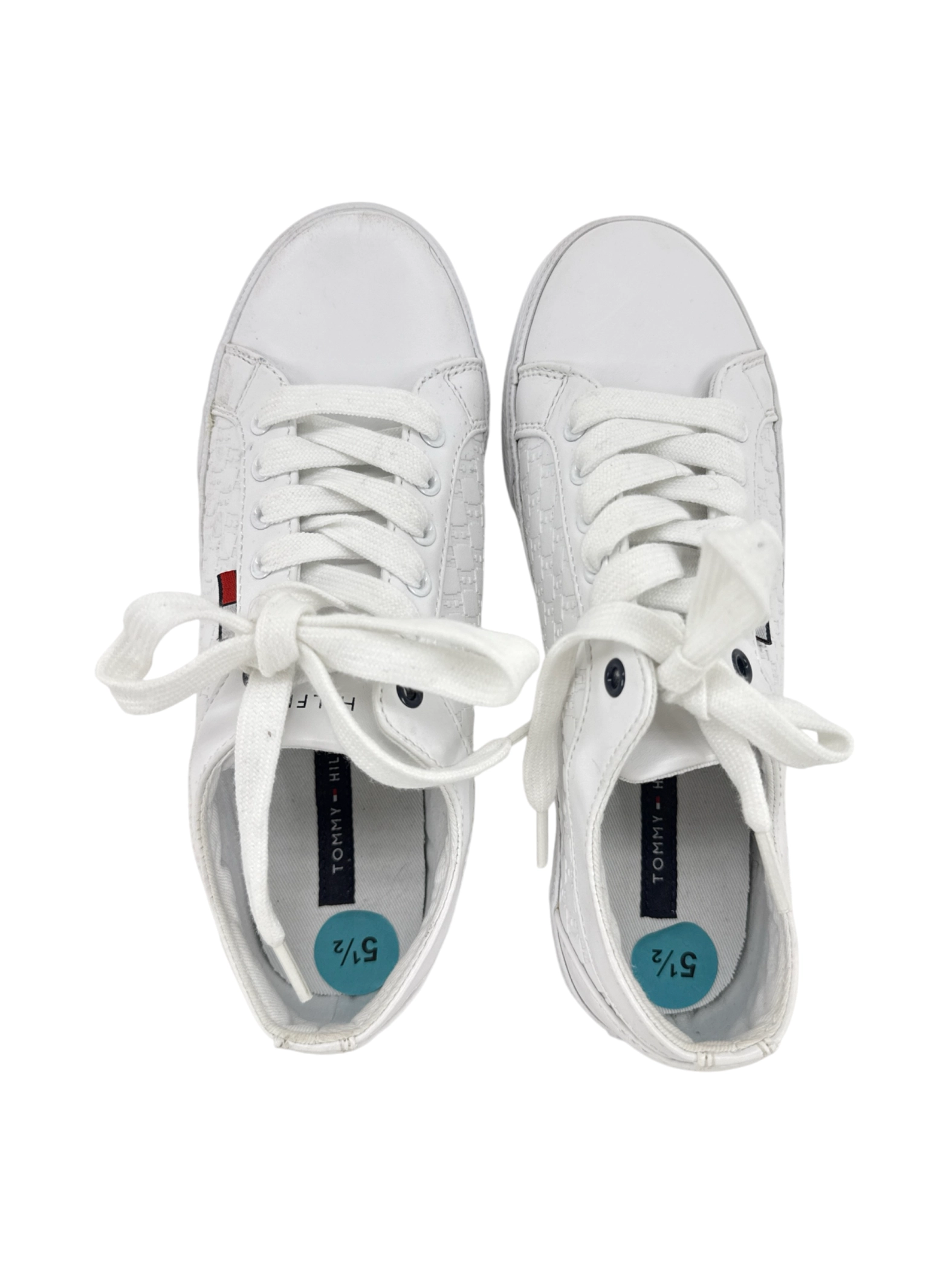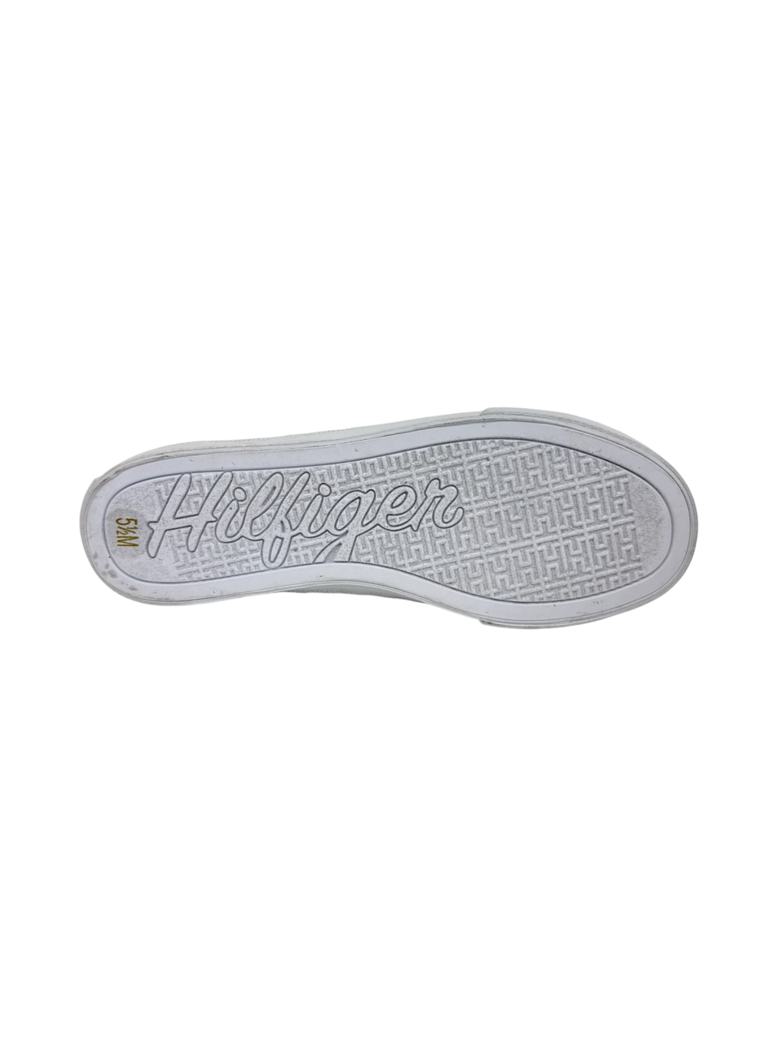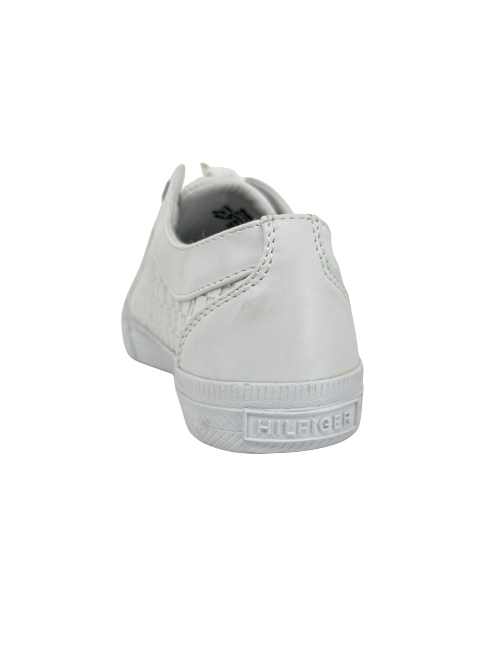 These pre-owned Tommy Hilfiger sneakers for women are a stylish and versatile choice. They feature a classic white design, perfect for any outfit. The shoes are made from quality materials for durability and comfort. Ideal for casual wear or adding a sporty touch to your look, these sneakers are a great addition to any wardrobe. They are perfect for everyday wear, running errands, or a casual day out.