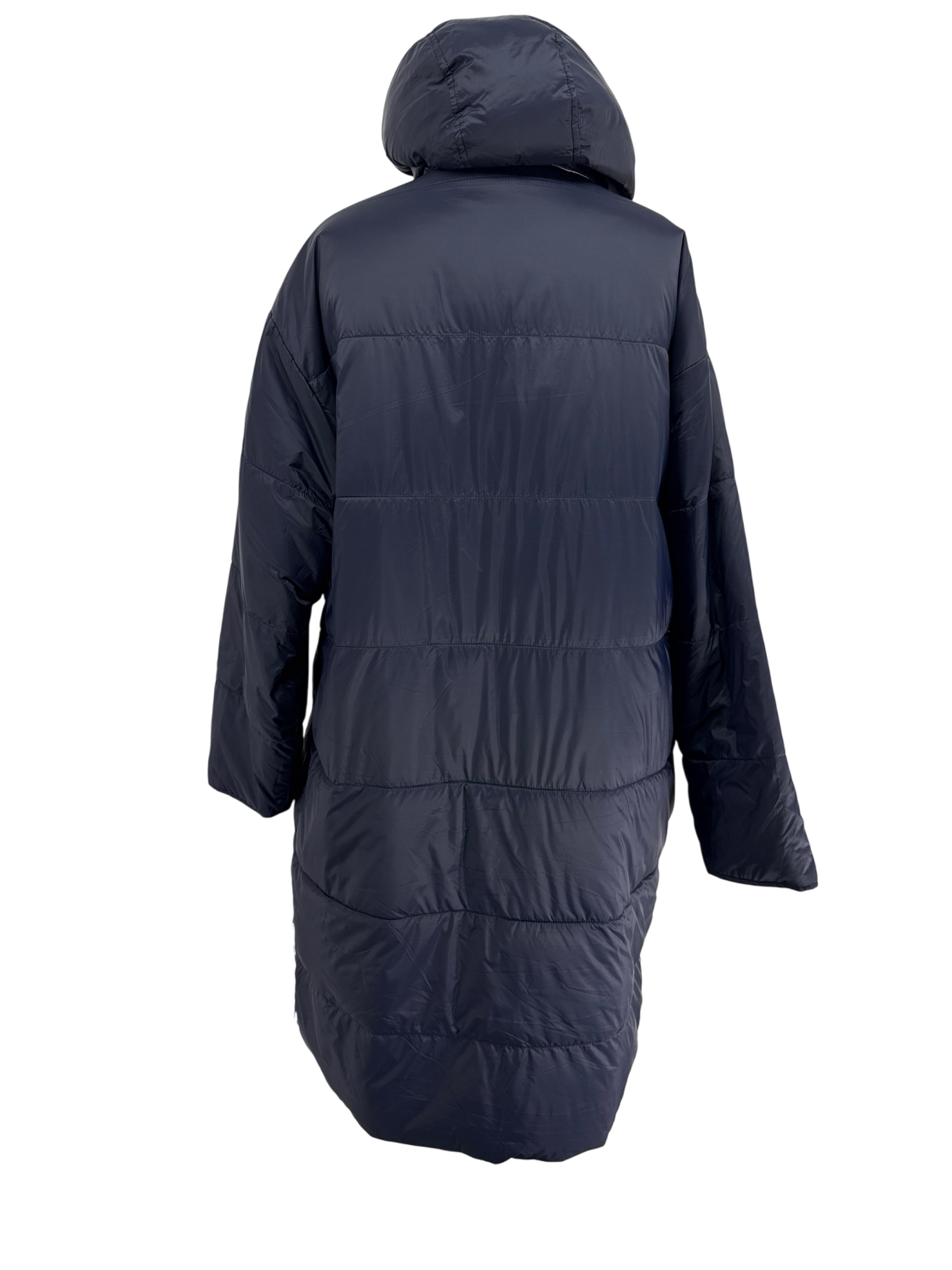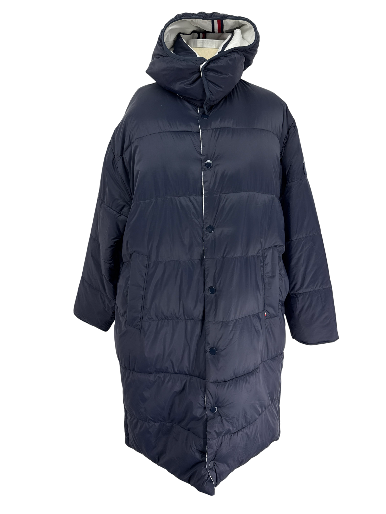 Stay warm and stylish this winter with this pre-owned Tommy Hilfiger puffer coat. This navy blue coat, in size S, features a cozy hood and a flattering long length. Crafted from durable polyester, this coat is designed for both comfort and style. Perfect for chilly days, this coat is a must-have addition to your wardrobe.