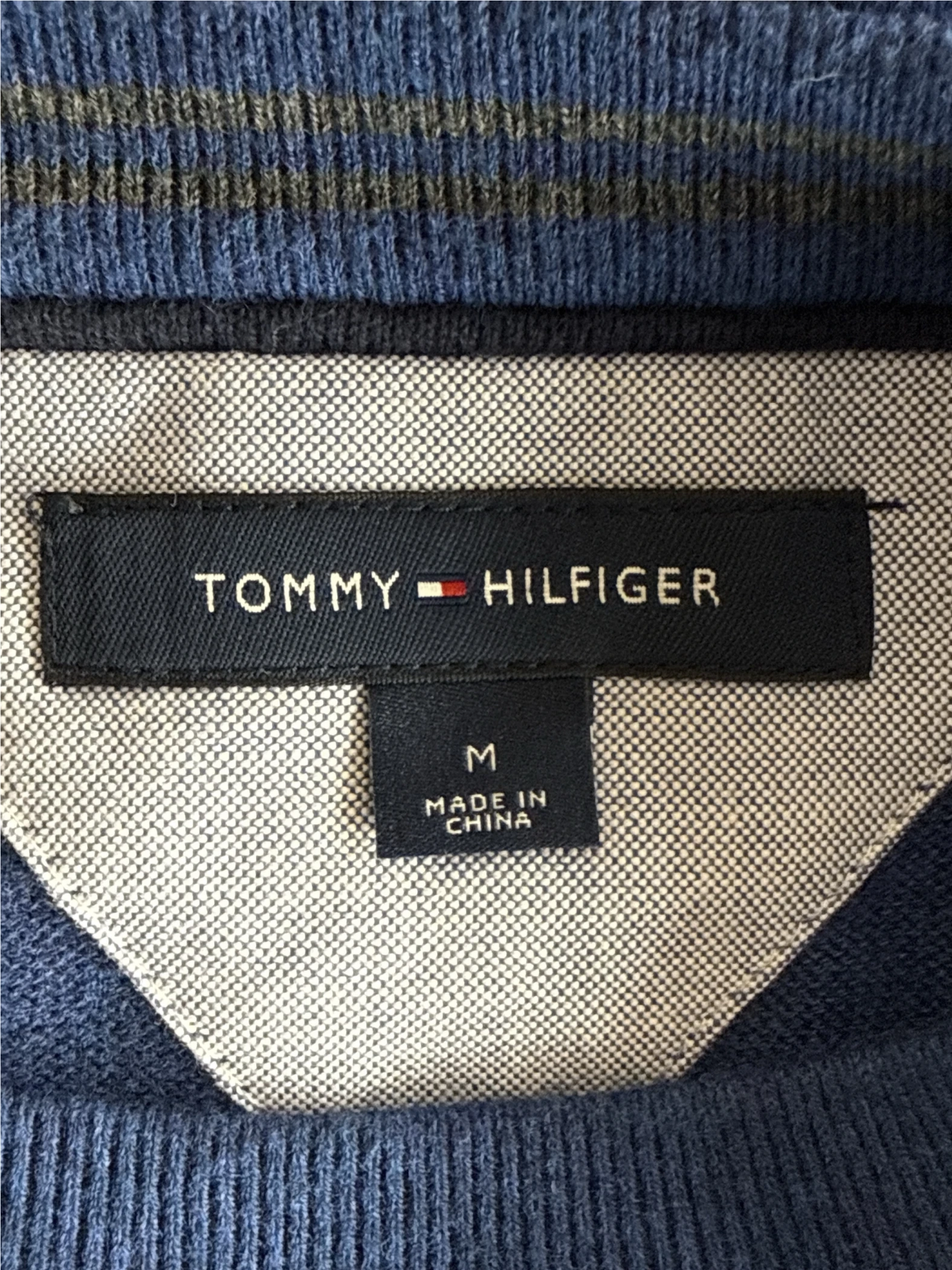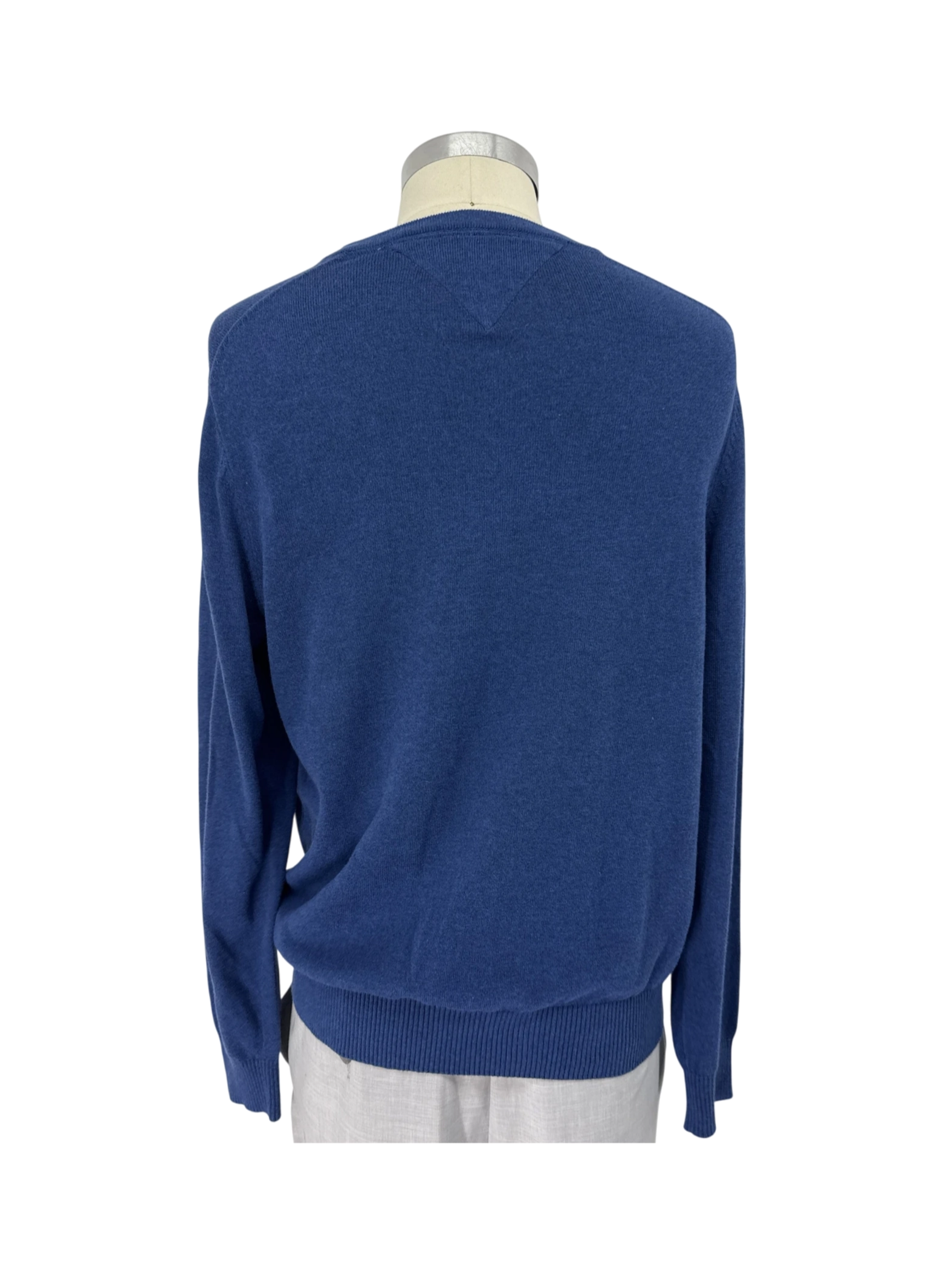 Elevate your wardrobe with this classic Tommy Hilfiger V-neck sweater. Made from soft, breathable cotton, it offers both comfort and style. The versatile navy blue color makes it a perfect layering piece for any season. This pre-owned sweater showcases the iconic Tommy Hilfiger logo, making it a timeless addition to your collection.