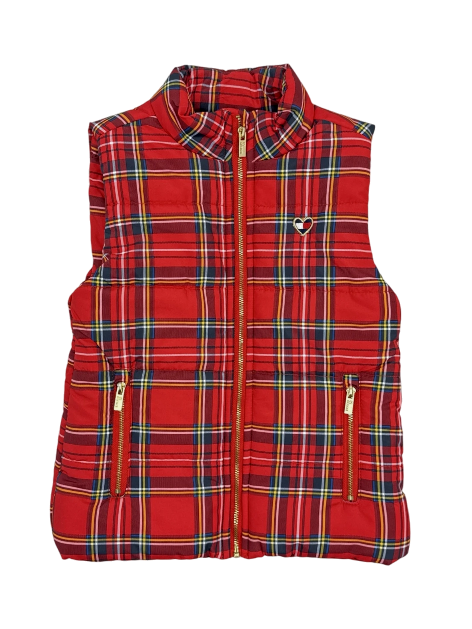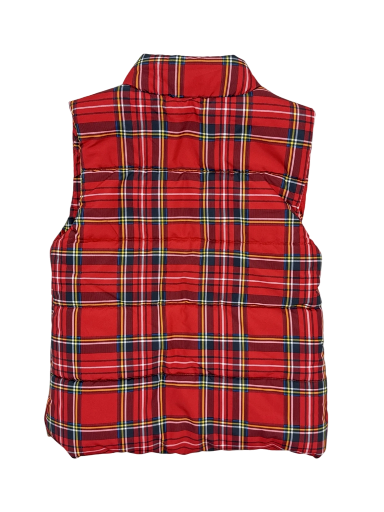 This pre-owned Tommy Hilfiger puffer vest is a stylish and cozy outerwear piece for girls. Featuring a vibrant red plaid pattern, the vest adds a pop of color to any outfit. With a full zipper closure and a comfortable design, it's perfect for layering during colder months. Crafted from high-quality materials, this vest ensures both warmth and durability. It's a great addition to any girl's wardrobe for both style and functionality.