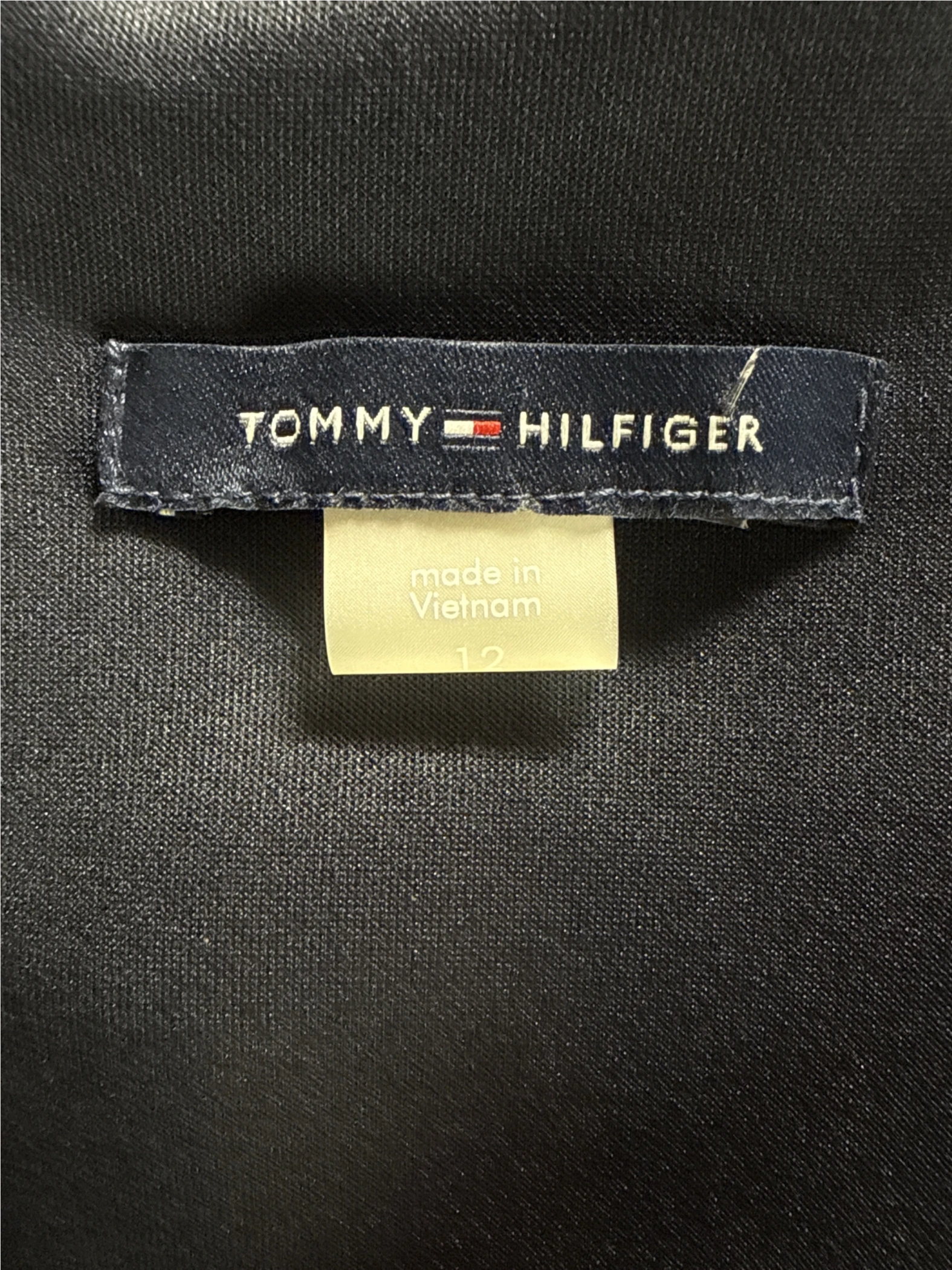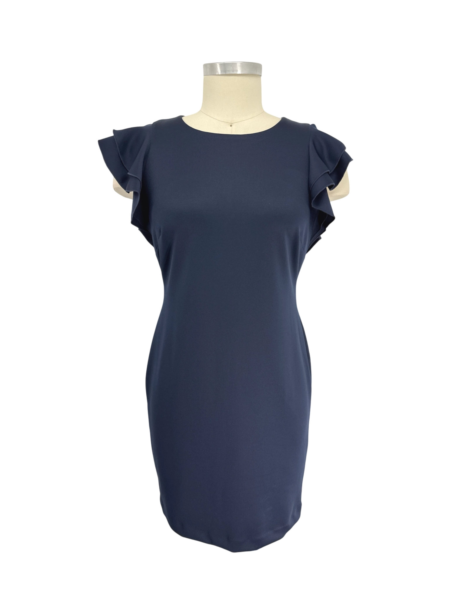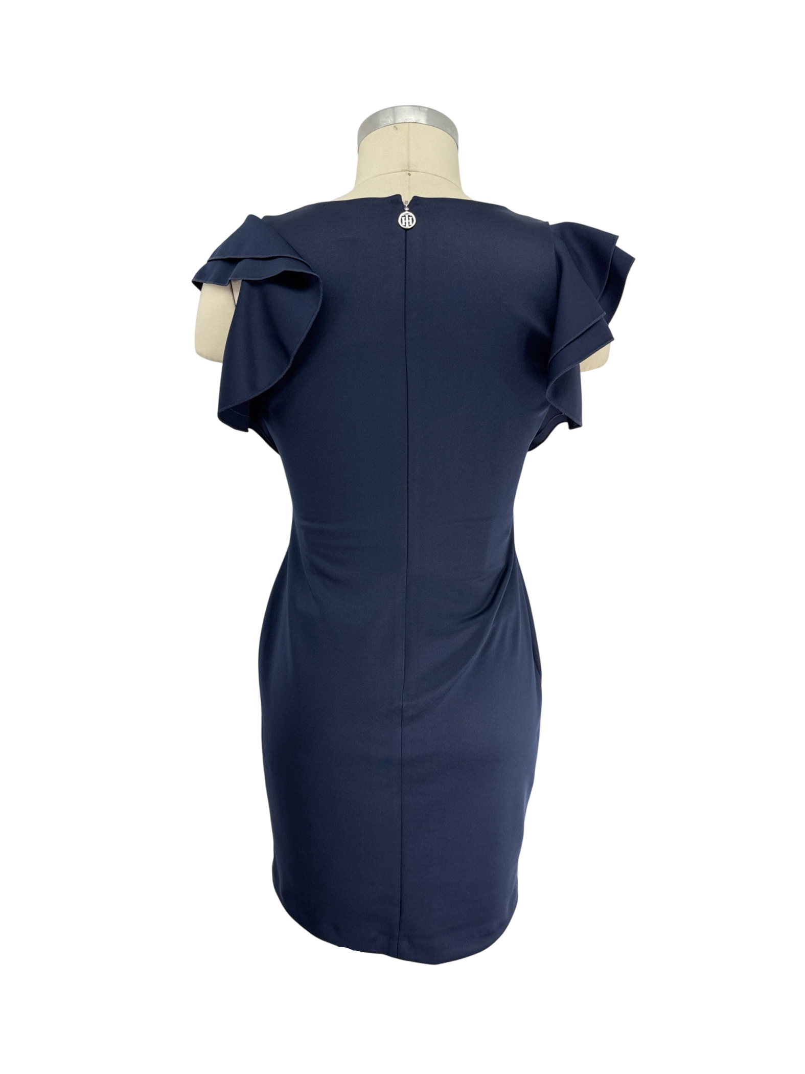 Elevate your wardrobe with this stylish pre-owned Tommy Hilfiger sheath dress. This dress features a classic silhouette with a round neckline and short sleeves, perfect for a chic look. Made from a comfortable blend of polyester and spandex, this dress offers a flattering fit. Ideal for a cocktail party or a special occasion, this navy blue dress exudes timeless elegance.