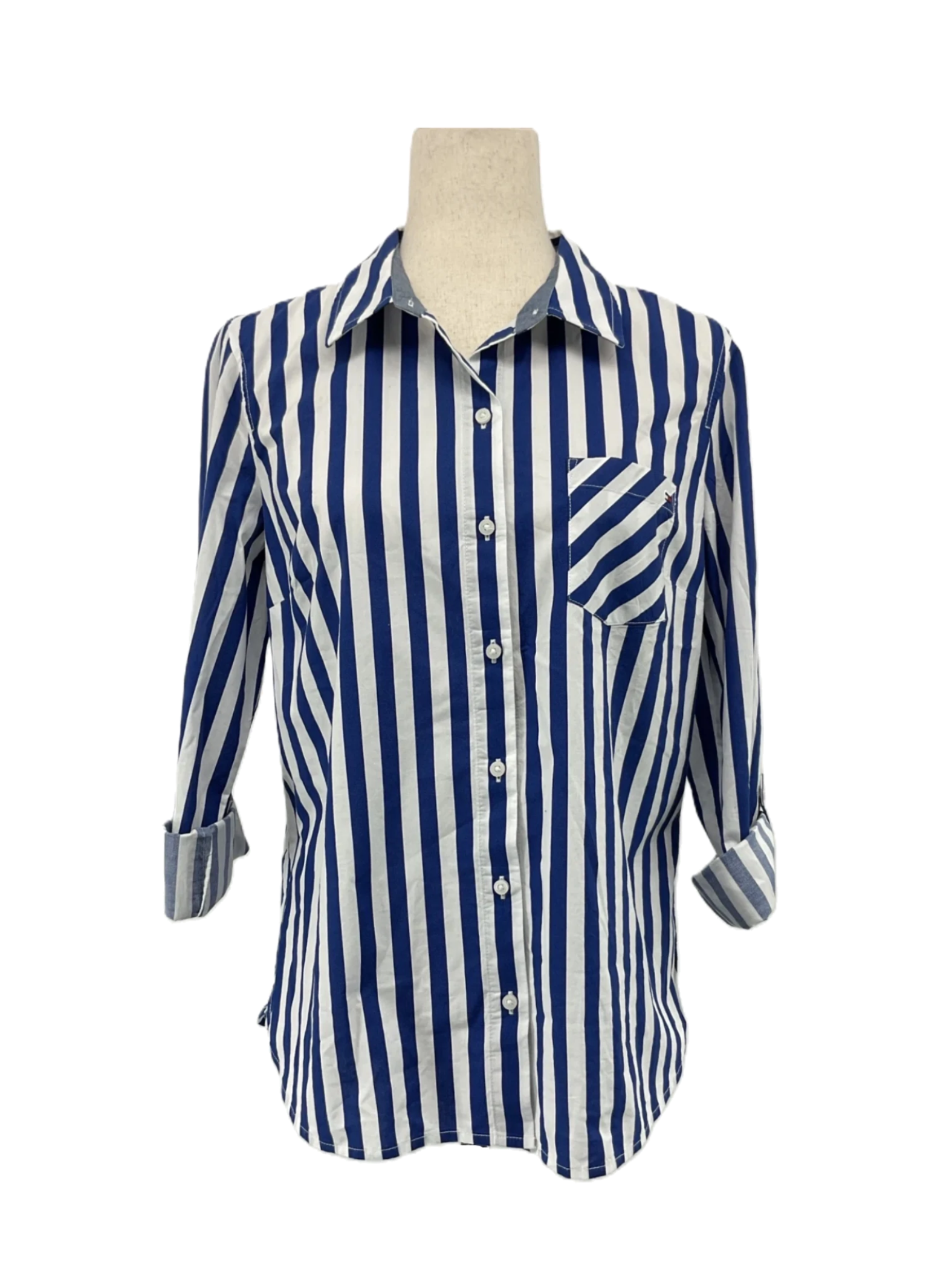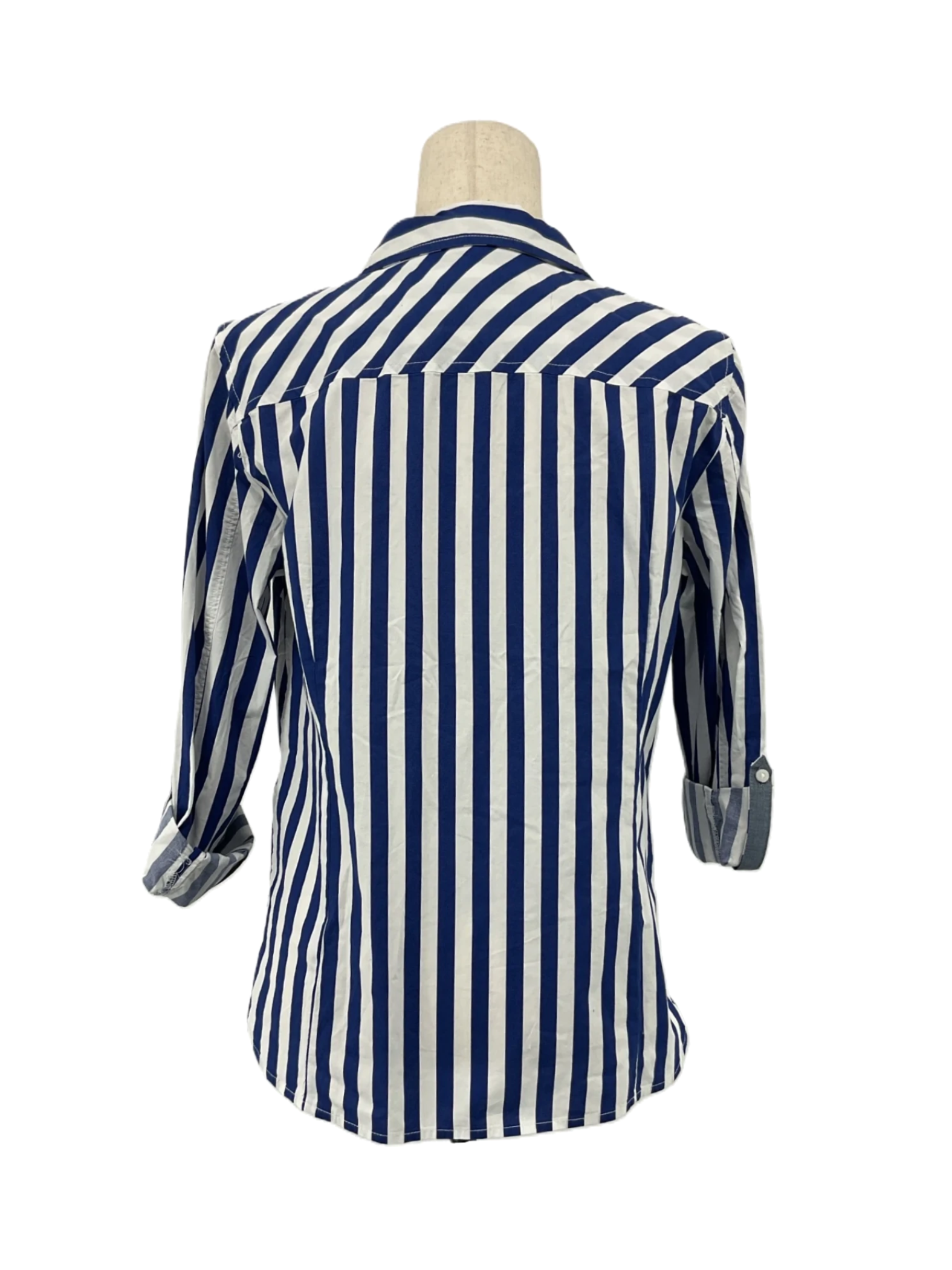 Medium-sized blue and white striped button-up long-sleeve casual shirt for women, suitable for business attire.