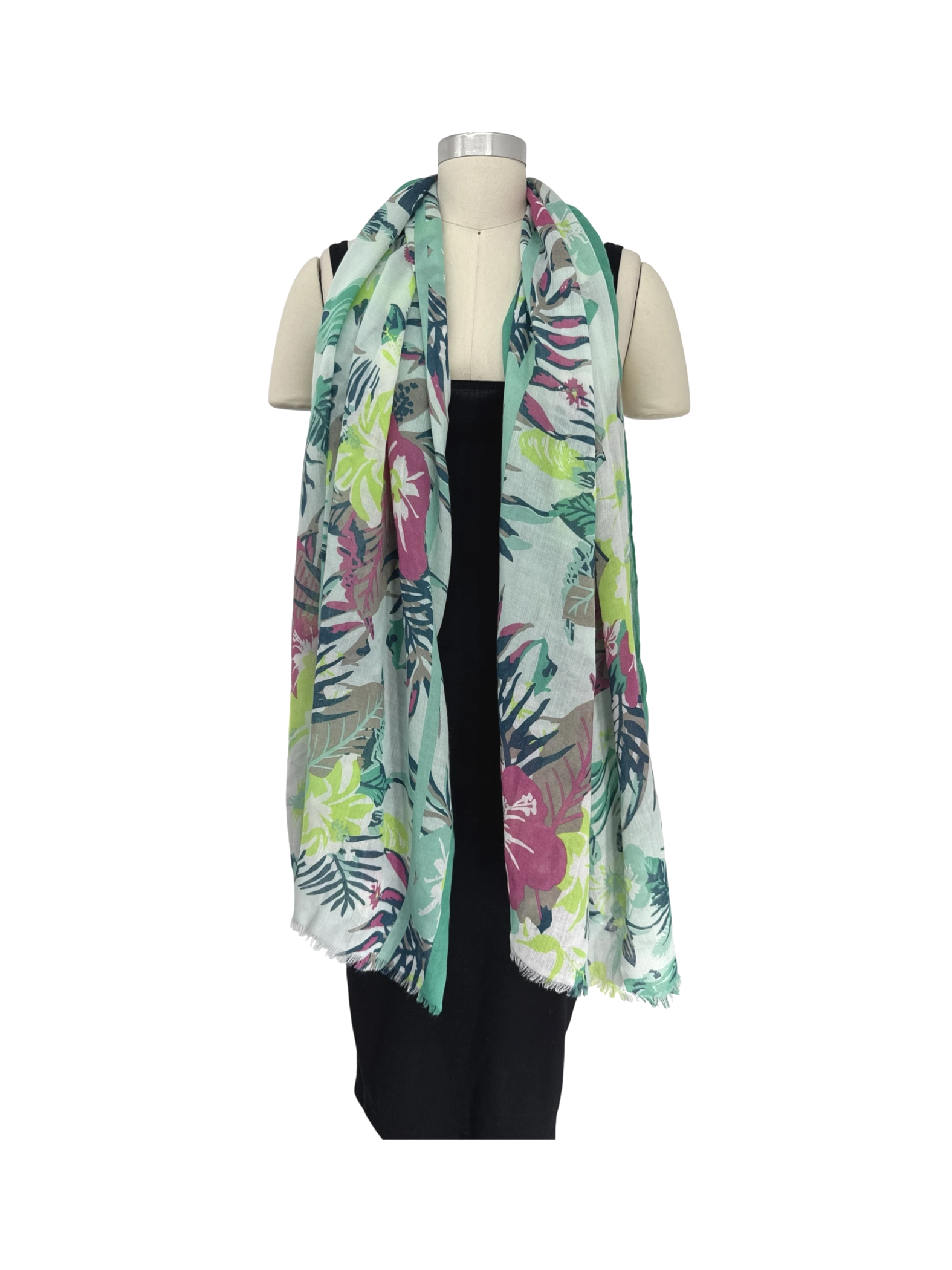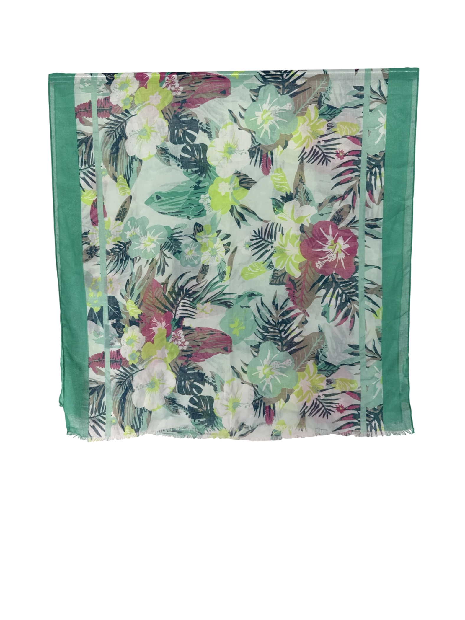 Embrace the essence of summer with this Top It Off floral scarf, a vibrant accessory perfect for adding a touch of flair to any outfit. This pre-owned scarf features a beautiful floral pattern with hues of green, pink and white. It’s made from lightweight, breezy polyester, ideal for warm weather, the scarf's generous size offers versatility in styling, whether draped around your neck or across your shoulders.