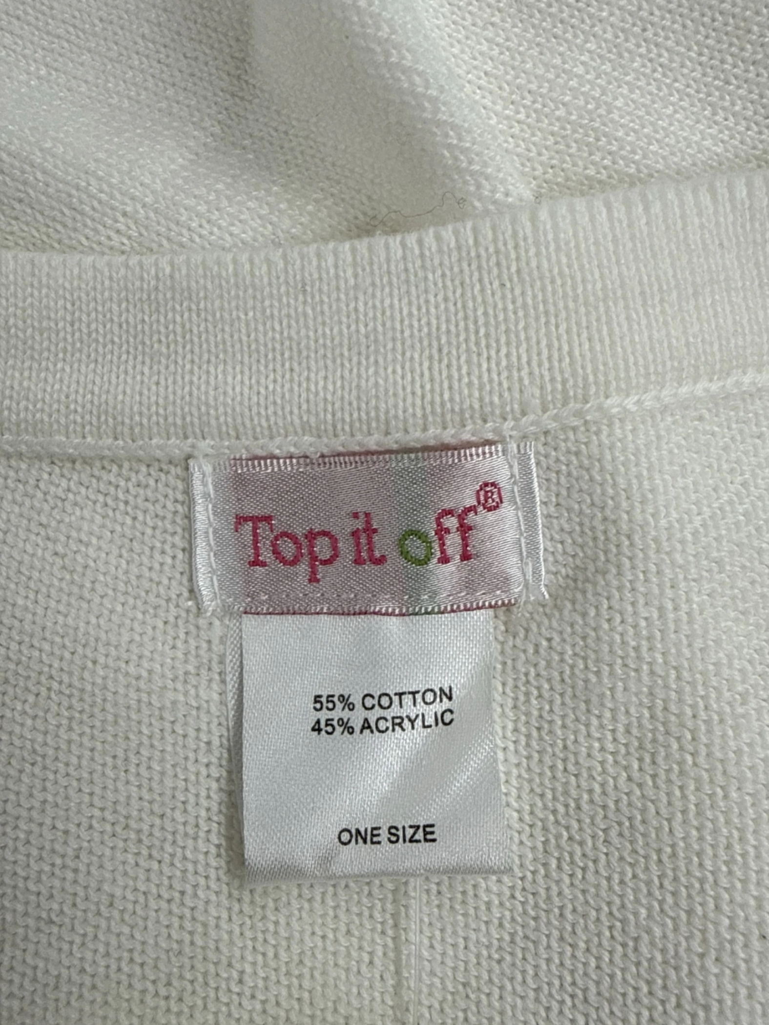 This stylish pre-owned poncho from Top it off is a perfect addition to any wardrobe. The white color and simple design make it easy to pair with various outfits. Crafted from a comfortable blend of cotton and acrylic, this poncho is perfect for layering during spring, summer and fall. The 'One Size' design offers a relaxed and comfortable fit, making it a versatile choice. The number '22308' adds a unique touch. Elevate your everyday style with this chic and cozy poncho.