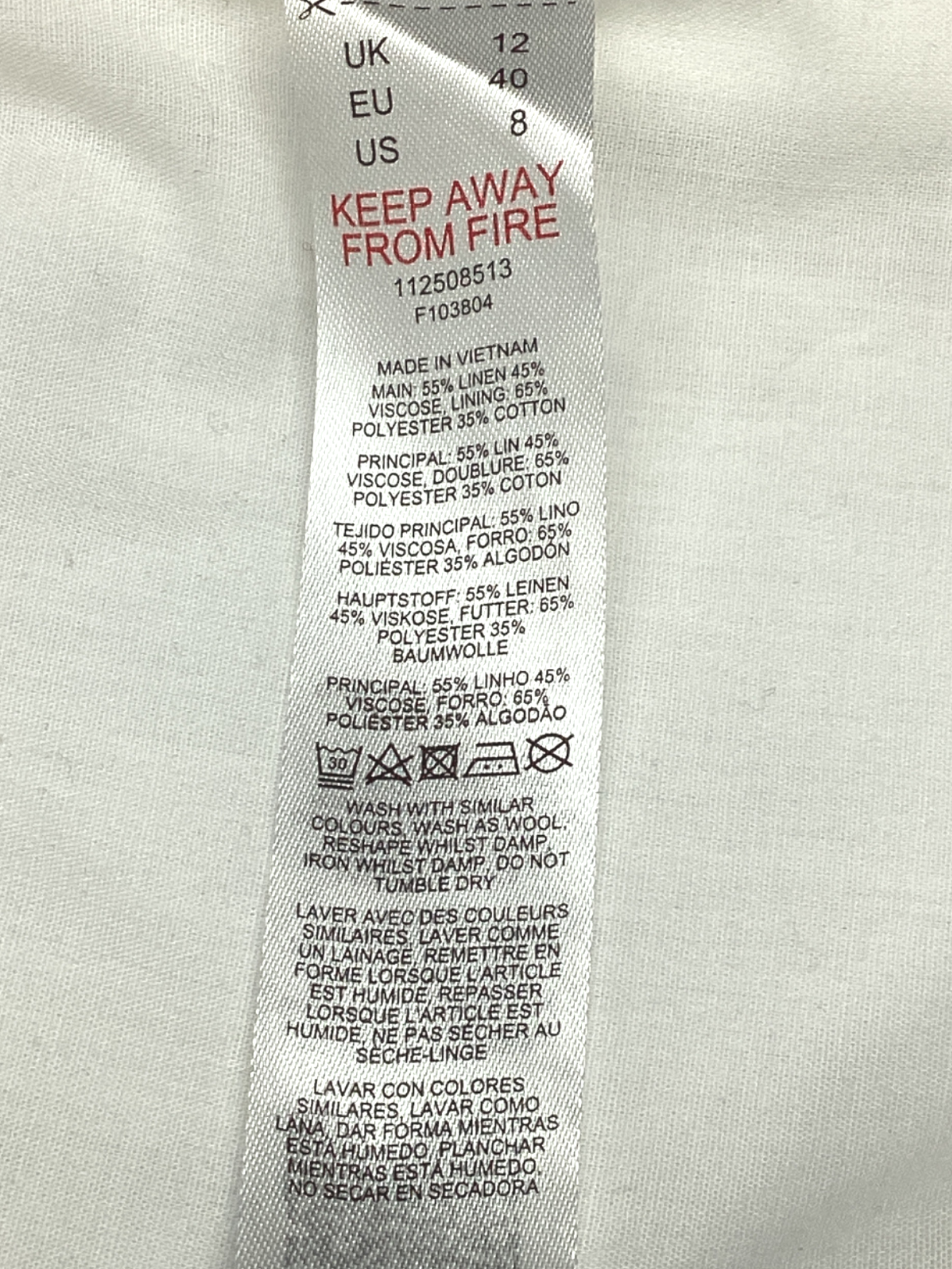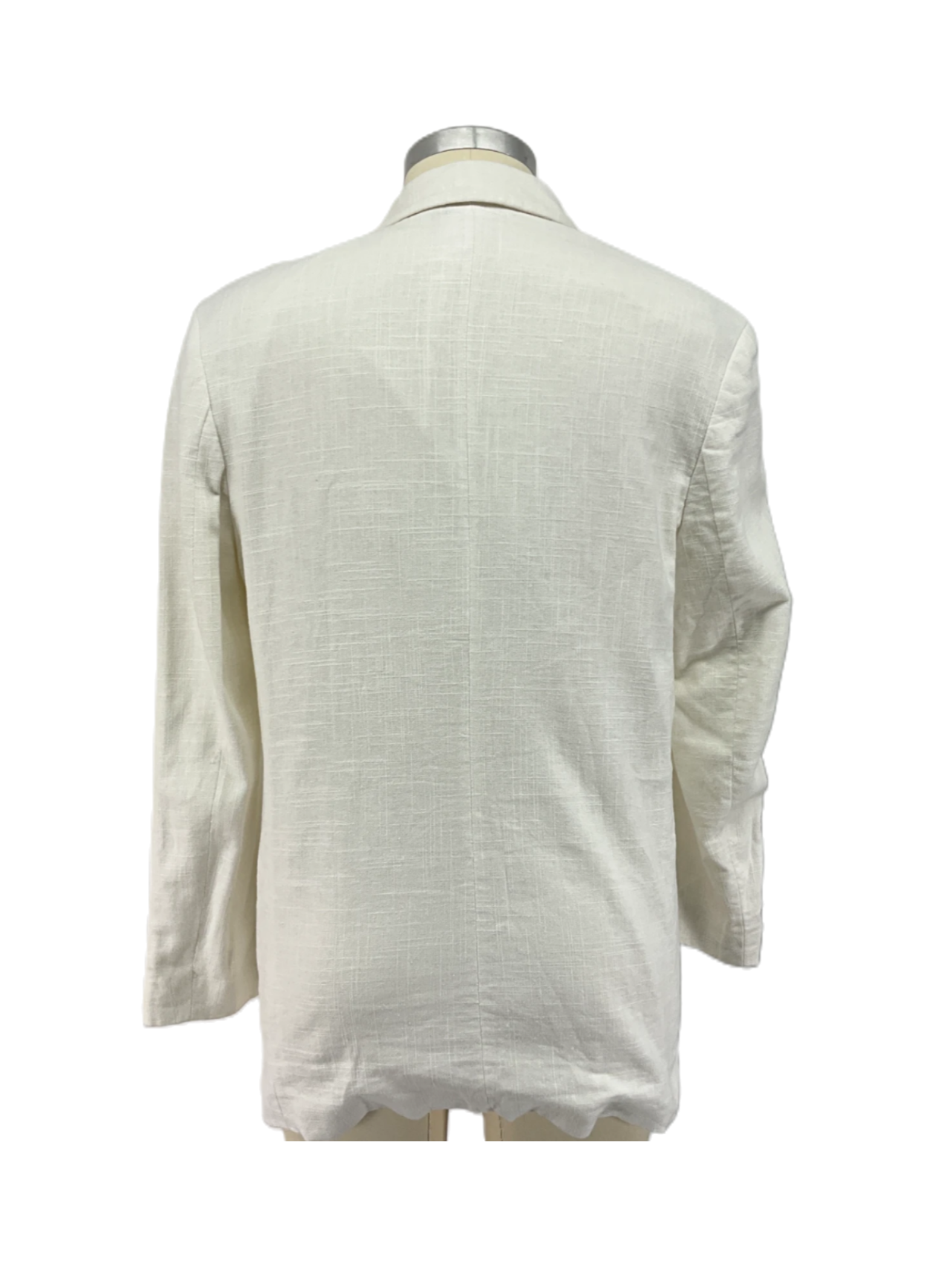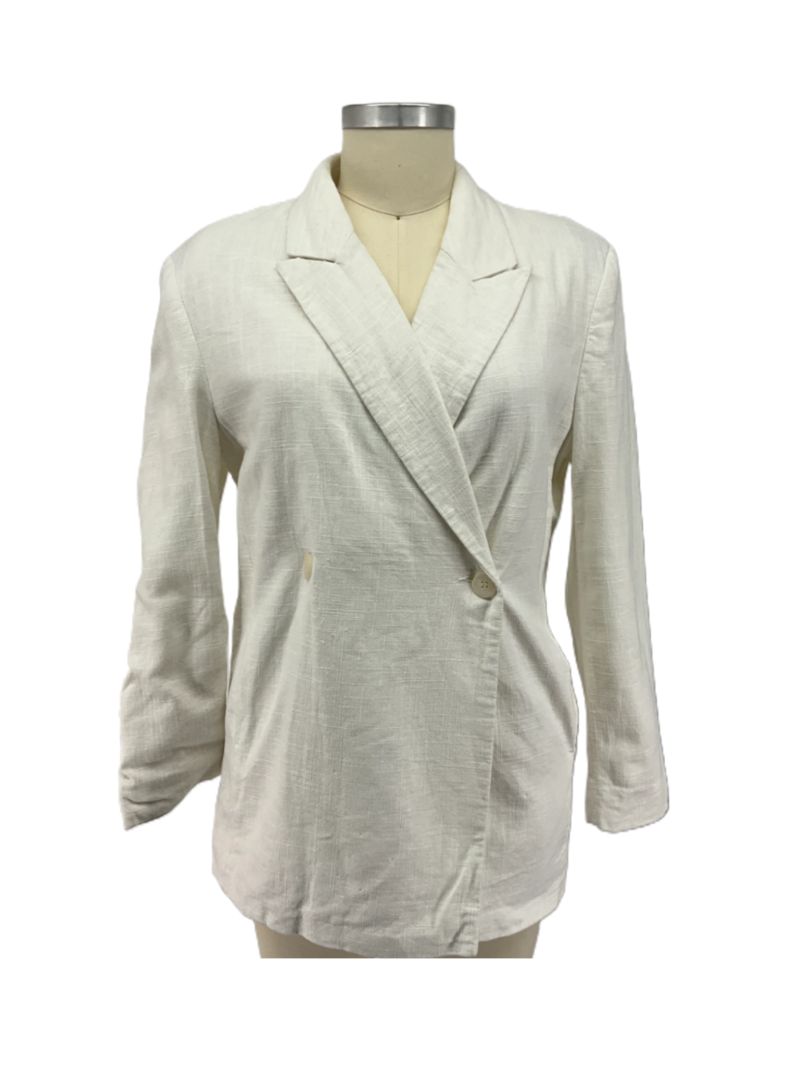 A white linen double-breasted blazer for women in size 8, with blemishes, suitable for weekend wear.