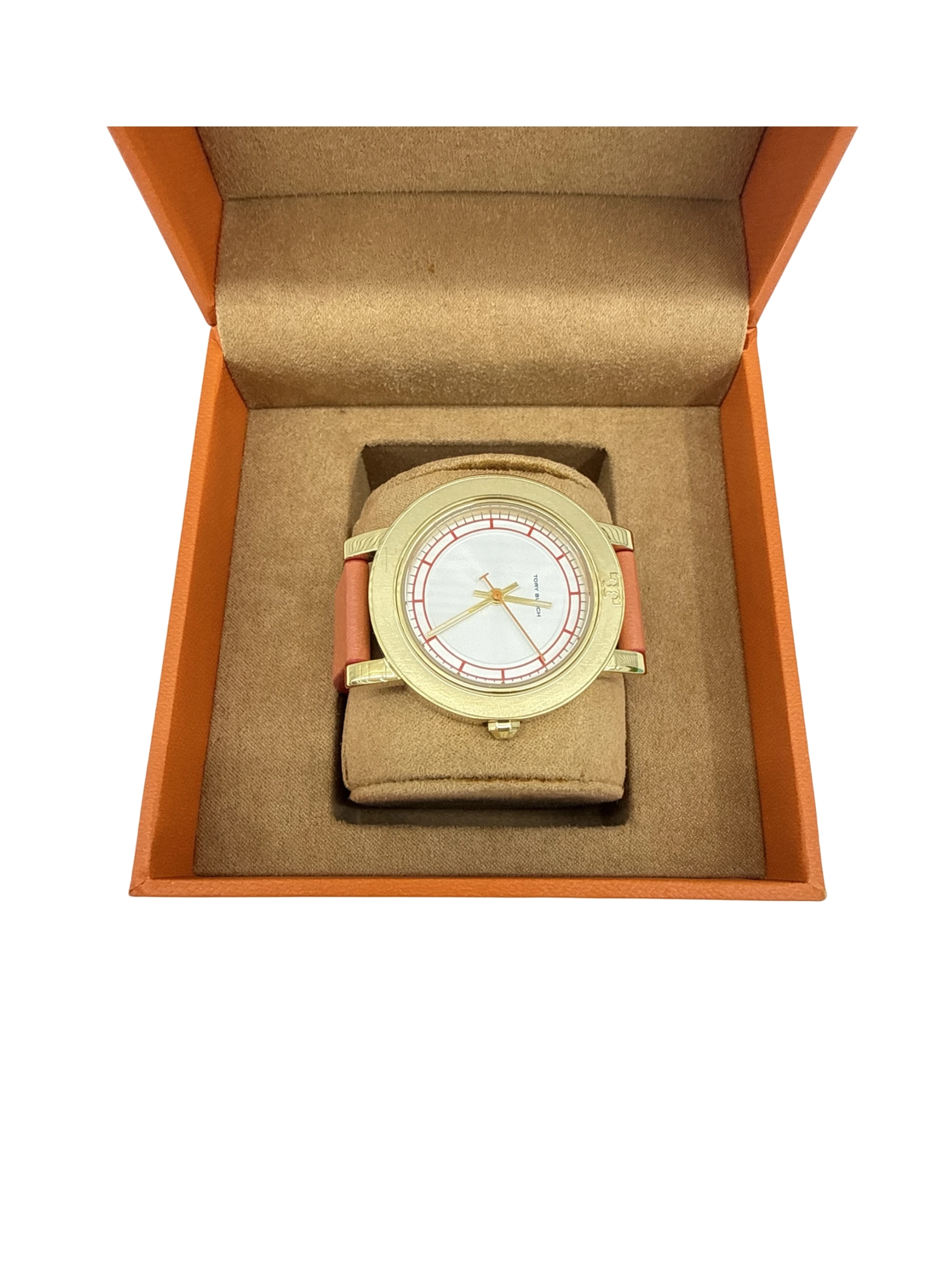 Pre-owned Tory Burch watch. This elegant timepiece features a gold-tone case and a vibrant pink leather strap, showcasing a stylish and sophisticated look. The watch presents a clean, minimalist dial design, ensuring easy time reading. Perfect for daily wear or special occasions, the Tory Burch watch blends fashion and function seamlessly. A gently used, yet well-maintained accessory for those who appreciate quality and design.