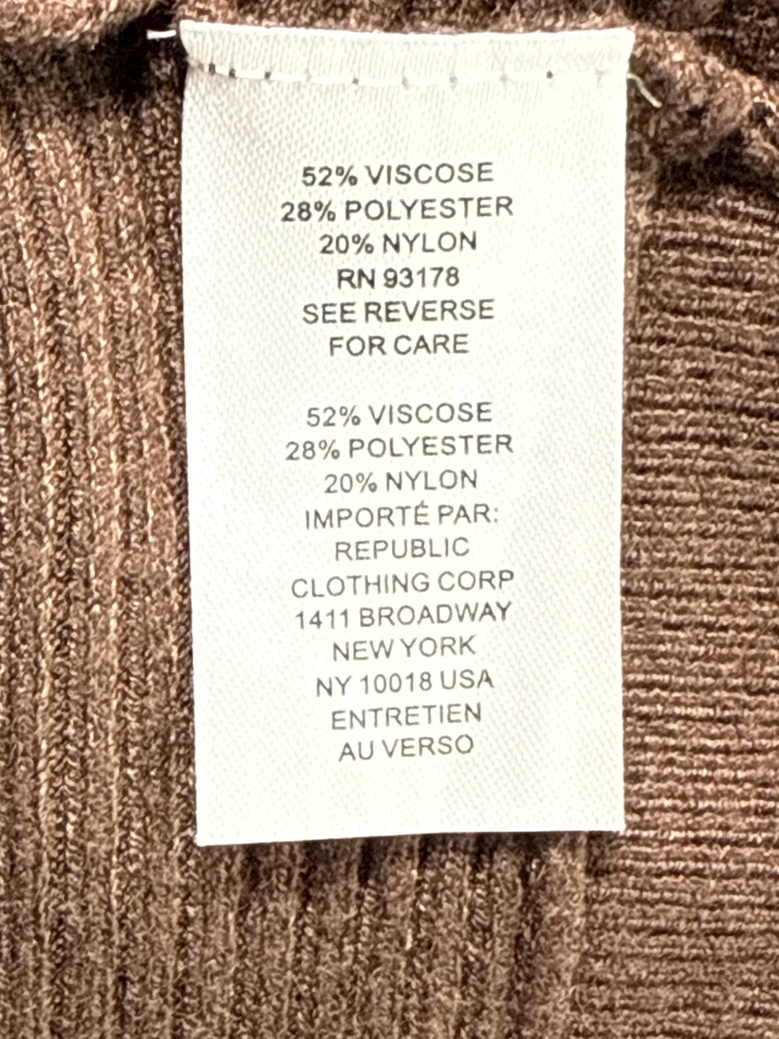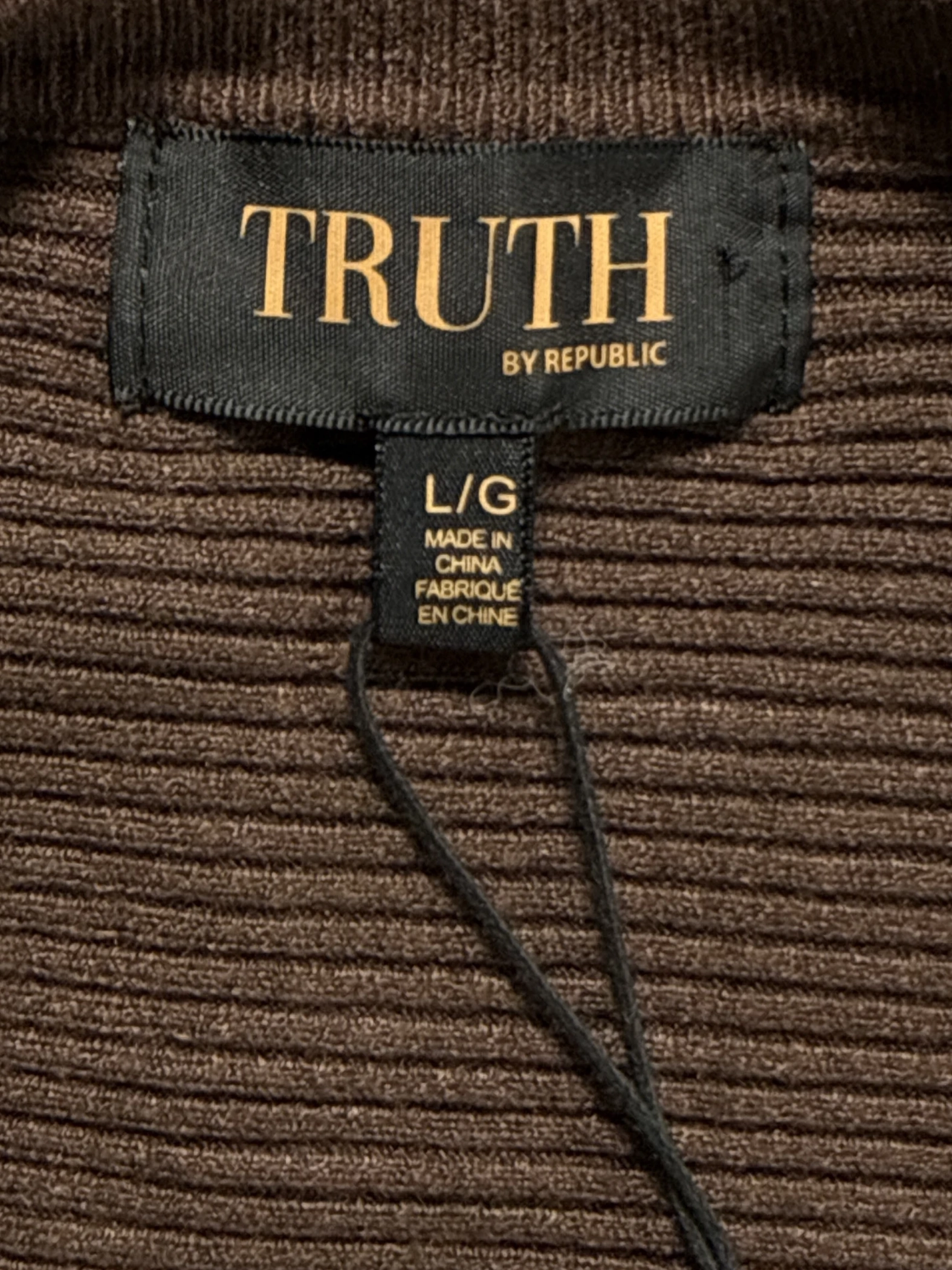 This pre-owned Truth by Republic cardigan sweater is a stylish and comfortable addition to any wardrobe. Crafted from a soft blend of viscose, polyester, and nylon, this button-up sweater offers a flattering V-neck and a rich brown color. Perfect for fall or winter, this cardigan is versatile enough to be dressed up or down. A classic piece that adds warmth and sophistication to your outfit. Get yours now and enjoy a premium quality at an affordable price.