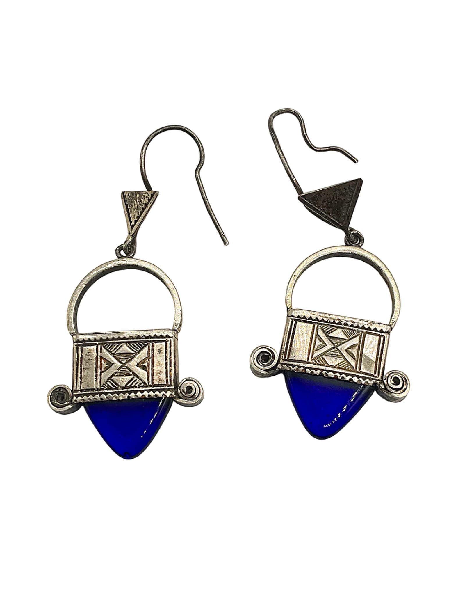 The earring is made of silver-toned metal and has a hook-style closure. It features geometric patterns and spiral details, with a triangular piece connecting the hook to the main body of the earring. The lower part of the earring is decorated with a deep blue triangular piece, possibly made of glass or stone.