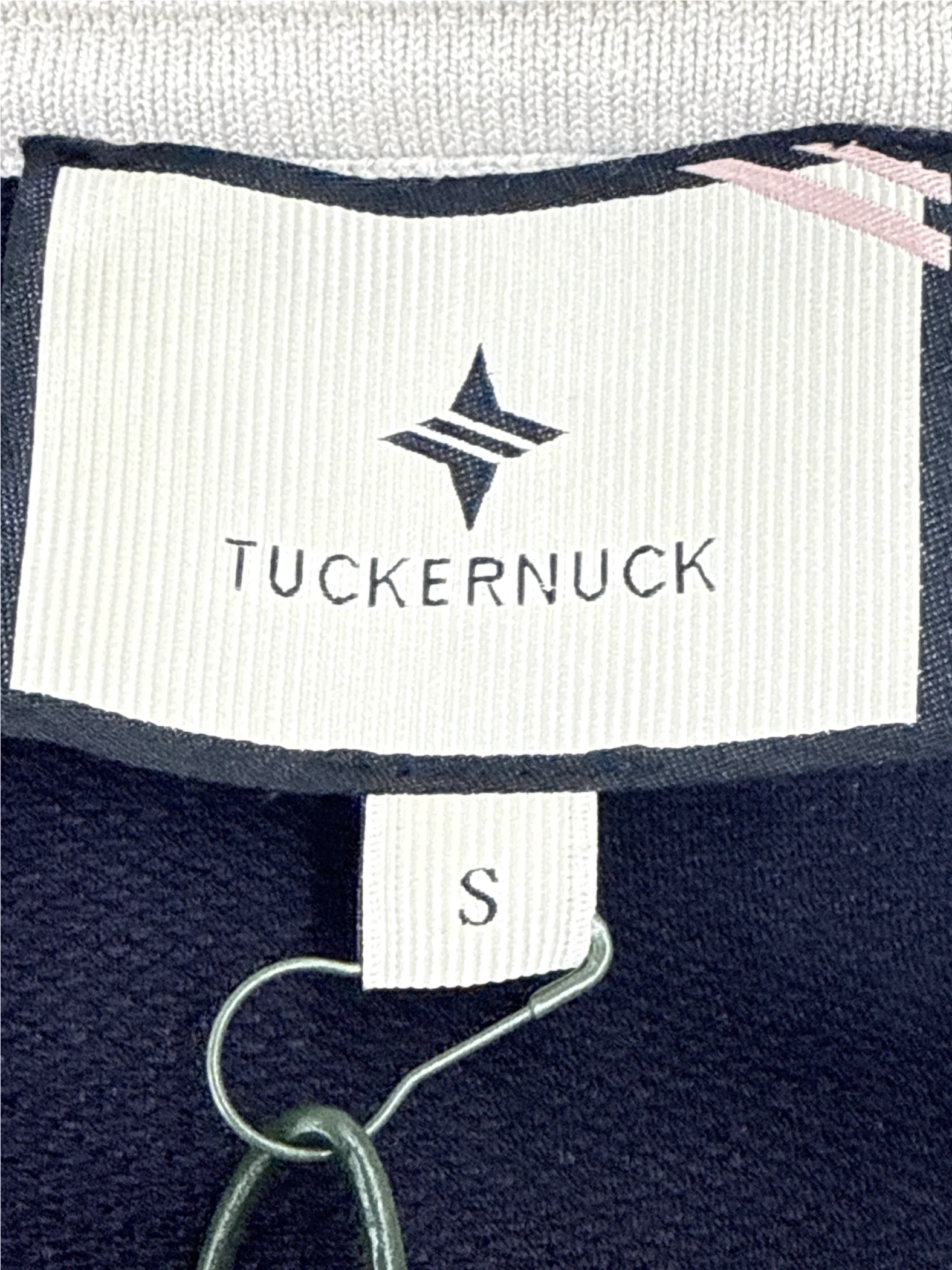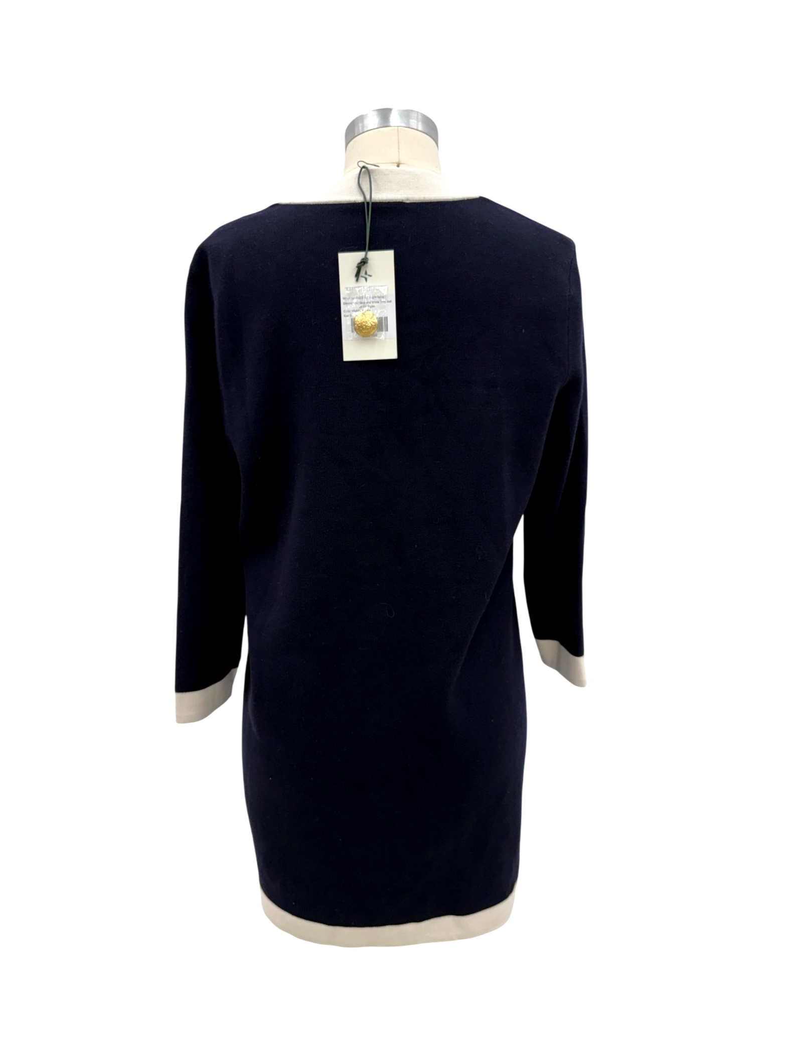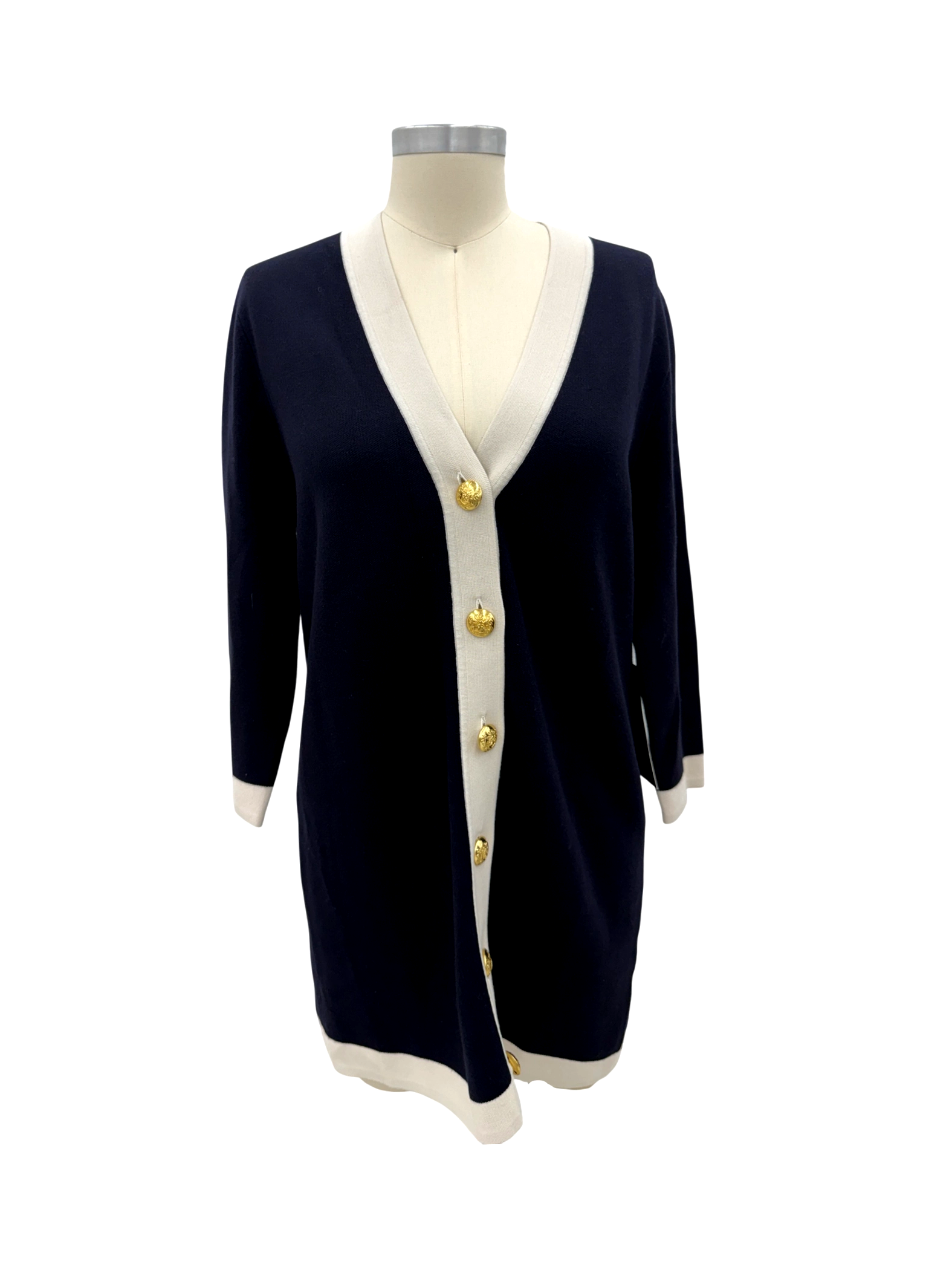 This chic Tuckernuck cardigan is the perfect addition to any wardrobe. Featuring a classic navy blue and white color block design, this sweater is versatile for both work and casual wear. The V-neck and button-up closure offer a polished look, while the soft viscose and nylon blend provides comfort and warmth. A pre-owned piece, this cardigan offers timeless style and sophistication.