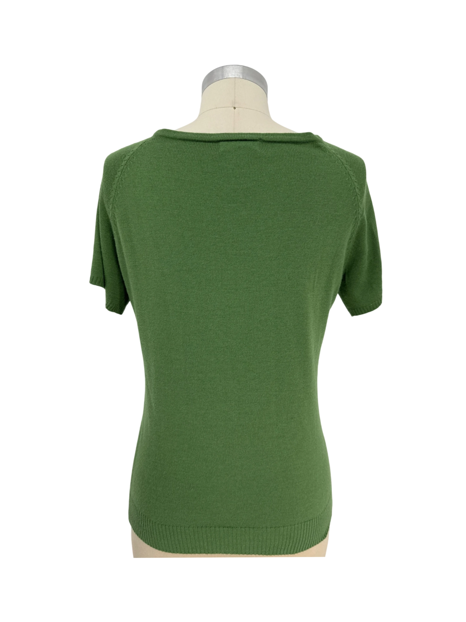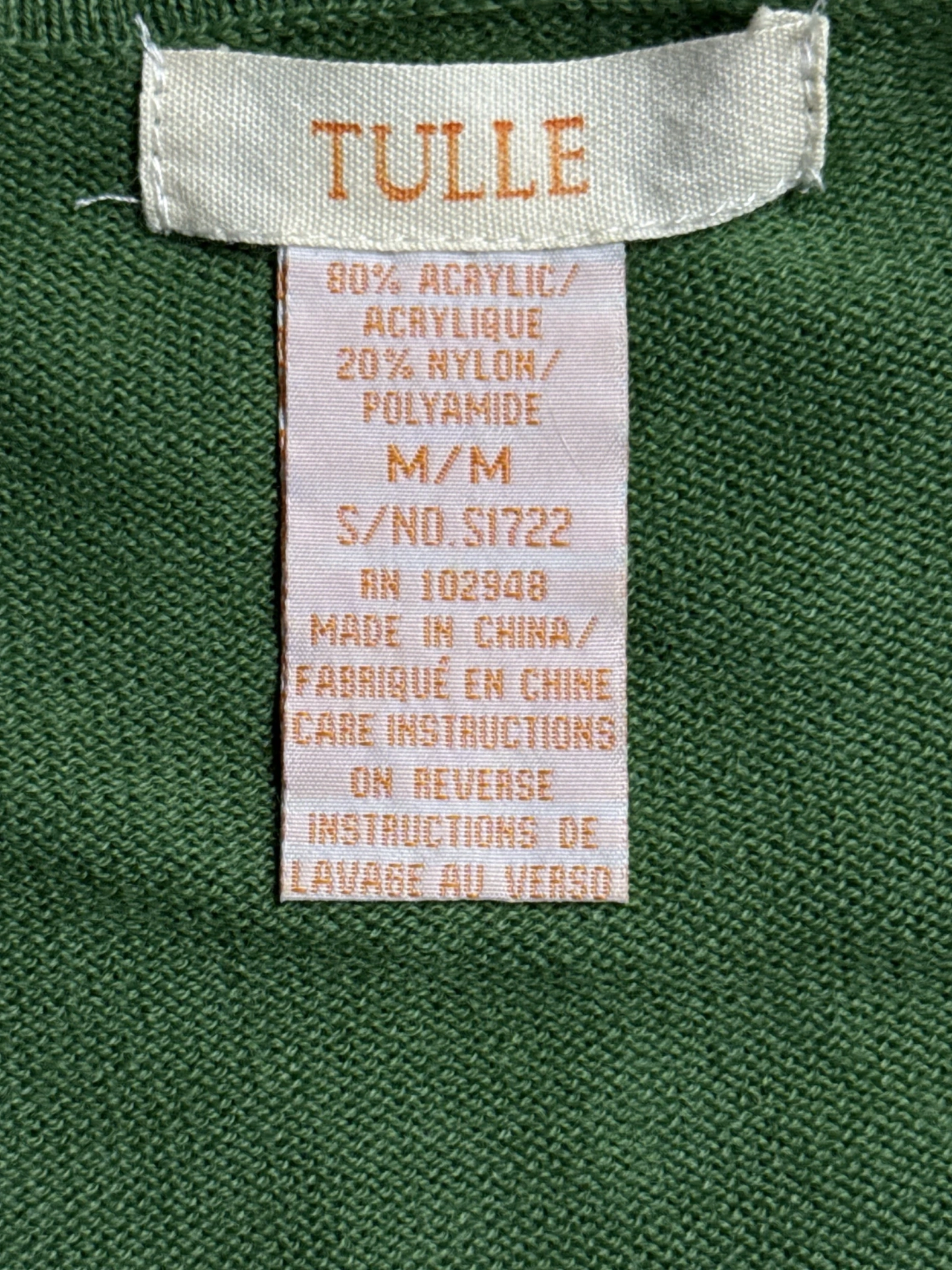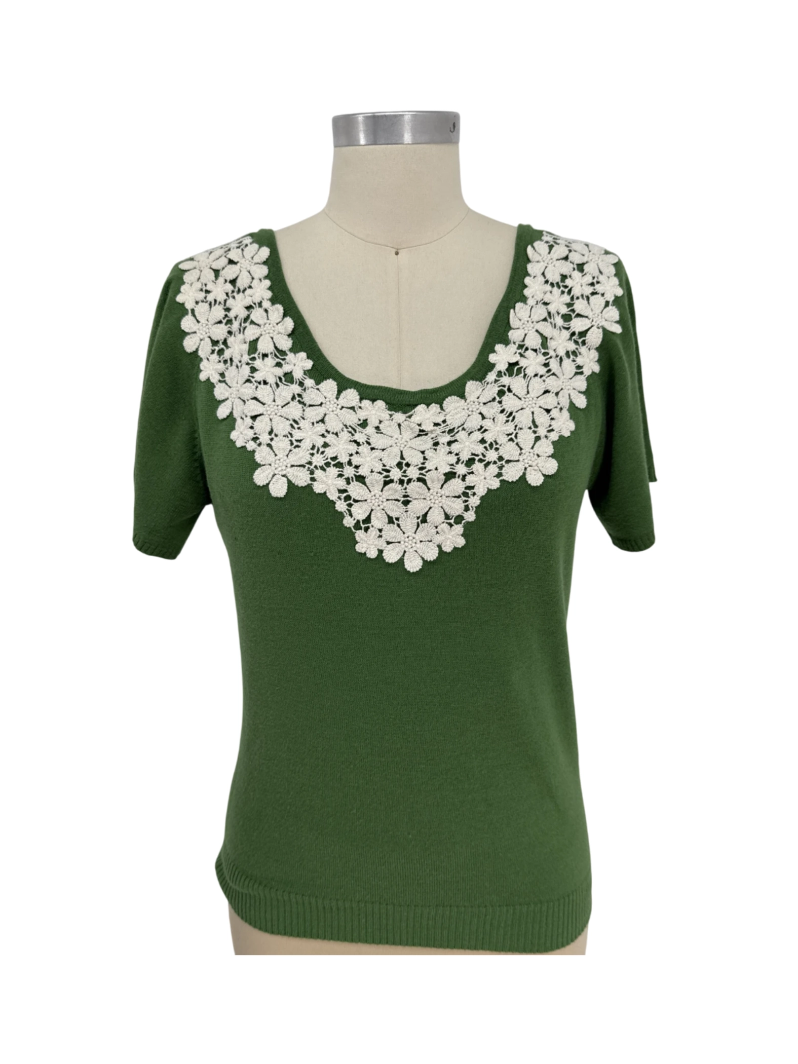 Elevate your wardrobe with this pre-owned TULLE sweater. This chic top features a delicate white lace trim around the neckline, creating a refined, feminine touch. Made with a blend of acrylic and nylon, the sweater offers a comfortable fit and a sophisticated silhouette. The short sleeves make it perfect for warmer days. A perfect addition to any woman's wardrobe. Perfect for a casual day out or dressed up for the evening.