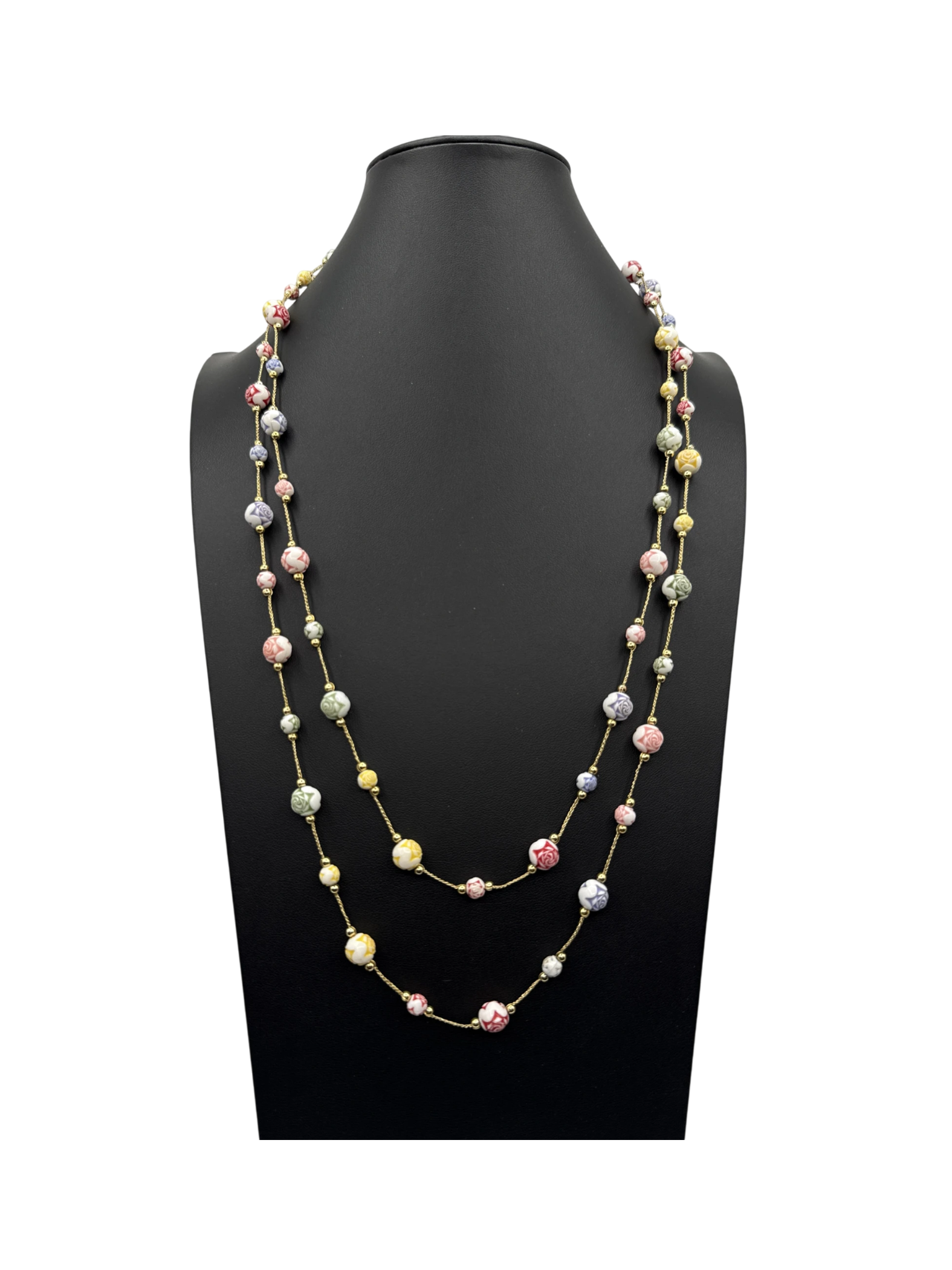The necklace features a dainty chain in a gold tone, with small gold beads scattered among the larger Millefiori beads. The Millefiori beads showcase a range of colors such as pink, blue, yellow, green, and red, each displaying a distinct floral pattern.