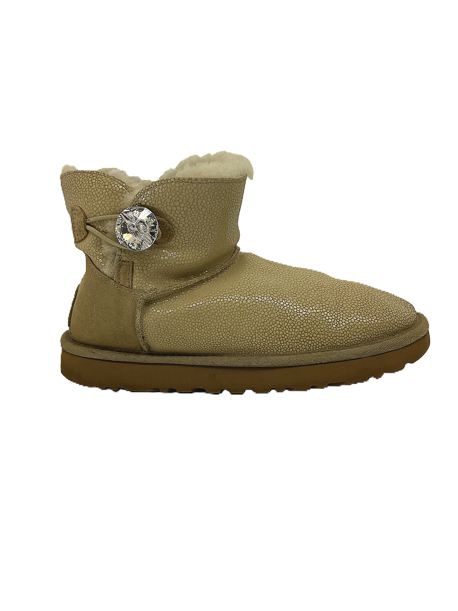 The beige Mini Bailey Button Bling Women’s Boots in size 7 have a blemish in the photo. Please refer to the photo for more details.