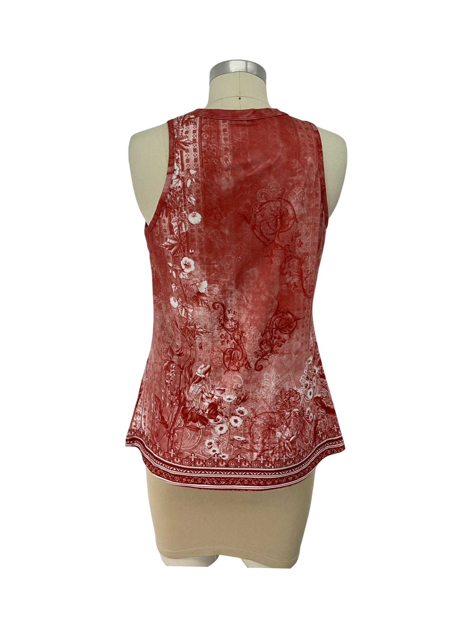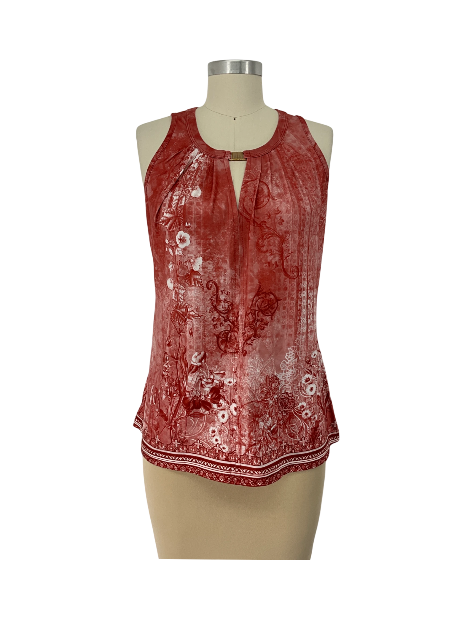 This pre-owned sleeveless top is a stylish addition to any wardrobe. Featuring a vibrant red floral pattern, it offers a chic and feminine look perfect for warmer seasons. Crafted from a blend of cotton and polyester, the top provides comfort and durability. Ideal for casual outings or layering under a jacket, this top is a versatile piece that can easily elevate your style. The unique design and flattering fit make it a standout choice.