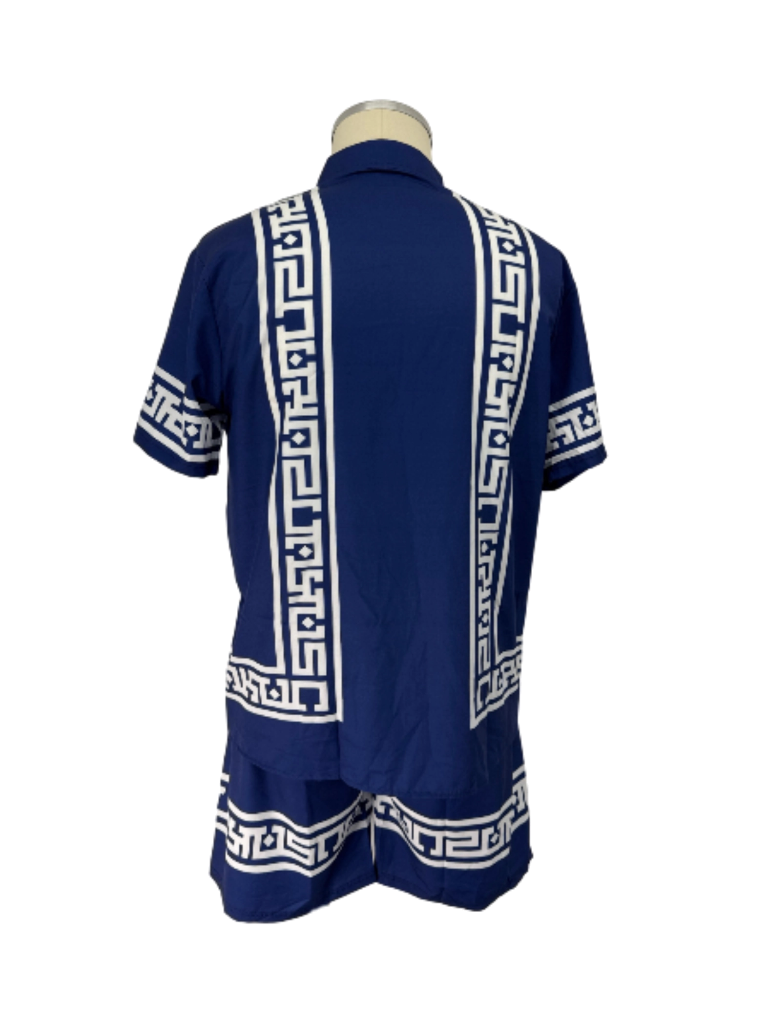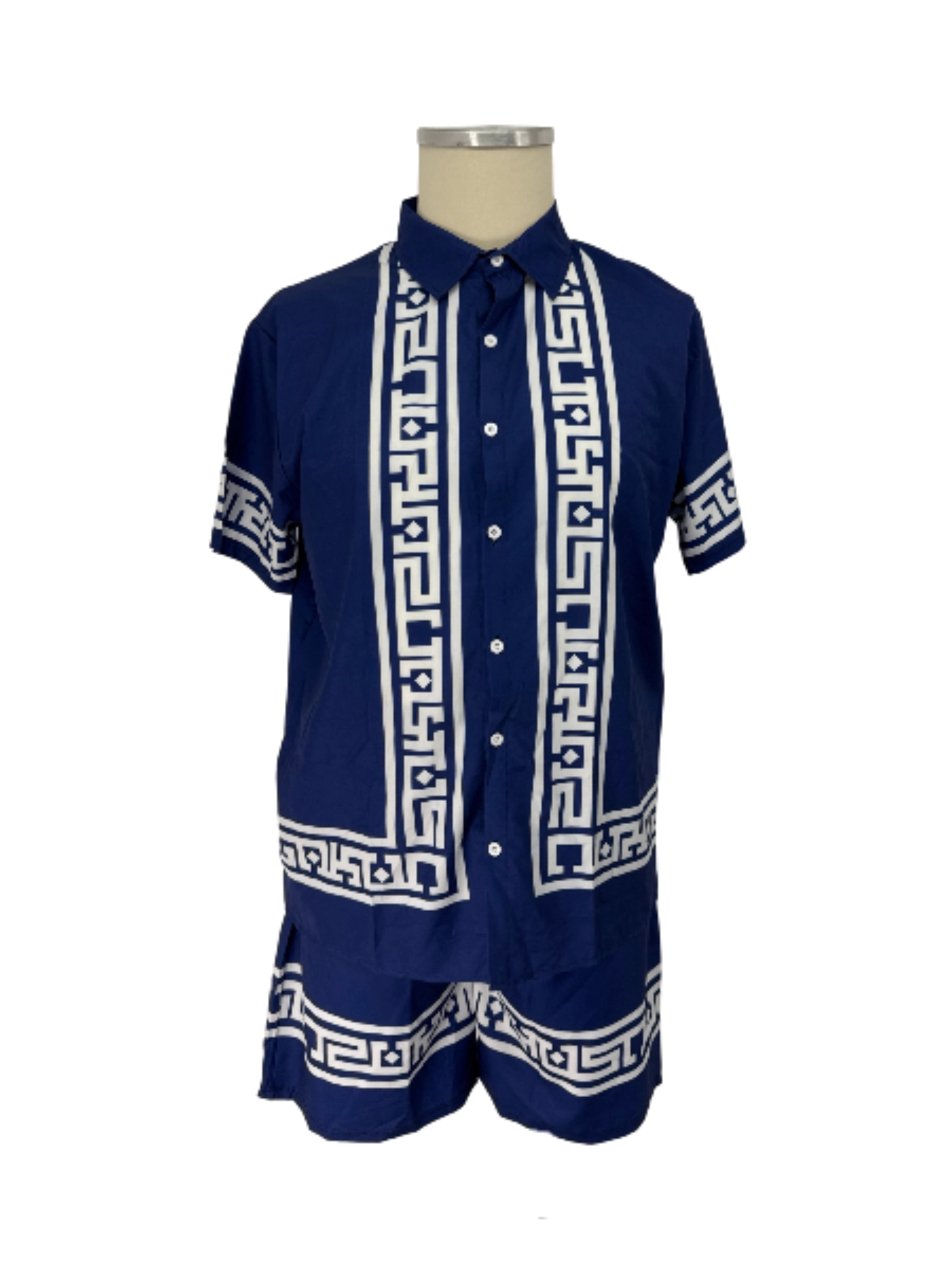 Elevate your summer style with this vibrant men's set! This two-piece ensemble features a short-sleeved shirt and matching shorts, both adorned with a bold white geometric pattern against a rich blue background. Crafted from a lightweight, breathable fabric, it's ideal for warm weather. Whether you're hitting the beach, attending a casual gathering, or simply enjoying a sunny day, this set offers a comfortable and fashionable choice. Used but in excellent condition.