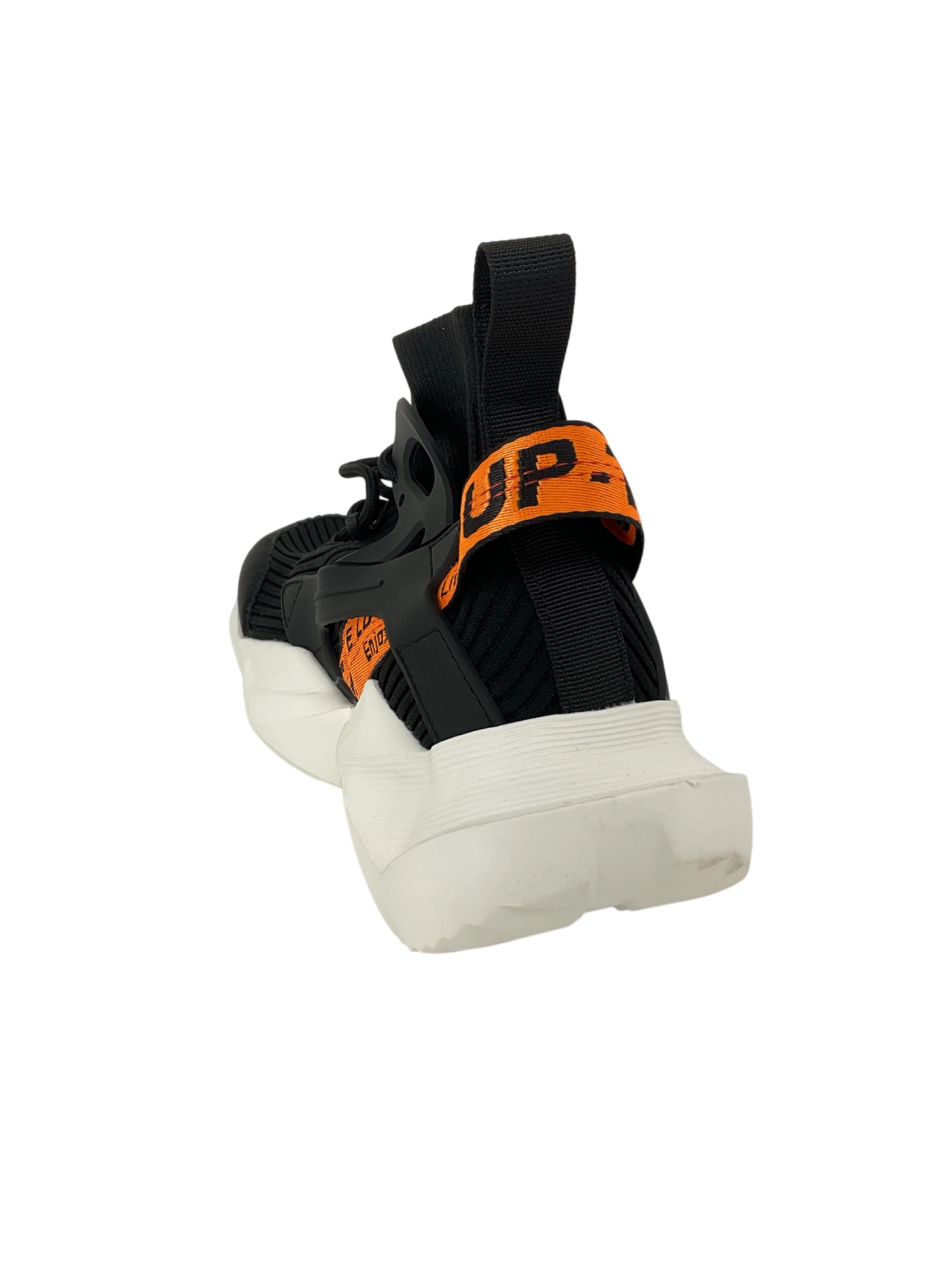 Elevate your street style with these pre-owned men's sneakers. Featuring a bold black and white design with pops of orange, these shoes offer a modern and sporty aesthetic. The chunky sole provides both comfort and a statement look, while the unique strap detail adds an edgy touch. Perfect for everyday wear, these sneakers are a versatile addition to any wardrobe. Comfortable, stylish, and ready to make a statement, these shoes are a must-have for the fashion-forward individual. Get ready to step out in style with these unique sneakers.