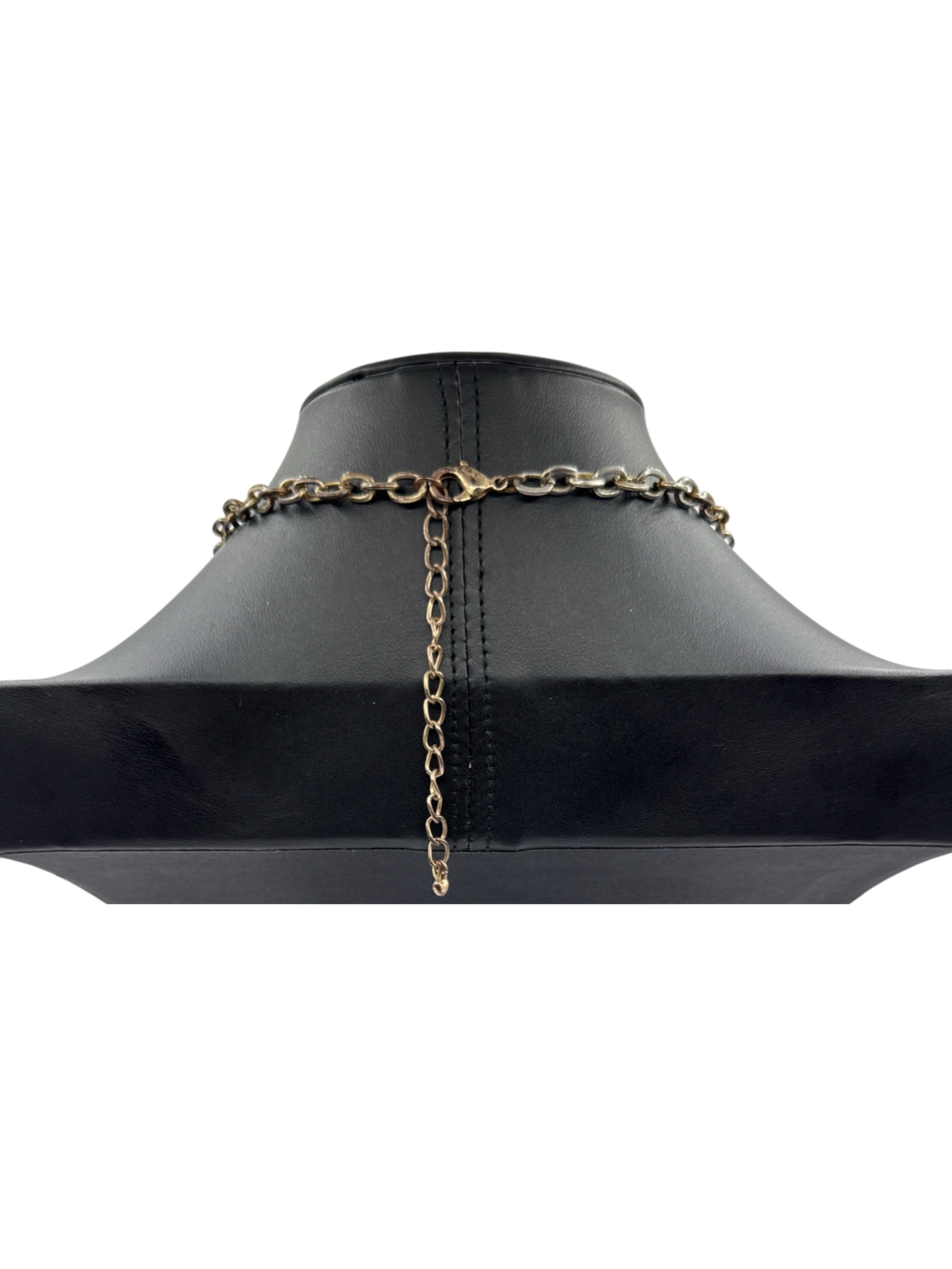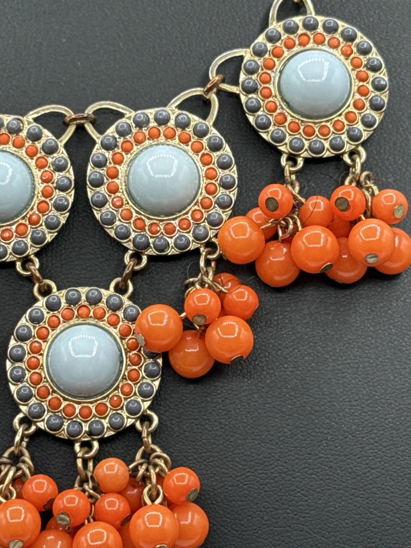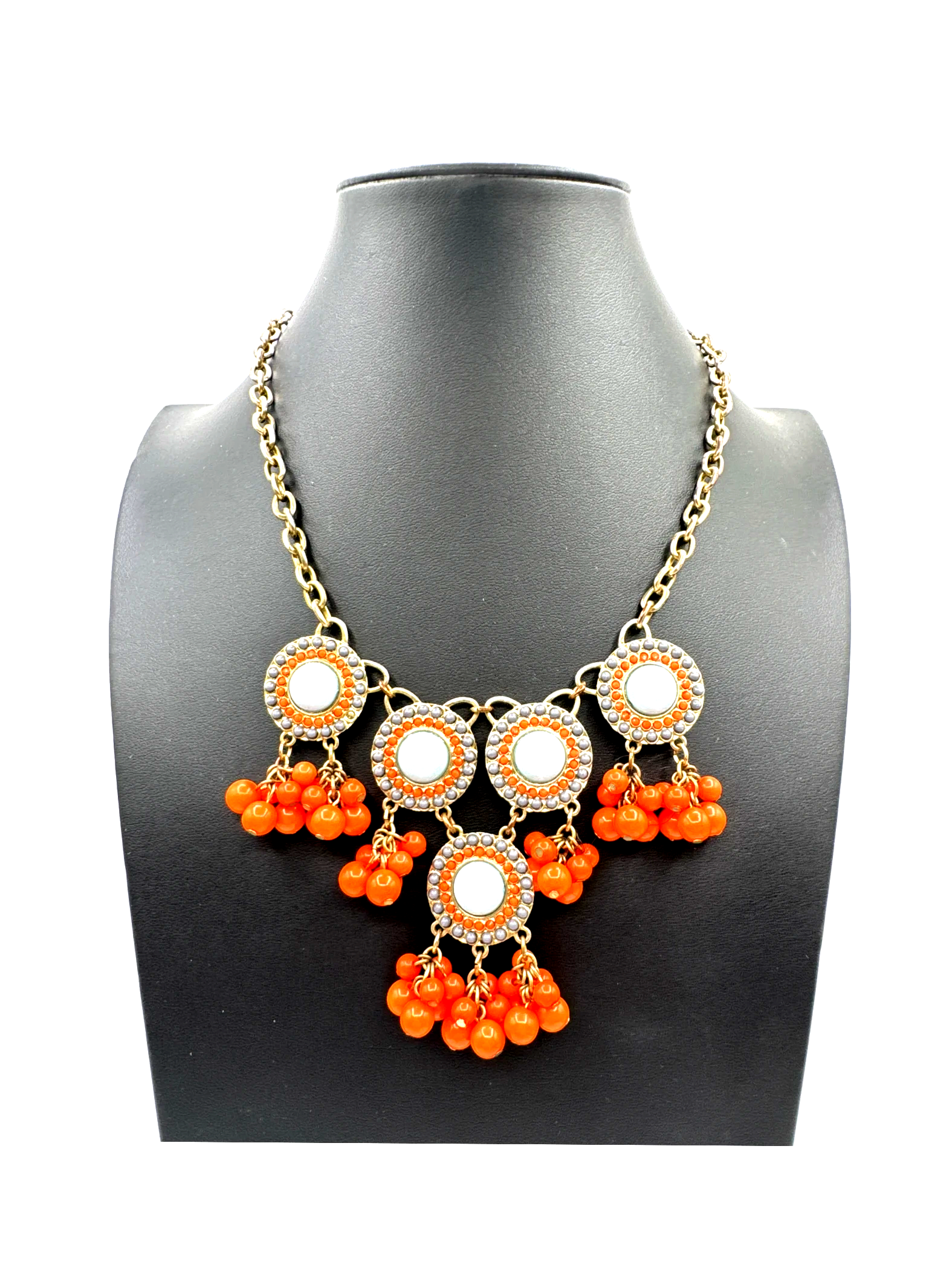 This eye-catching necklace is a perfect statement piece. With its unique design, the necklace features vibrant orange beads and a multi-colored pendant, the golden chain provides a touch of elegance. A beautiful pre-owned piece of jewelry that is ideal for adding a pop of color and personality to any outfit. Elevate your style with this one-of-a-kind necklace.