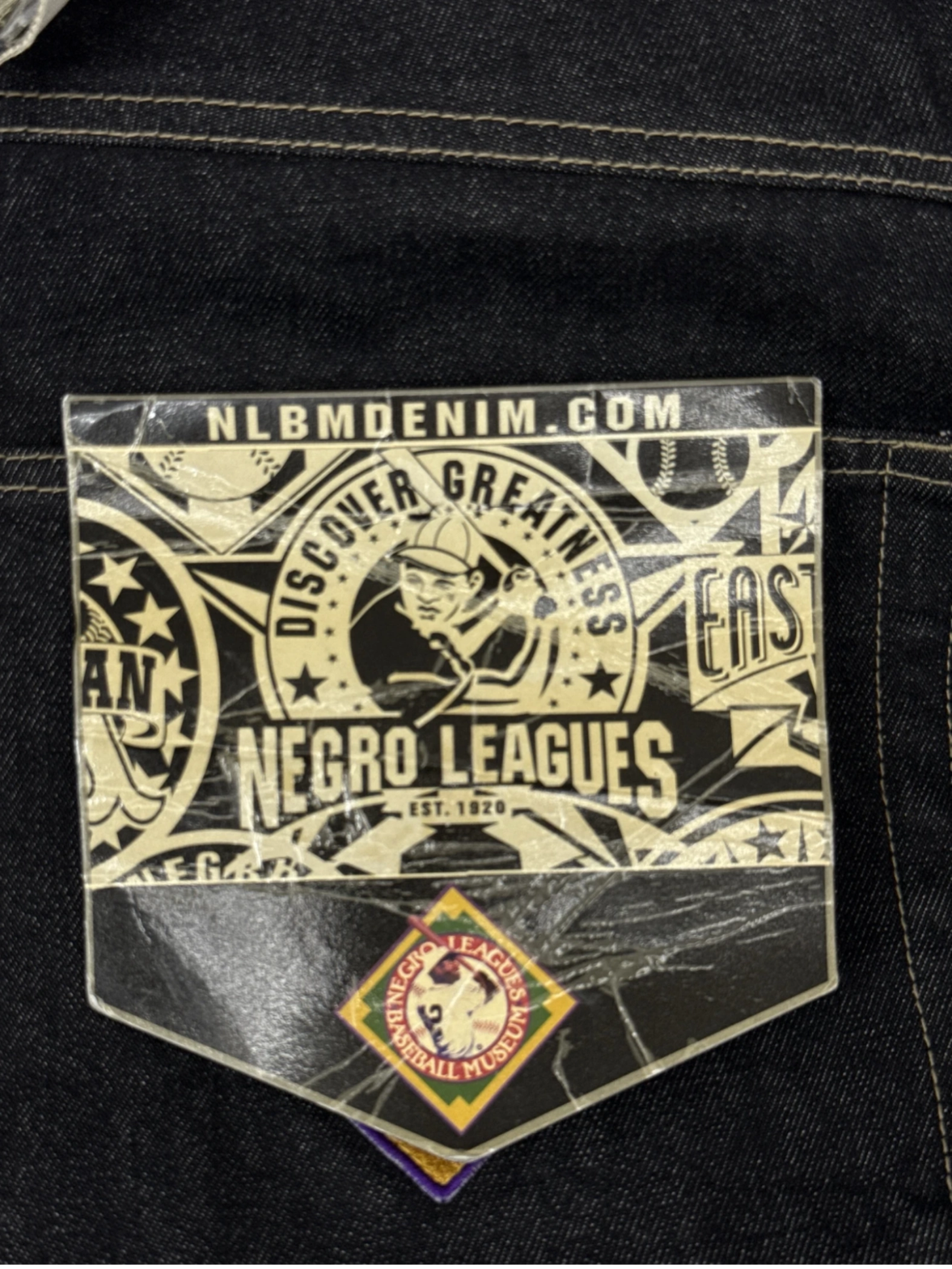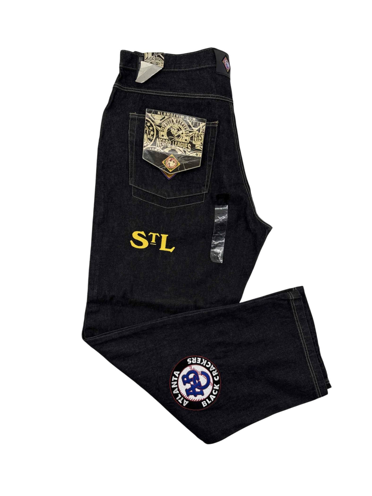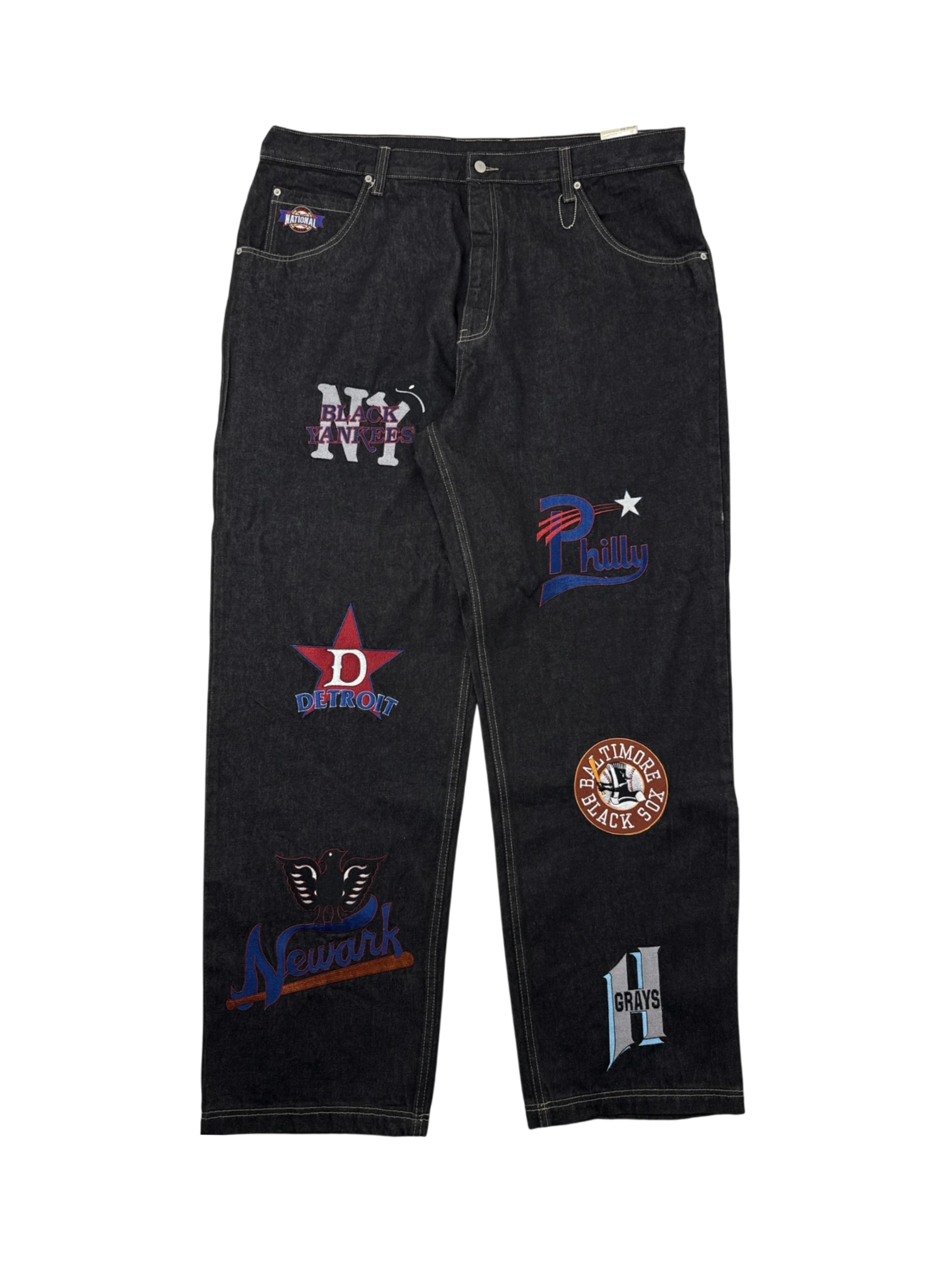 Elevate your denim game with these vintage black baseball jeans featuring embroidered patches representing Negro League teams. The relaxed fit offers comfort and style, while the dark wash and unique detailing make these jeans a standout piece. Perfect for casual outings or adding a touch of nostalgia to your wardrobe. These pre-owned jeans are a must-have for any baseball or vintage enthusiast.