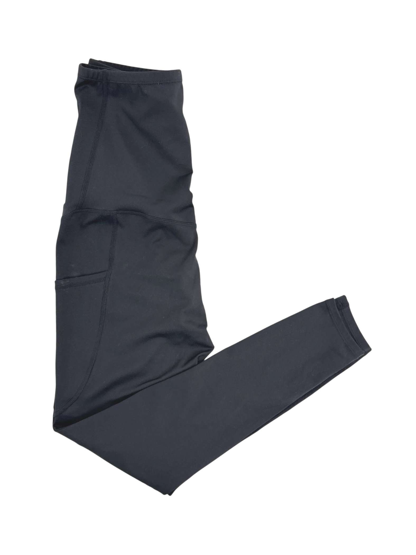 These gently used, high-waisted black active leggings offer both comfort and style. Crafted from durable polyester, these leggings feature a sleek design with convenient pockets, perfect for activewear. Ideal for workouts, yoga, or everyday wear, these versatile leggings provide a flattering fit and ultimate flexibility. The perfect addition to your activewear wardrobe. Find your perfect fit and enjoy optimal performance.