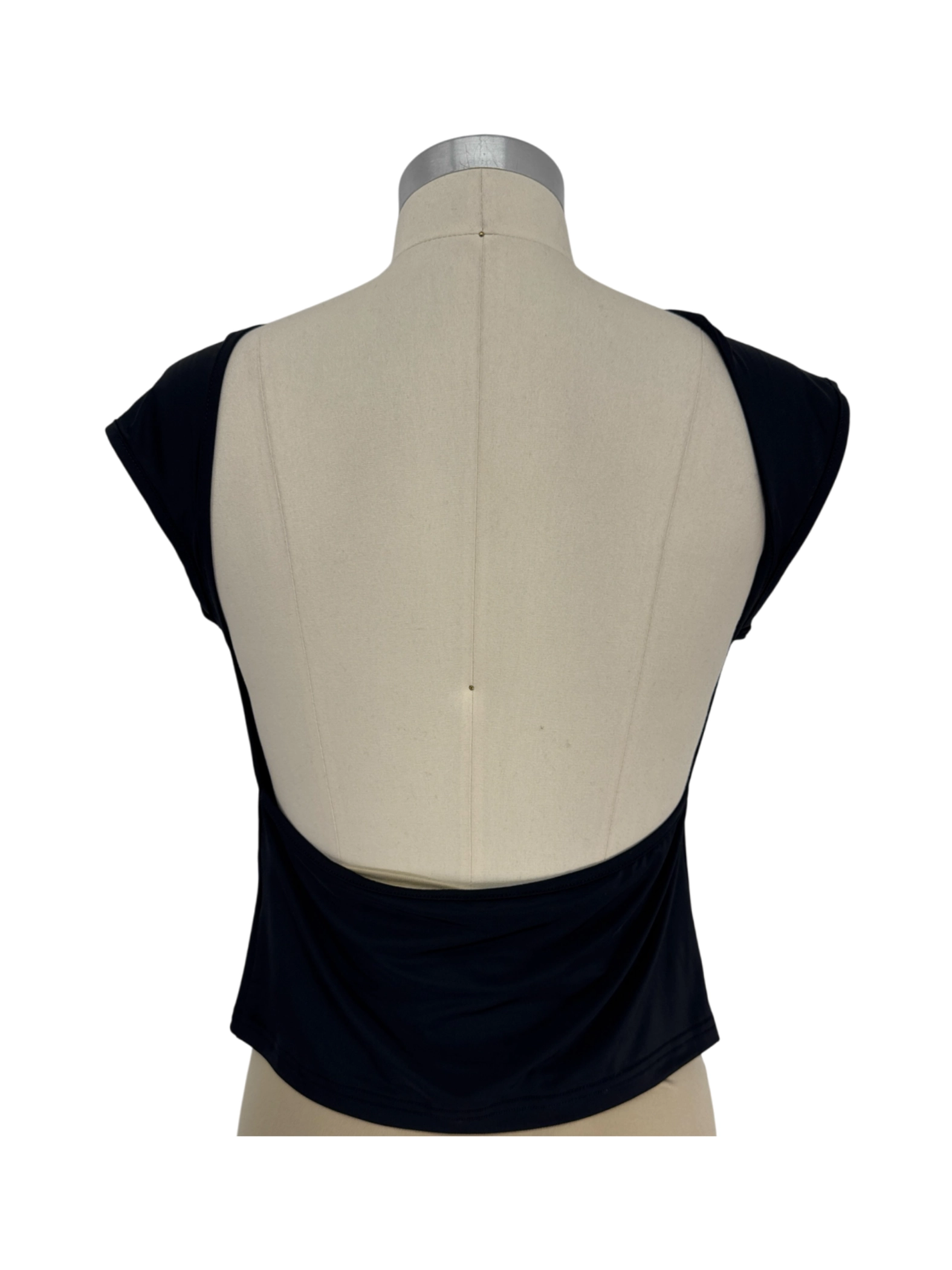 Elevate your wardrobe with this chic black blouse. This pre-owned top features a flattering scoop neck and short sleeves, perfect for warm weather. Made from a blend of recycled nylon and spandex, offering both comfort and sustainability. The sleek design and versatile color make it an ideal choice for both casual and dressier occasions. A stylish addition to any closet, providing both comfort and timeless elegance. - Elevate your wardrobe with this chic black blouse. Featuring a flattering scoop neckline and short sleeves, this top is perfect for warm weather. The sleek design, crafted from a comfortable nylon and spandex blend, makes it versatile for both casual and dressy occasions. This pre-owned blouse offers a stylish and sustainable choice for any fashion-forward woman.