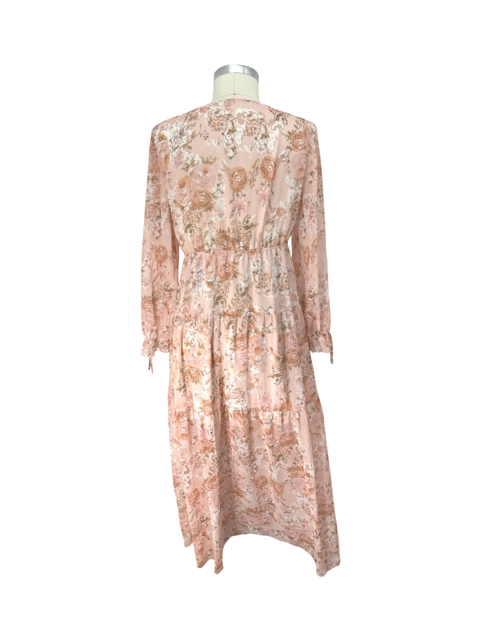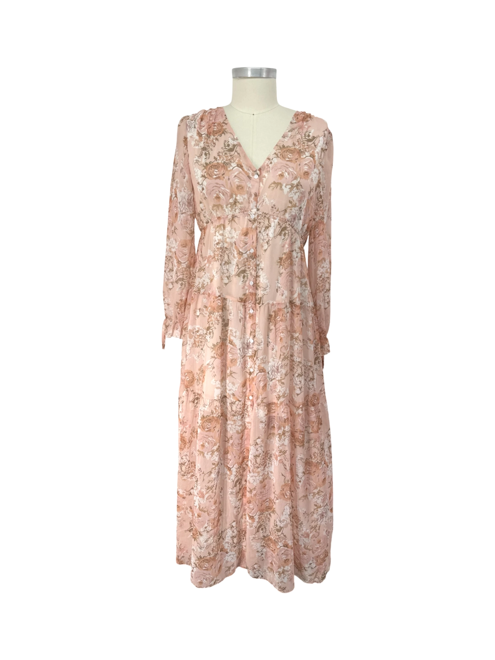 Embrace floral elegance with this pre-owned maxi dress. Featuring a delicate floral pattern, the dress boasts a flattering V-neck and long sleeves. Perfect for summer or spring, it's crafted from lightweight, flowing fabric. The A-line silhouette drapes beautifully, creating a comfortable and stylish look. Ideal for casual outings or adding a touch of romance to your wardrobe.