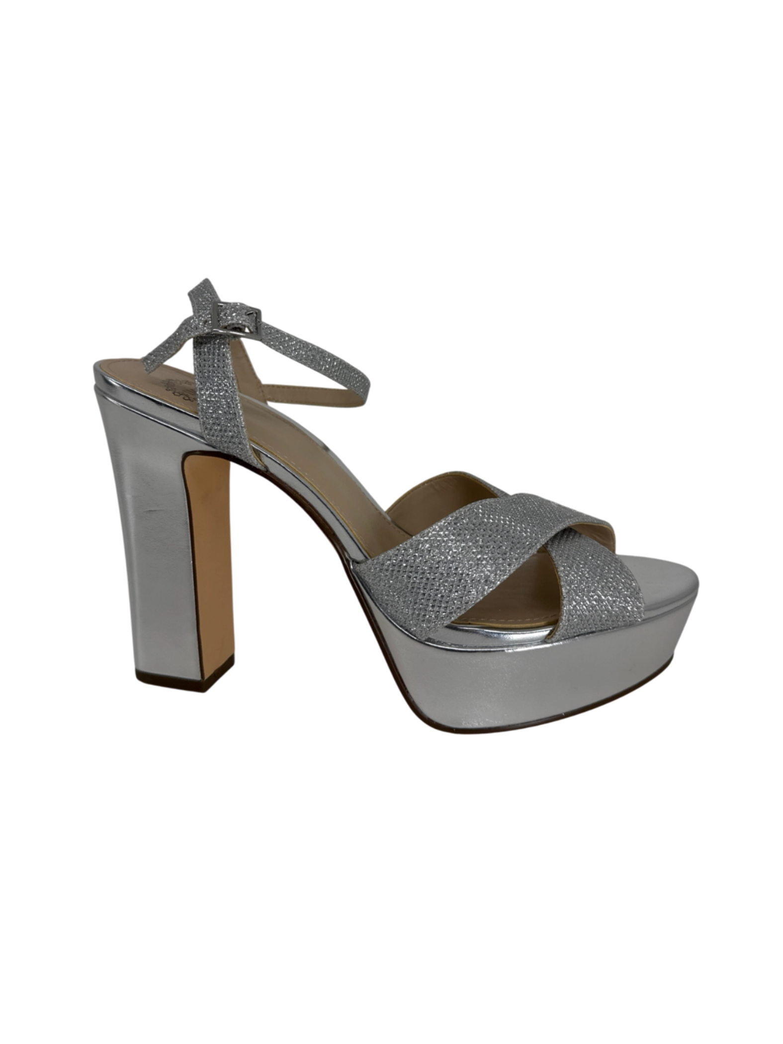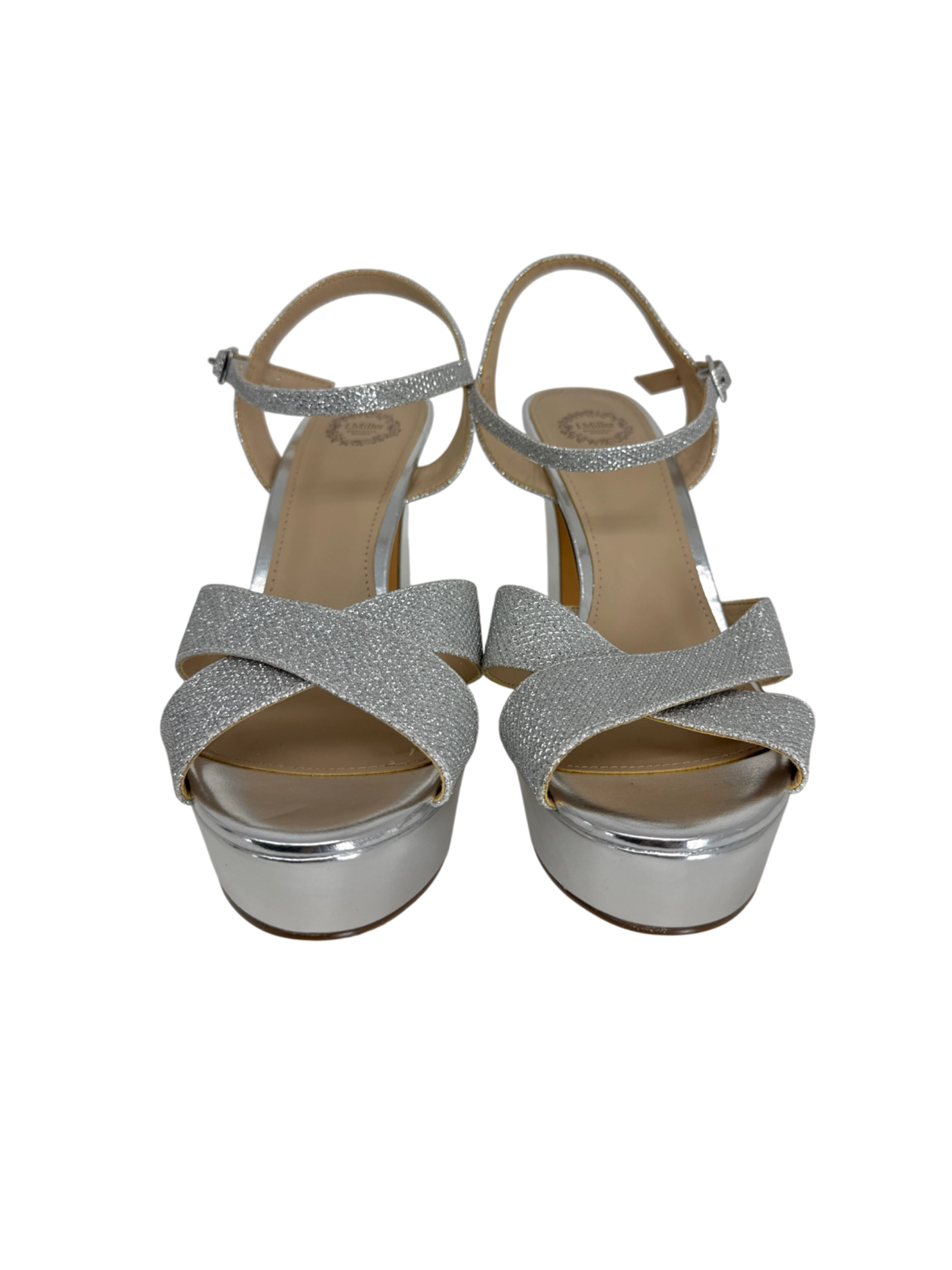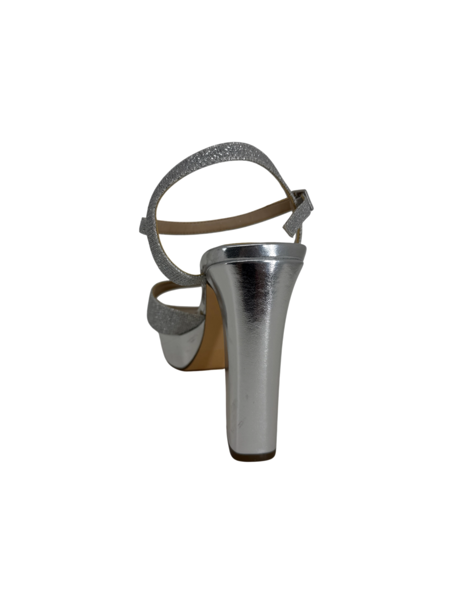 Elevate your style with these pre-owned silver platform heels. Perfect for summer evenings or special occasions, these sandals offer a touch of glamour with their sparkling finish. The sturdy platform and heel provide both style and comfort. Made with a polyester upper and fabric sole, these heels are a chic and versatile addition to any wardrobe. Get ready to turn heads.