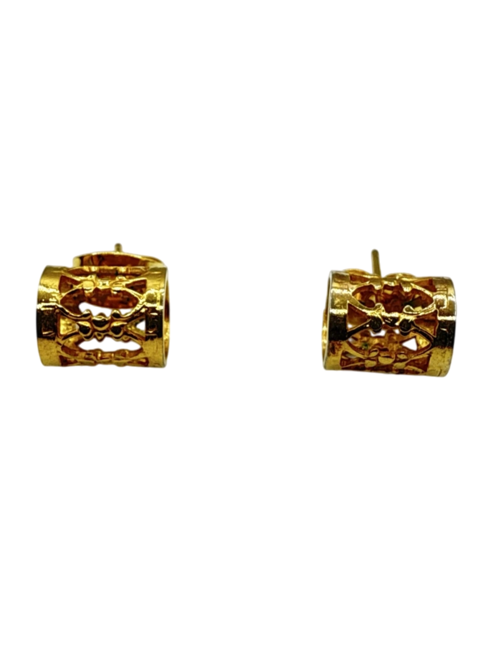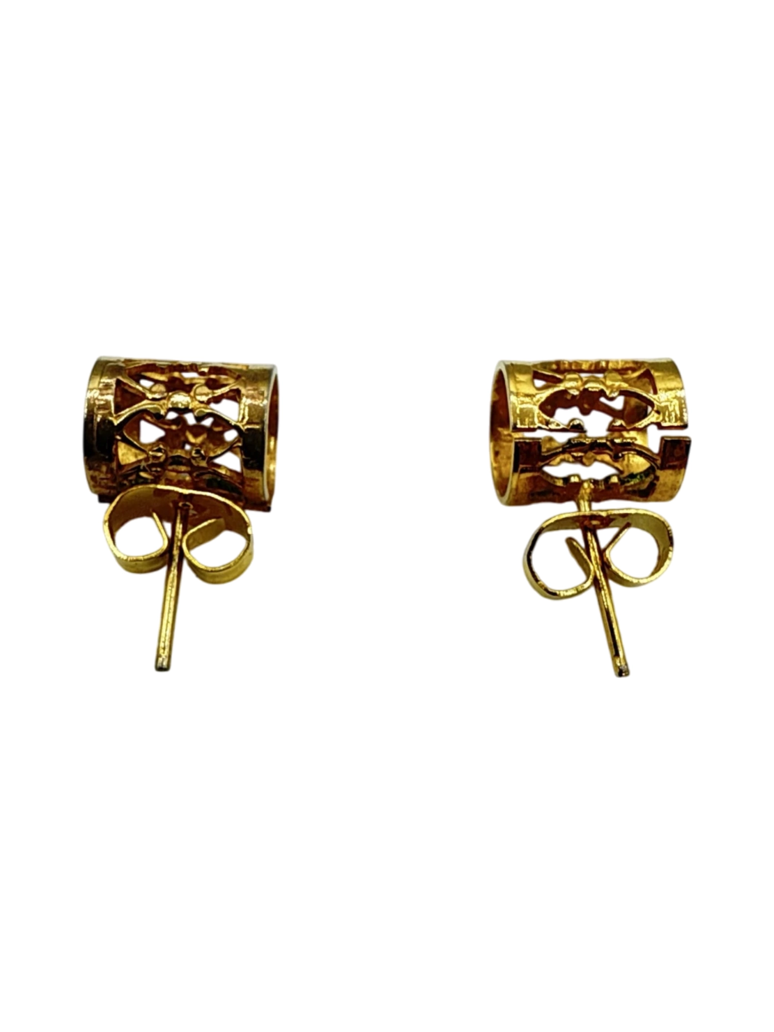 These elegant stud earrings are a timeless addition to any jewelry collection. Crafted in a warm gold tone, they feature an intricate openwork design, creating a sophisticated and eye-catching look. Perfect for everyday wear or special occasions, these earrings add a touch of luxury and style to your ensemble. A perfect gift or a great addition to your collection. - Elegant pre-owned stud earrings. These earrings feature a unique cylindrical design with intricate cut-out detailing, crafted from a shining gold tone material. A perfect accessory for any occasion, adding a touch of luxury and sophistication to your style. Lightweight and comfortable, these earrings are ideal for everyday wear or special events. A beautiful addition to any jewelry collection.