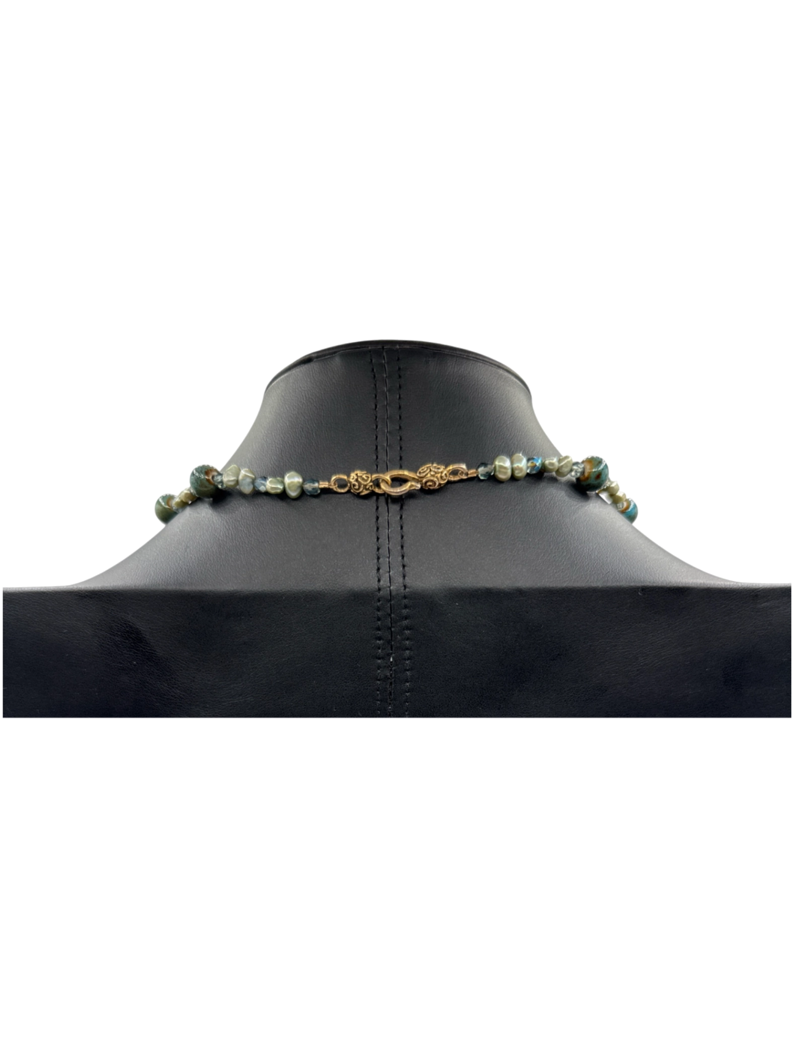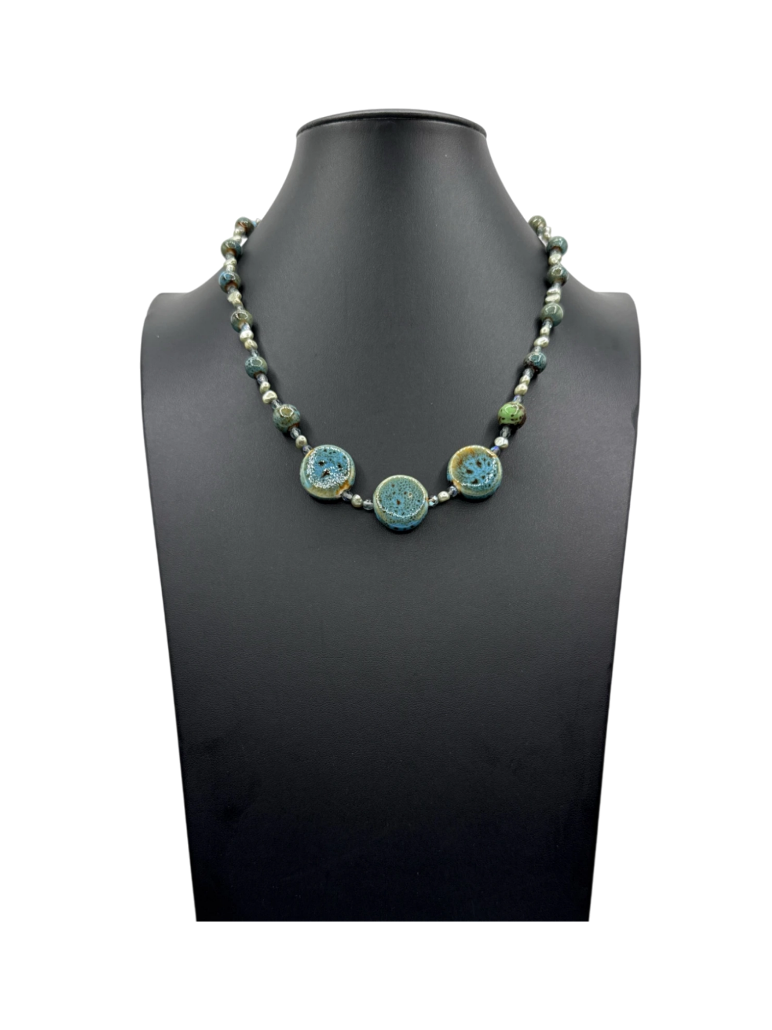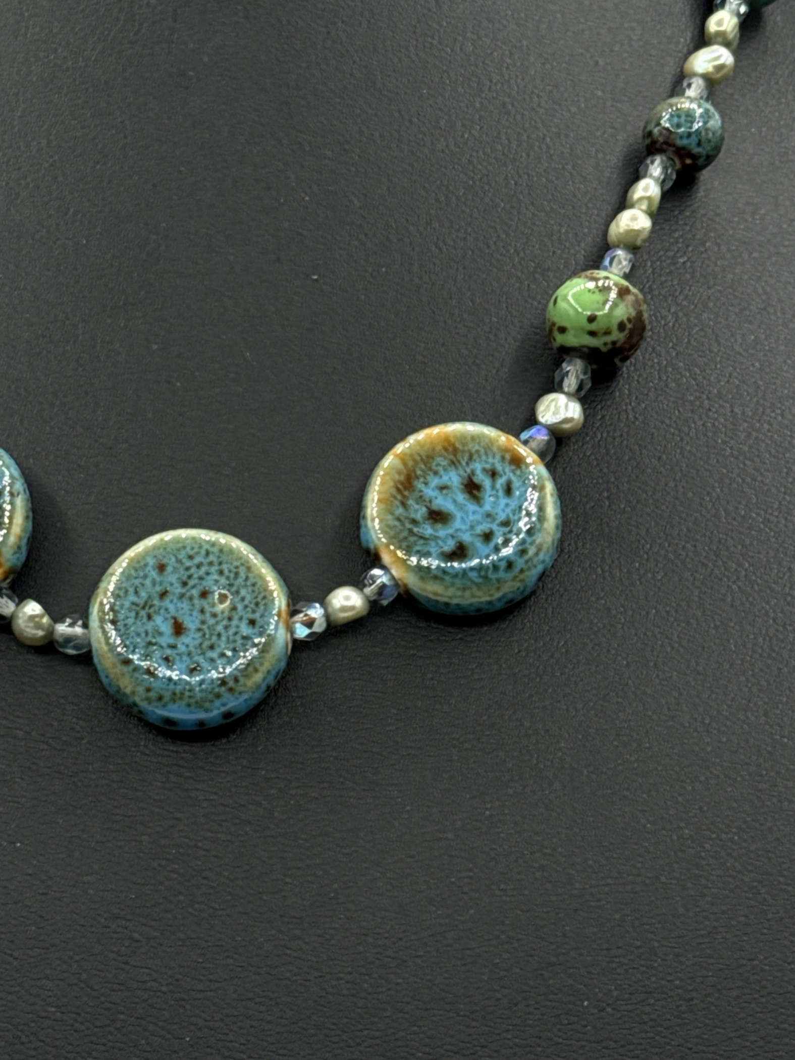 This unique, pre-owned necklace features a stunning combination of ceramic and metal beads. The choker-style design makes it a versatile accessory. The necklace showcases a beautiful array of blues and other colors. Perfect for adding a touch of artistic flair to any outfit. This necklace is a perfect piece of pre-owned jewelry and is an ideal addition to any jewelry collection.