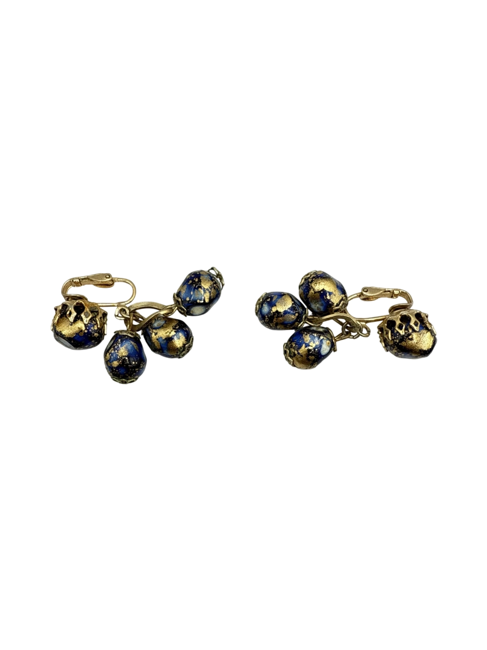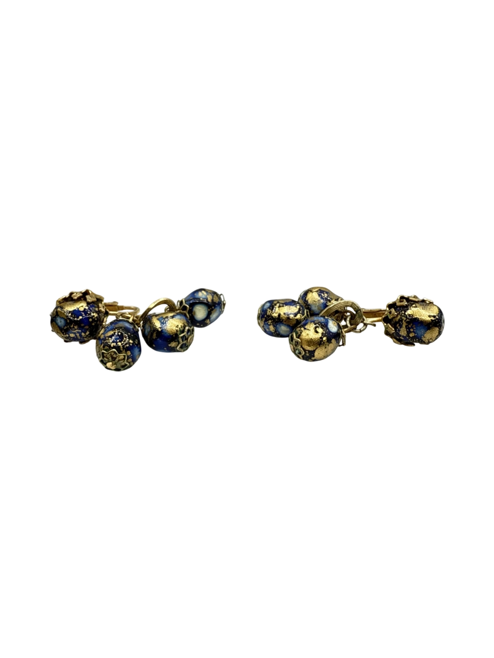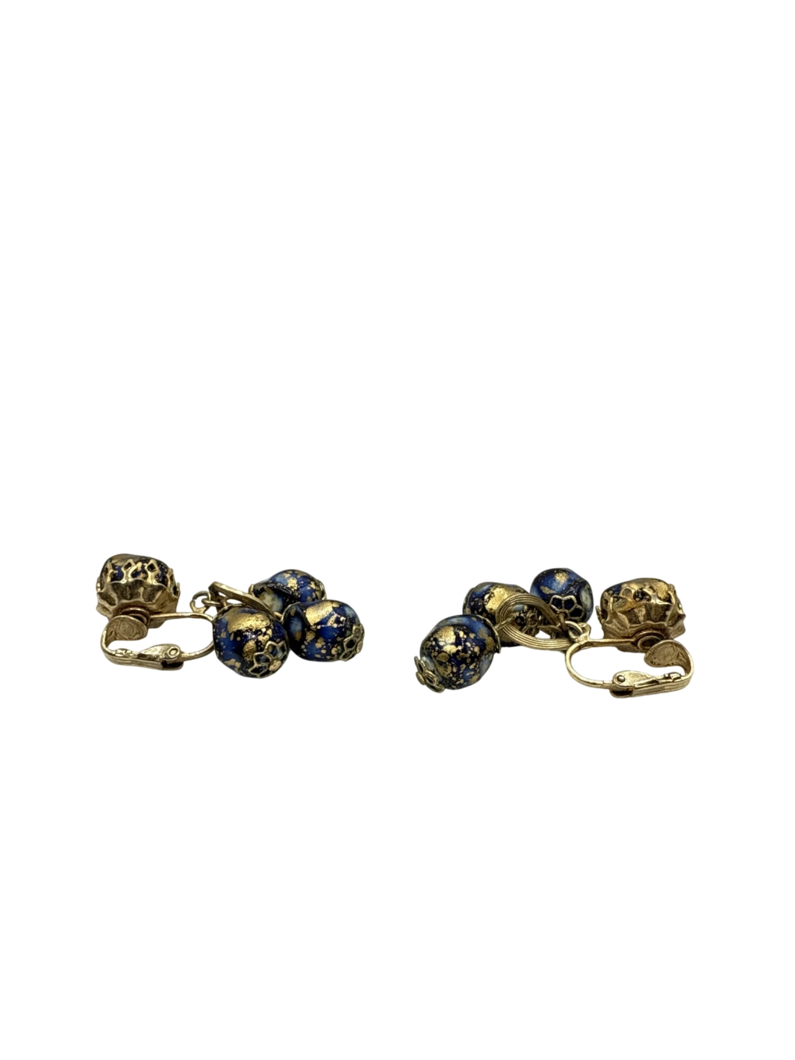 Vintage gold-tone drop earrings featuring a unique design with a combination of blue and gold accents. The earrings showcase a beautiful contrast, suitable for adding a touch of elegance and vintage charm to your look. These pre-owned earrings are a stylish accessory that can complement various outfits and add a touch of glamour for any occasion.