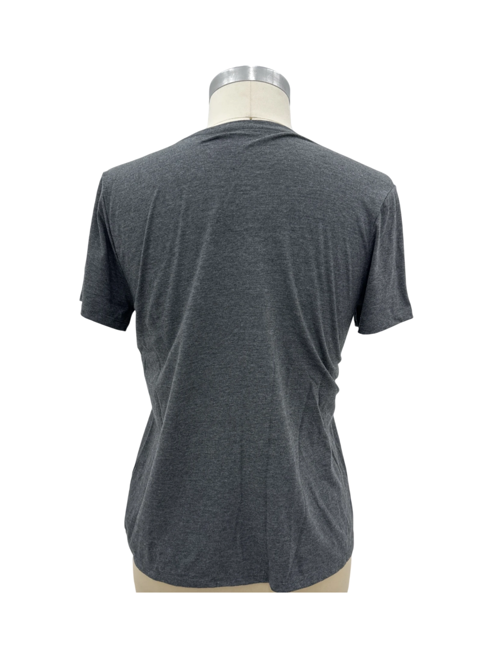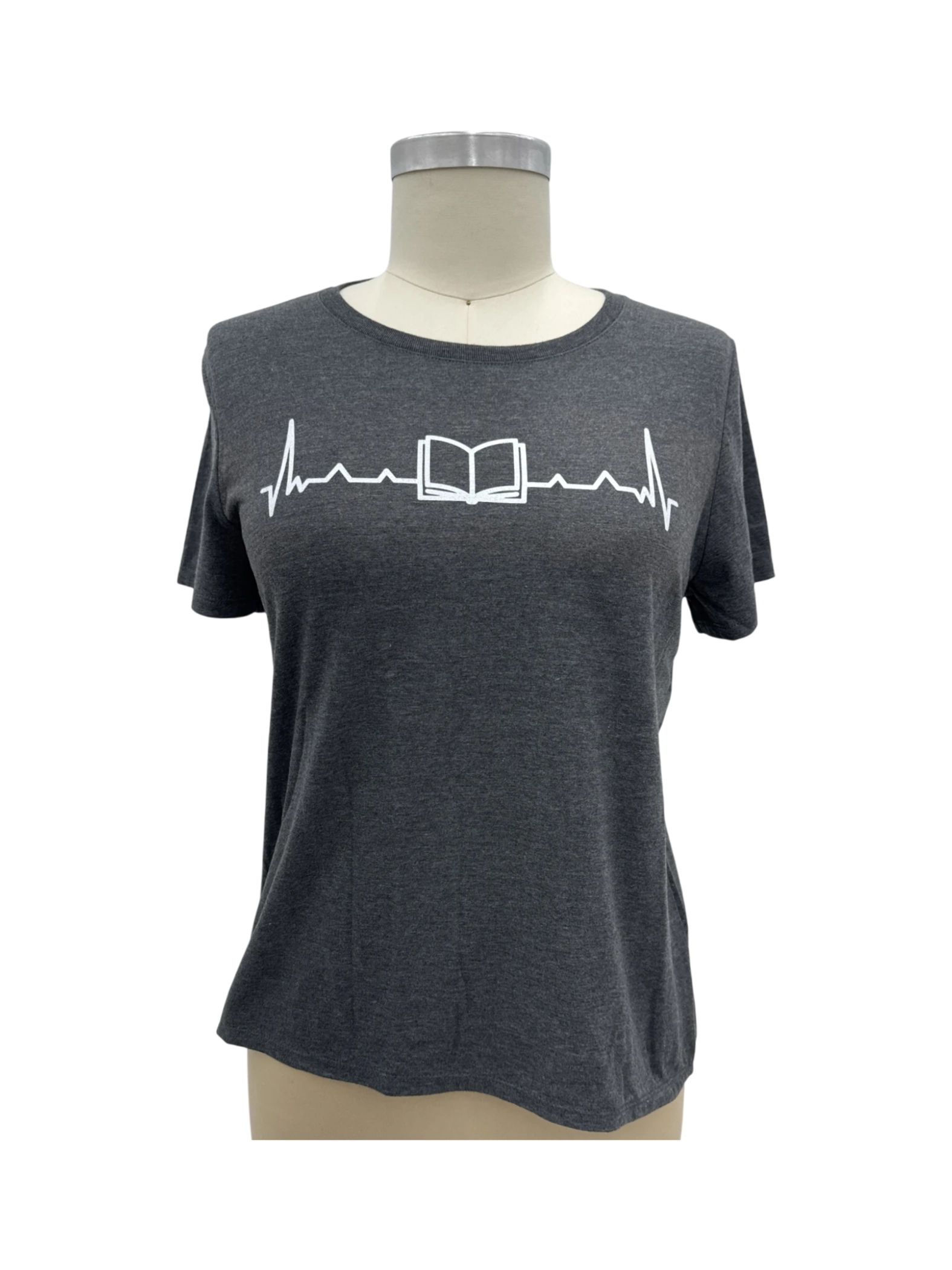 This pre-owned women's t-shirt features a unique heartbeat graphic with an open book design, perfect for book lovers. Made from a comfortable cotton and polyester blend, this tee is ideal for everyday wear. The classic crew neck and short sleeves offer a timeless look, while the gray color adds versatility to your wardrobe. Available in size L, this shirt is a great addition to any casual outfit, showcasing your passion for reading in style.