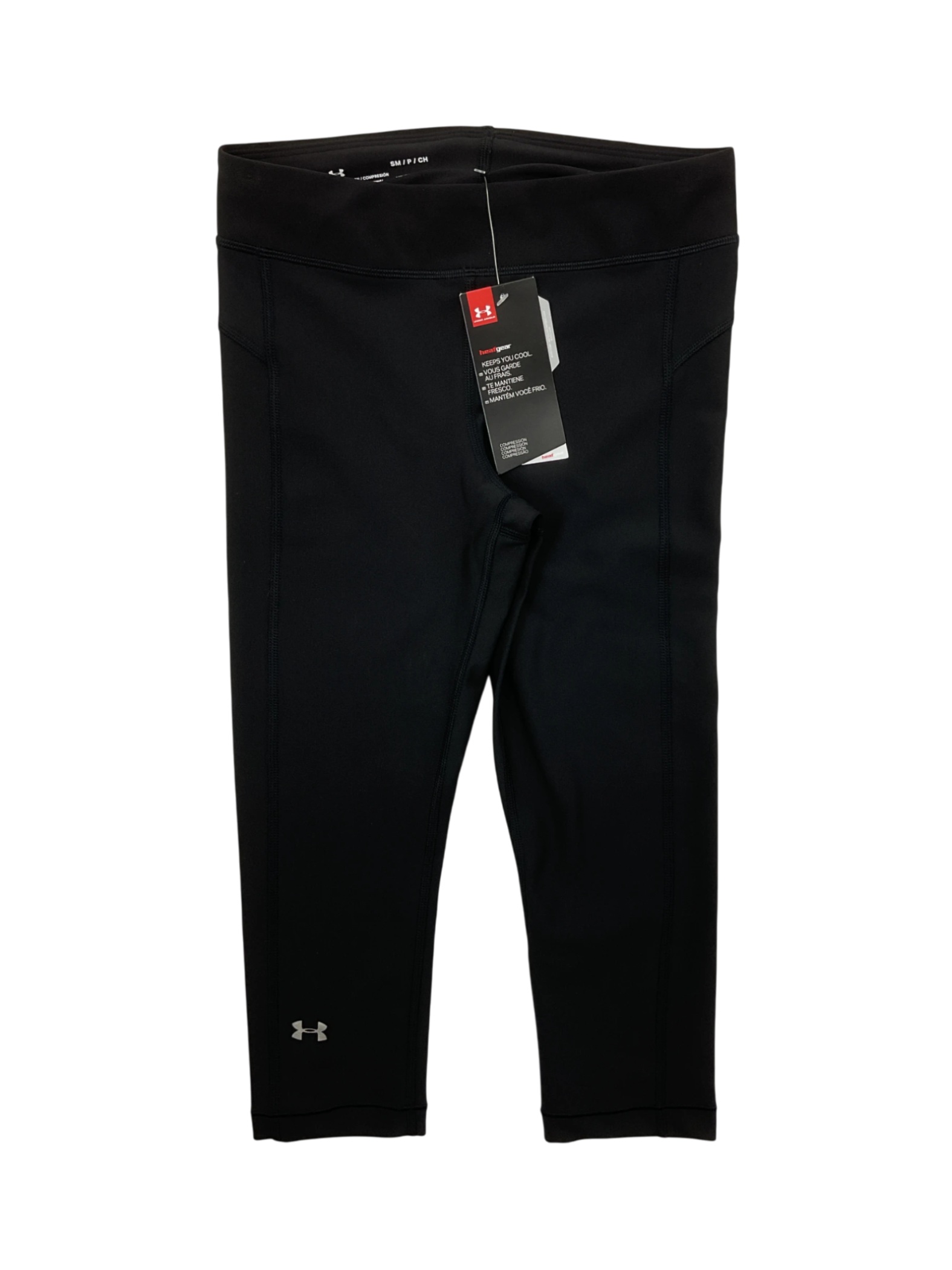 Women's black sports pants in a short boot-cut style, size small, by Under Armour.