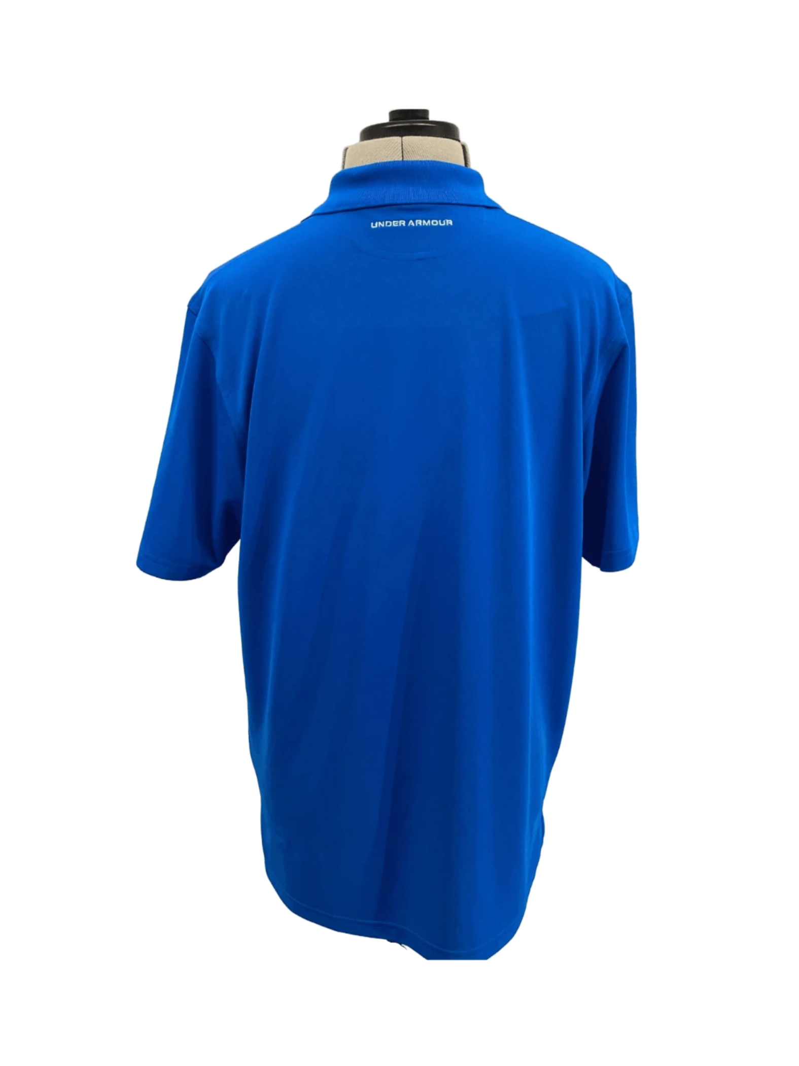 Men's Under Armour golf polo in blue with HeatGear technology, size L (large) with a loose fit and stretch material. This shirt has a small tear